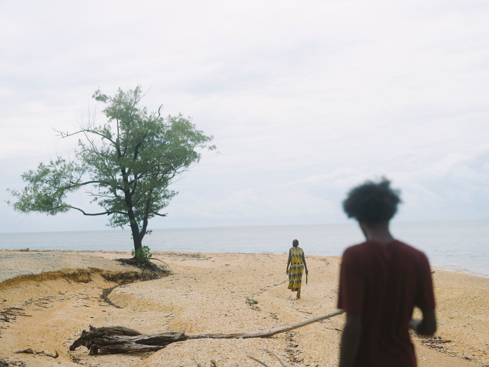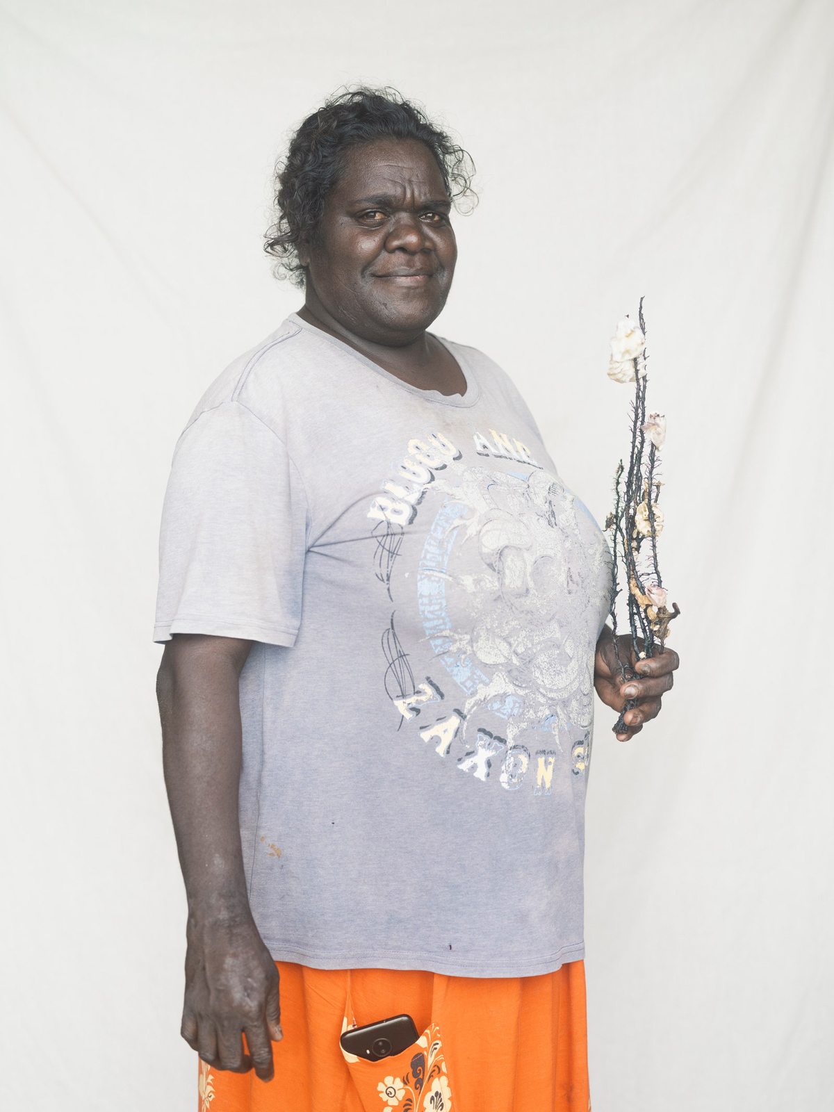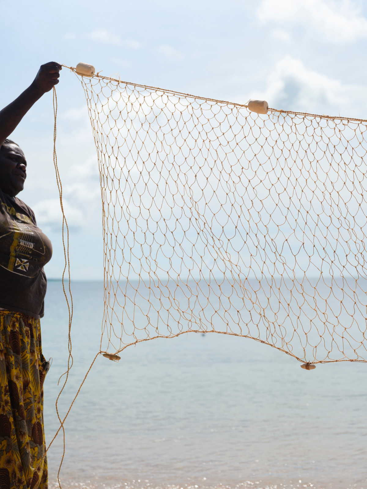 The peeling comes next. This is the preparation of the leaves into long strands that will be laid out to dry. Back at the art center I sit outside with Susan, her daughter Valda Malar, and her grandson Phllip Guyabaka (whom she tells me is always lovingly at her side) on a polymat of blue, this time with yellow flowers, the beach straight ahead of us, where we think we see a crocodile, and the ALPA shop (the only shop on the island, where cooking oil will set you back close to double what it would on the mainland) to the right a few meters away. Susan points to the spiky edges of the pandanus leaf: “Really sharp one. The snakes and critters don’t like it. I don’t know, maybe inside, maybe there’s poison. That’s why the Bamugora protects—it’s like armor.”