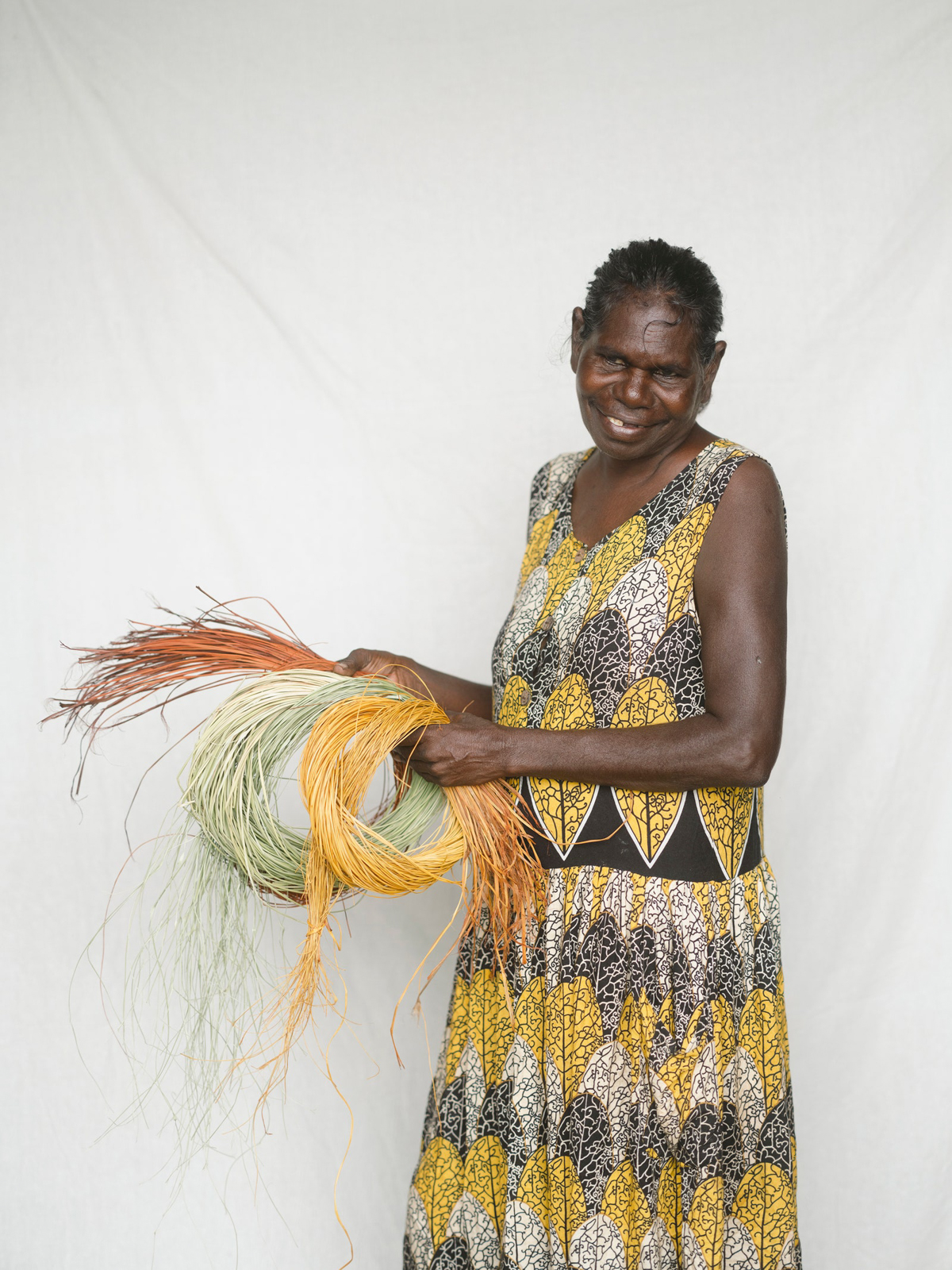 All the woven works start with the pandanus leaves (gunga)—specifically in the gathering, preparing and dying of these leaves. “Women go out and get the pandanus. Peel them, dry them, dye and start weaving whatever they feel. Authority for weaving comes from mothers, grandmothers, aunties, sisters,” says Helen Milminydjarrk.