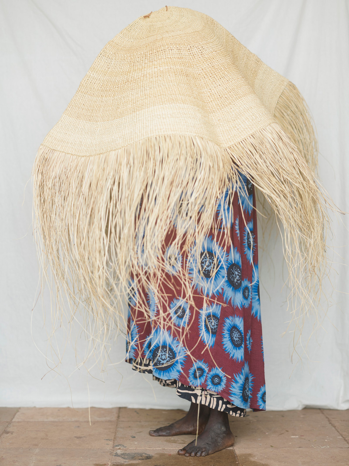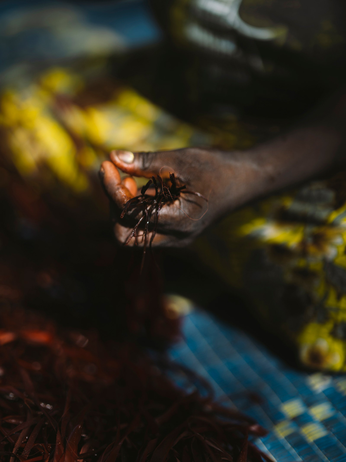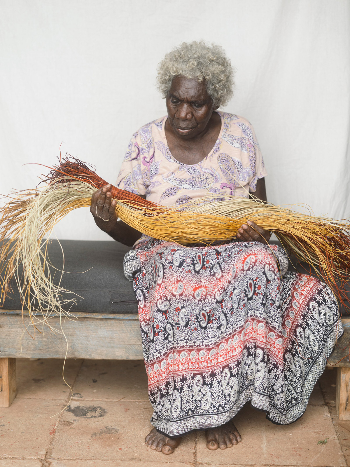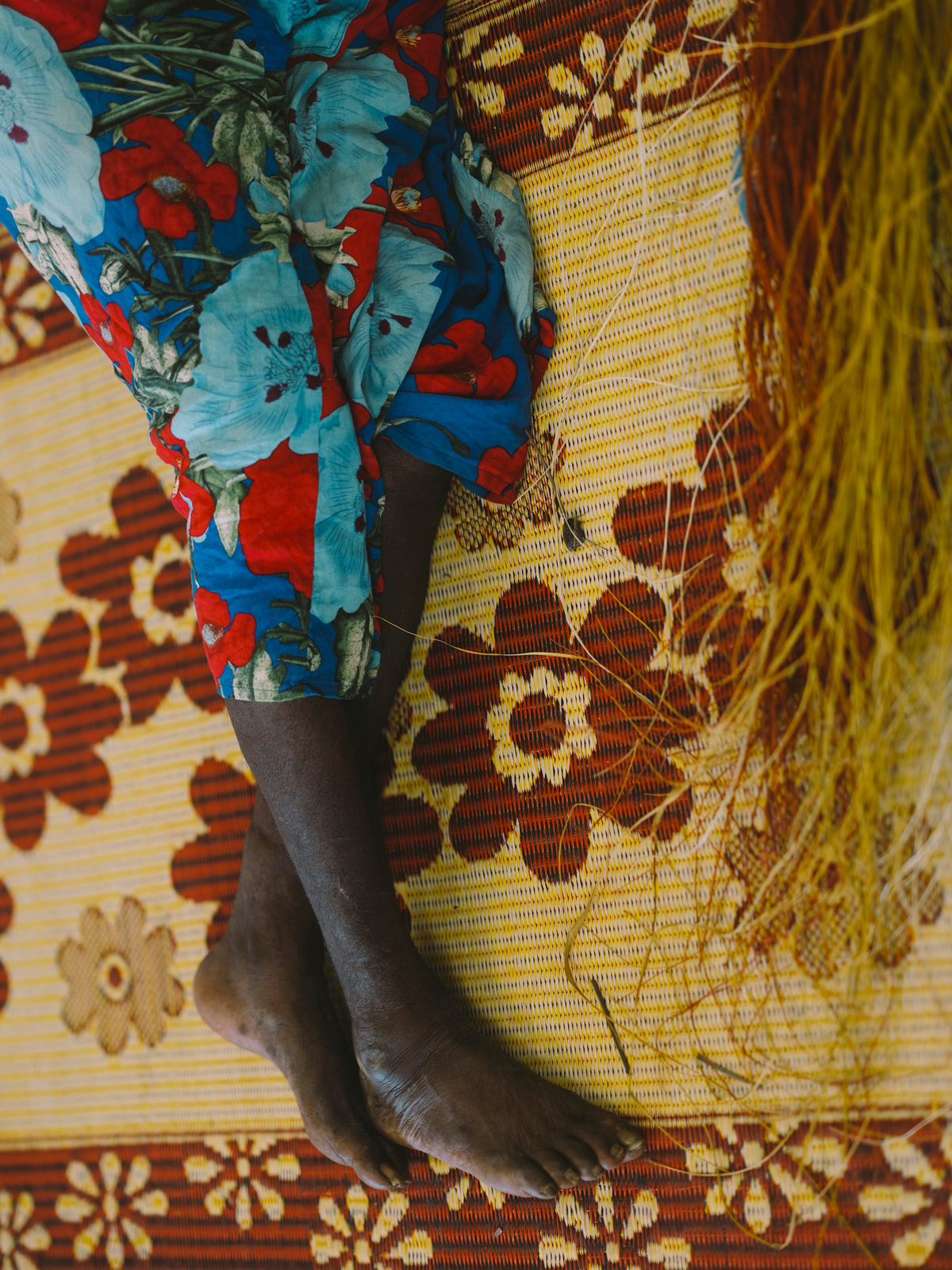 The women now sit together cross-legged inside the center and weave with dyed bunches of fiber at their sides. It’s impossible to describe the experience of witnessing the transformation of the serrated-edged pandanus leaves into colorful fiber—now being spun into baskets, bags, jewelry, and mats by the same hands—as anything but pure magic. Many cups of tea are consumed and Katrin has somehow been given the job of tea runner as she shuttles back and forth to the kitchen. I can see Abigail grinning with a wry smile as she asks for her third serving. I home in on Susan. She faces away from the group, bent over her majestic Bamugora, as she points to the edges where the fringe starts and shows me she’s tying the mat off with a different knot around the perimeter. Susan tells me of her first memory of the Bamugora, one she attributes to sparking her desire to make them: “A long time ago, we don’t know, maybe I was five years old, I saw my grandmother covering herself sleeping under the Bamugora and I climbed inside with her. I remember thinking I want to try this. That’s why I wanted to make Bamugora: my grandmother.”