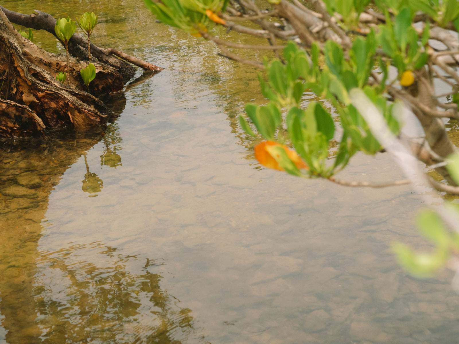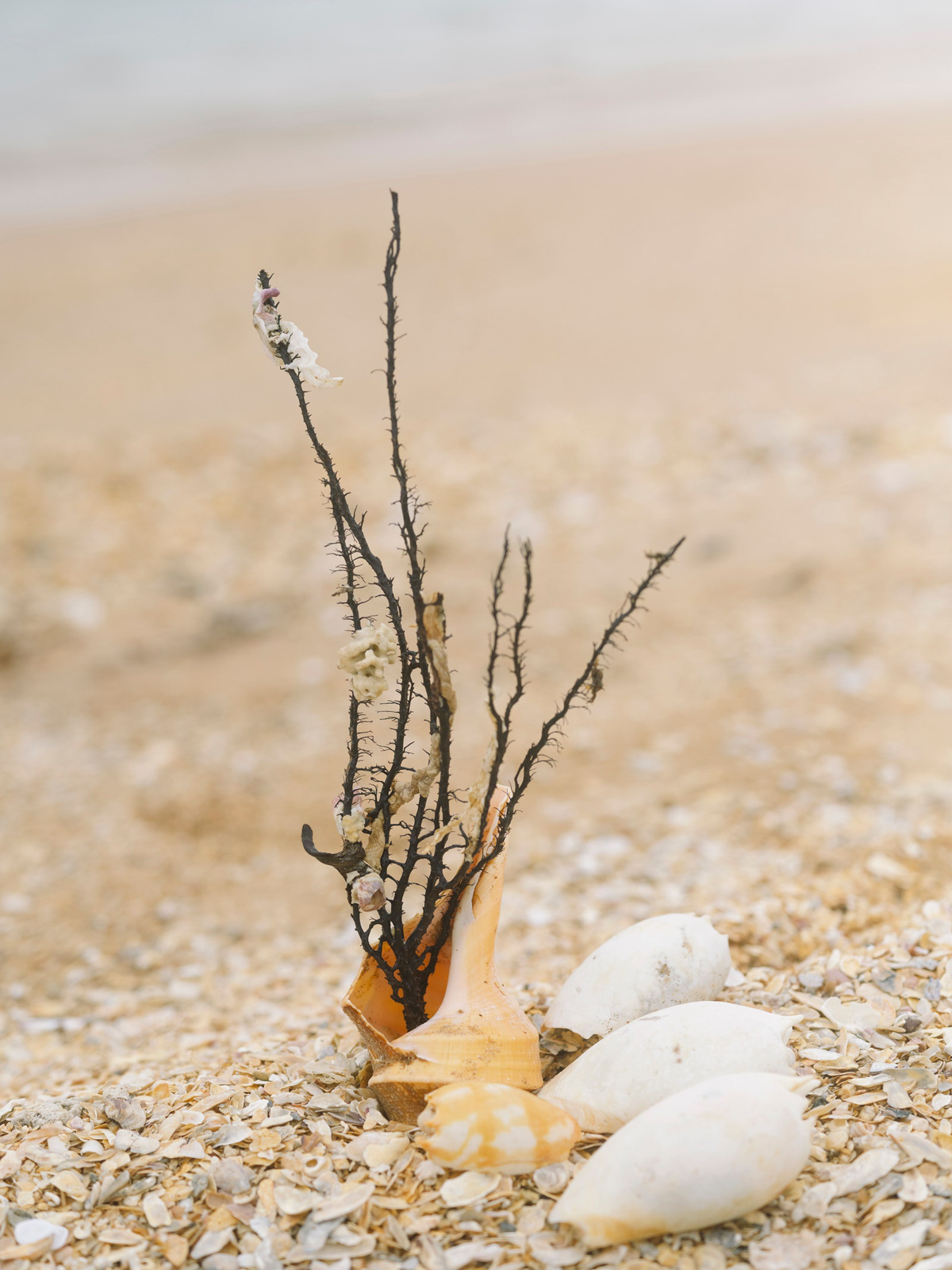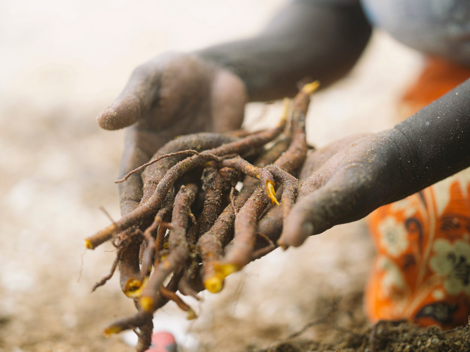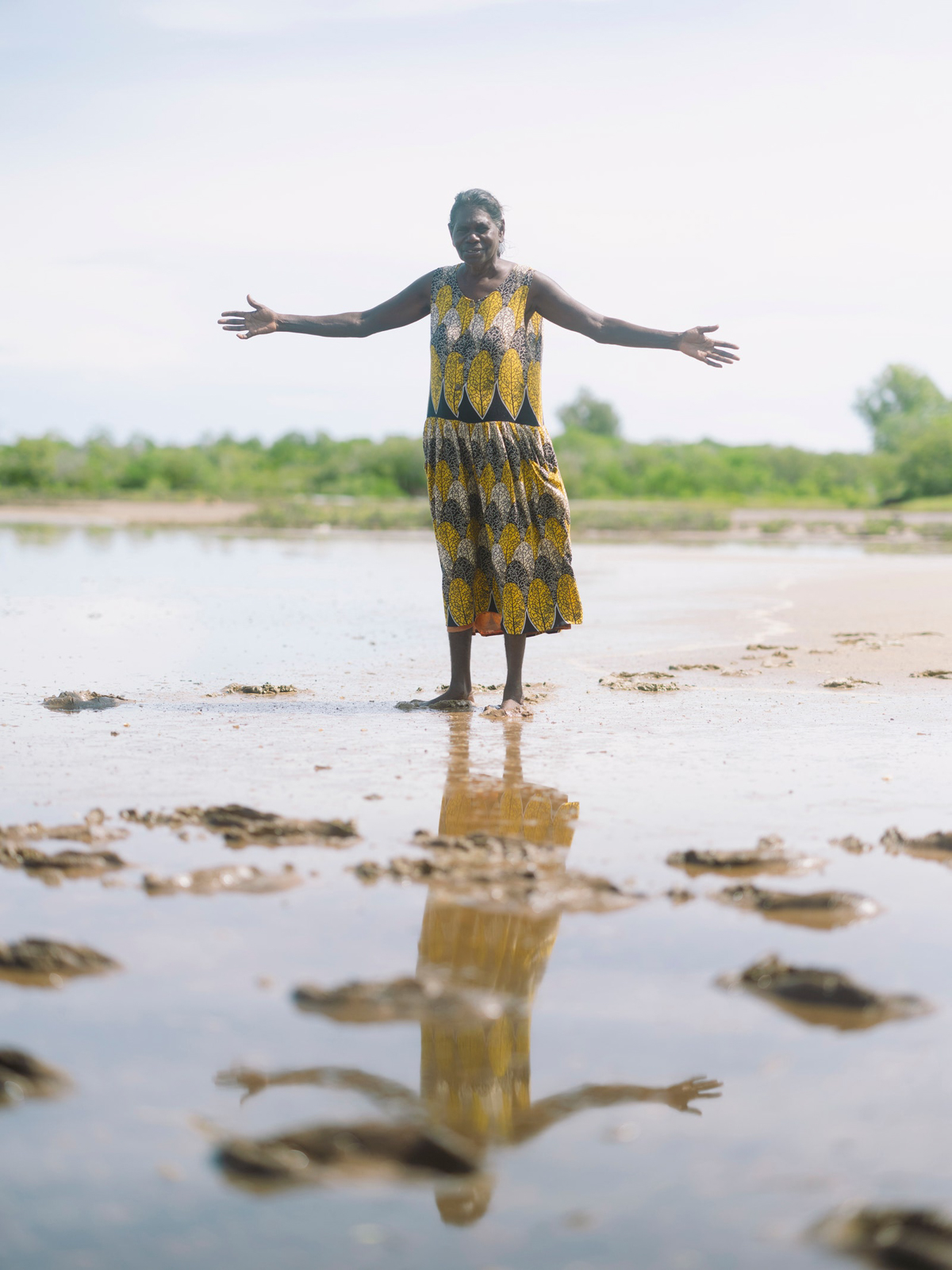 While the leaves dry, we head out on another gathering expedition, this time on the boat with both Helens, Mandy, Jack, and Max Moon, who drives the boat and runs the Djalkiri Keeping Place, a resource for artists to reference the knowledge of their ancestors. The ladies are going to a special spot to collect the roots of the Guṉinyi (Noni Tree) to make yellow dye. The way they navigate the pale turquoise waters is very much an IYKYK situation as both Helens look on, windswept, and point and nod Max intuitively to where we need to be. Helen Milminydjarrk has a cup of grapes in her floral skirt pocket which she offers everyone, Jack is perched on the hull of the small boat cross-legged, Mandy laughs at my wet bum, and Helen Ganalmirriwuy smiles and waves into the camera. It’s fun on the boat. We land on a shelly beach and jump out, Mandy and Helen Ganalmirriwuy at lightning pace, eager to collect shells. Helen Milminydjarrk takes us to the Guṉinyi Tree, machete in hand, and explains that we need the roots for the dye and that the fruit is bush medicine, good for the flu. She then kicks off her shoes to act as a seat, clears an area, and proceeds to use her machete to clear the root and eventually dig it out. Patting away giant ants, I try my best to refrain from stating the obvious again, but hear myself saying, “Geez, Helen, this is tough work!” She laughs as she continues to dig. The tree in question is the size of Helen herself. Jack does the final heave-ho to pull the root free and we see the magnificent, almost-saffron hue peeking out, like magic, from under the brown bark. Piling back into the boat, Helen Ganalmirriwuy and Mandy have also collected a stunning assortment of shells; Helen to make earrings with and Mandy to paint. We returned to the art center, nearly making a pitstop via some mangroves to catch some guya (fish) and maranydjalk (stingray). Next time, hopefully.