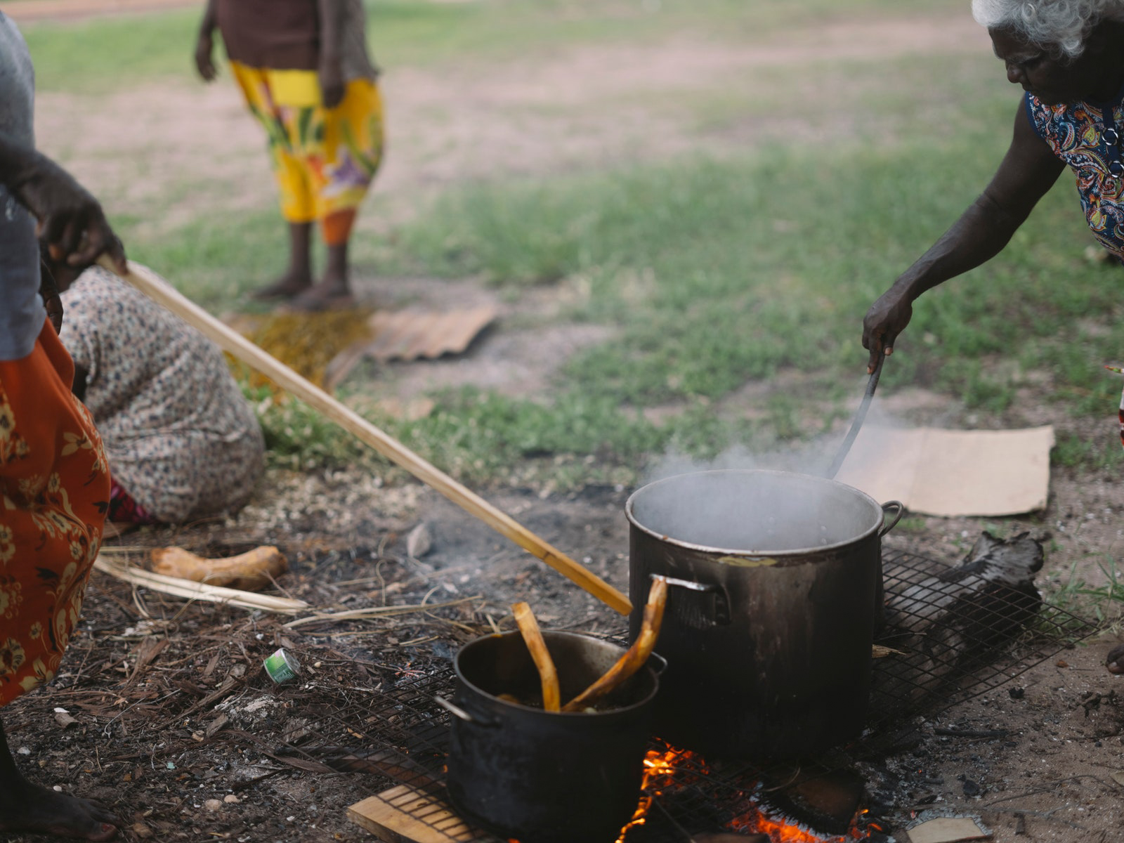 Back at the center, piles of the root, leaves, mortar and pestles, dried gunga, and tools are laid out with care in an exquisite still life. I notice Margaret Rarru looking on, inspecting it all closely while sipping on a cup of tea and giving instructions. Rarru, 83, a master weaver and respected elder, pioneered and developed a black dye (called Mol) which she alone can grant permission to use. She tells me via Jack, who interprets, that she learnt weaving from her mother and grandmother (Rarru paints as well), starting at eight or nine years old. The black dilly bag by Rarru wouldn’t be out of place on any runway in Paris; it’s chic as hell and the waiting list is akin to a limited-edition Birkin. The chopped up root, dried gunga, water, and I-don’t-exactly-know-what-else is then carried over by Sabrina and heated over a fire in a big pot, maybe for an hour. This definitely feels like another IYKYK situation. What I do know is that like every stage in this journey, the nuance and artistry revealed is knowledge passed down through generations and generations and generations…and so on and so on. The urgency and absolute necessity of ensuring this passing-on continues was evident in every single conversation I had with both young and old.