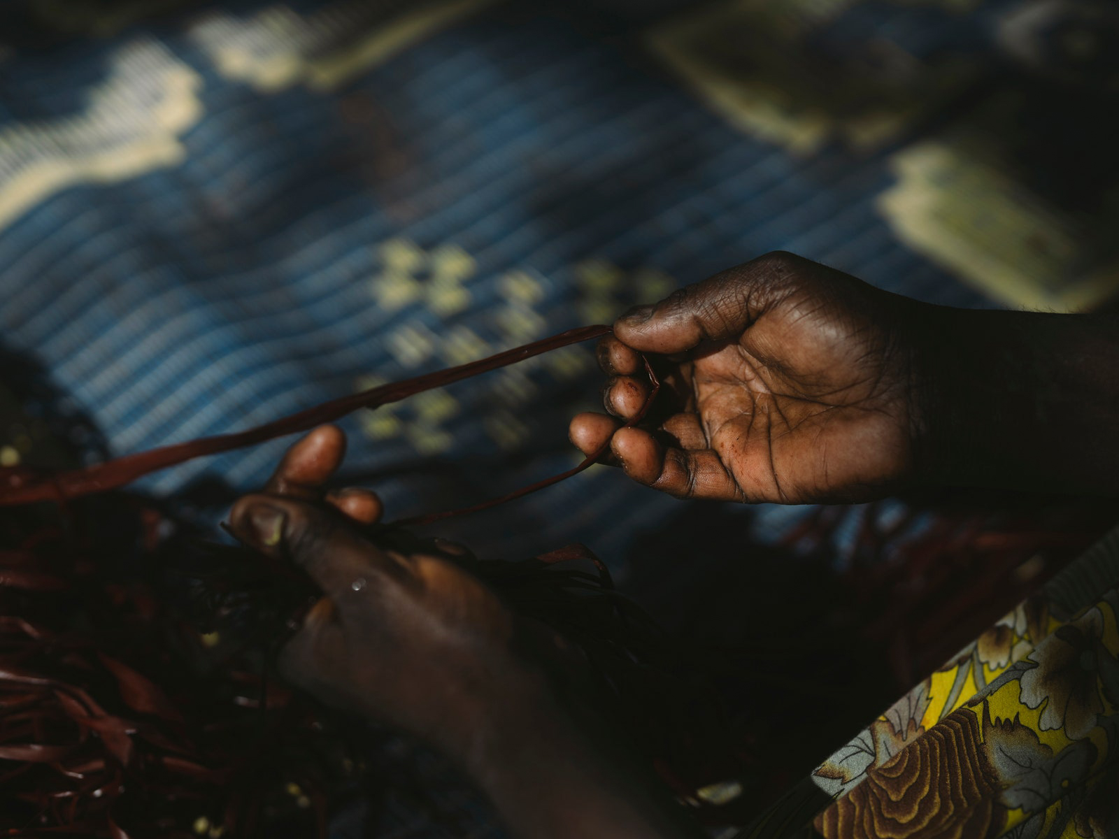 First, Susan folds the leaf and runs her fingers downwards away from herself, splitting the serrated edges and pulling them aside, creating long strands of about a centimeter or two in width and at least a meter in length, if not longer. Then, by some sort of alchemy, she splits the leaf and peels it into finer strips, making it look effortless in the way only a true master could. After that, she finishes the strips into equal width, holds them up towards me, and says, “See? Touch it.” The spiky, tough gunga leaves have been transformed into silky soft threads, like fibers ready to be dried and dyed.