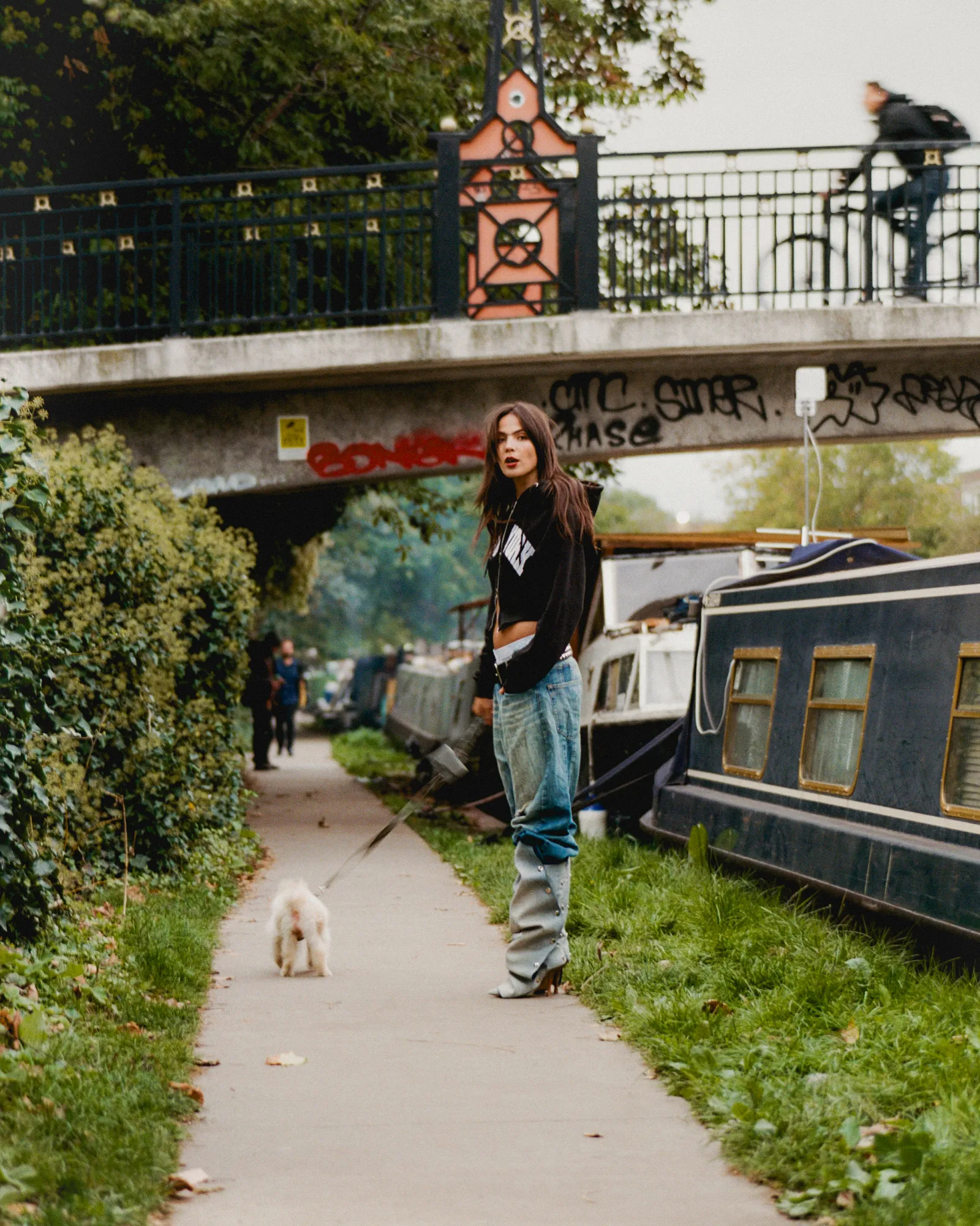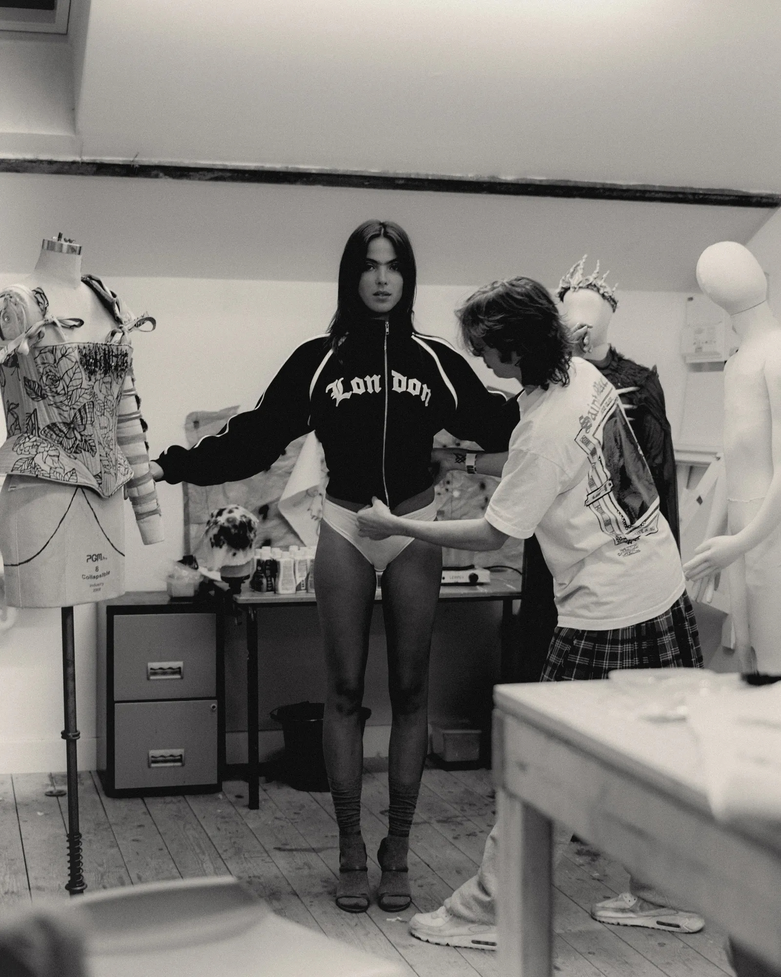 A few Instagram posts later, and word had spread: his one-of-a-kind, highly labor-intensive pieces were stocked by Café Forgot, and a throng of downtown It-girls quickly slid into his DMs asking to acquire their own. From there, the momentum continued. He recently created a custom “Utopia” corset hoodie for Travis Scott, while musicians from Charli XCX to Kim Petras to Courtney Love bought pieces last year after discovering him online. “When a boxer steps out of the ring and they get given that satin robe—I hope that’s what these are like for the pop girlies,” he says. “It’s a dream come true to have people I admire so much wearing them, and I don’t take it for granted. I’m very grateful to literally everyone who’s bought one, and has allowed me to spend this time supported by that financially to keep making them.”