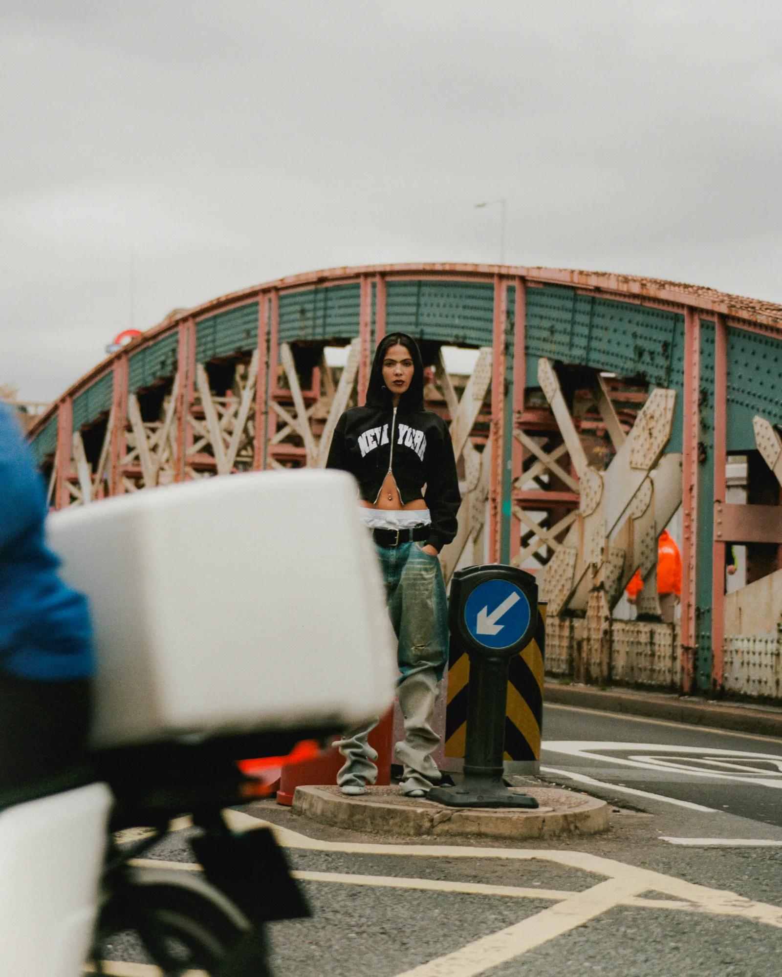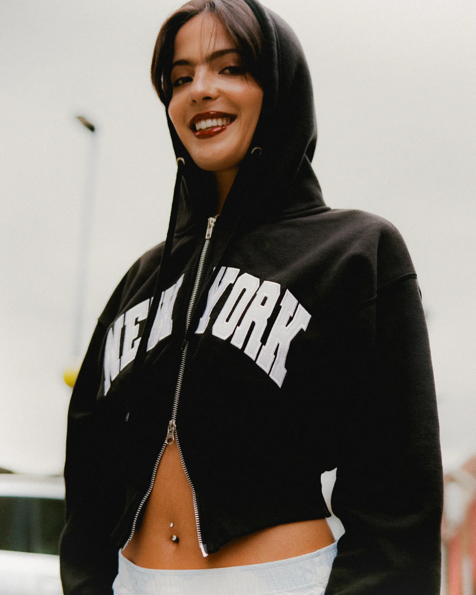 For his latest drop of hoodies, available today—and accompanied by a lookbook with The Face’s America Korban on styling duties—Gibbons decided to pay a more pointed homage to the two cities that have inspired him most: London and New York. (According to his godmother, he told her he wanted to move to both cities when he was a five-year-old growing up in Belfast.) “I haven’t lived in New York half as long as I’ve lived in London, but the effect that each of those cities has had on me is on kind of equal footing,” he says, noting that he deliberately went for a track jacket style and a Gothic font for the London pieces as a nod to its medieval history, while for the New York pieces, he channeled more of a varsity vibe. “I feel like both those cities have welcomed me into their arms.”