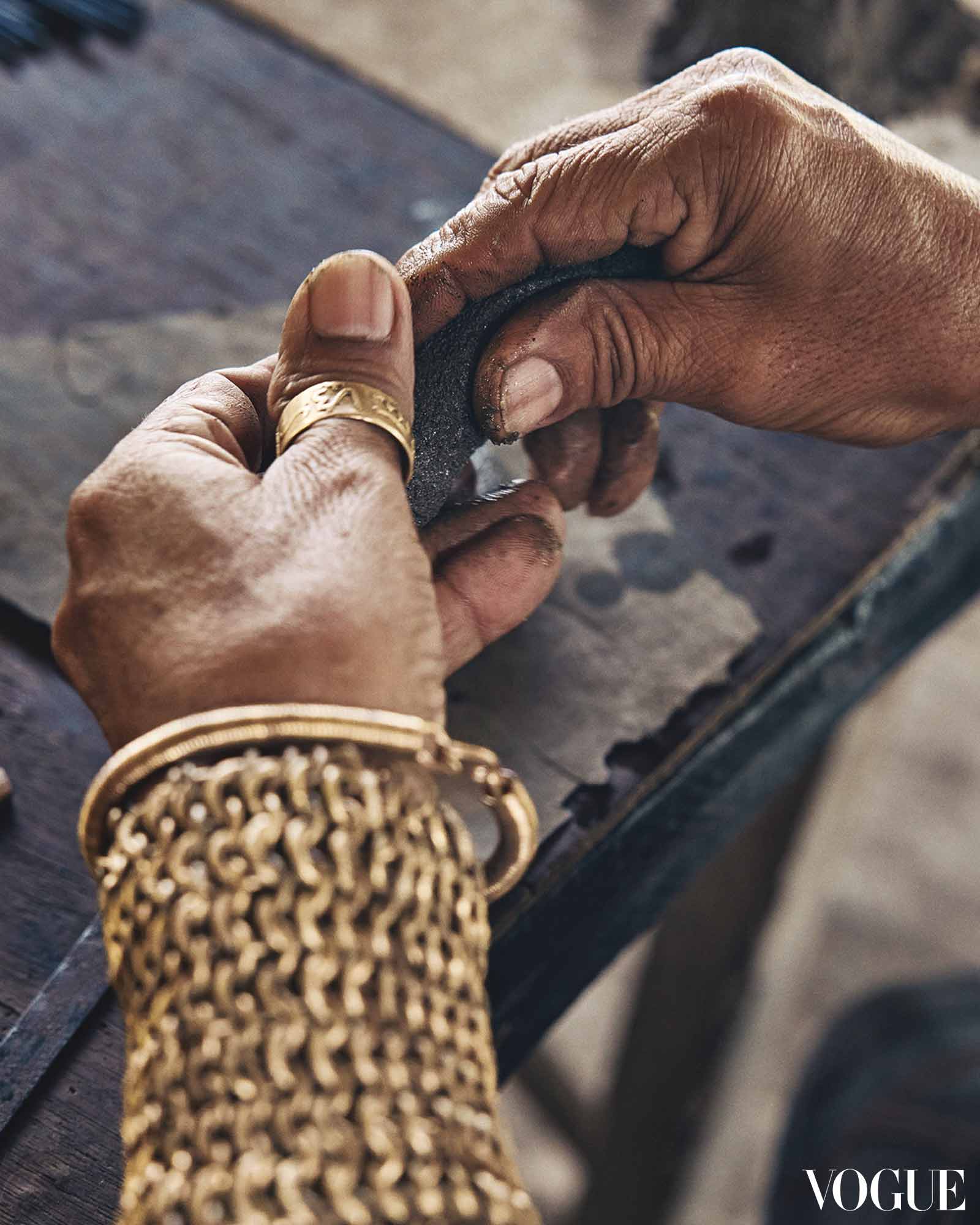 After it has cooled down, Fara breaks apart the clay mold, revealing the cast brass bangle inside. The unwanted bits will be broken off the bangle and melted again. Each wax mold is unique—even identical-looking tiny bells and are each forged individually. “I make all of this by hand, from the smallest to the largest,” Fara says. “Nothing is machine made.”