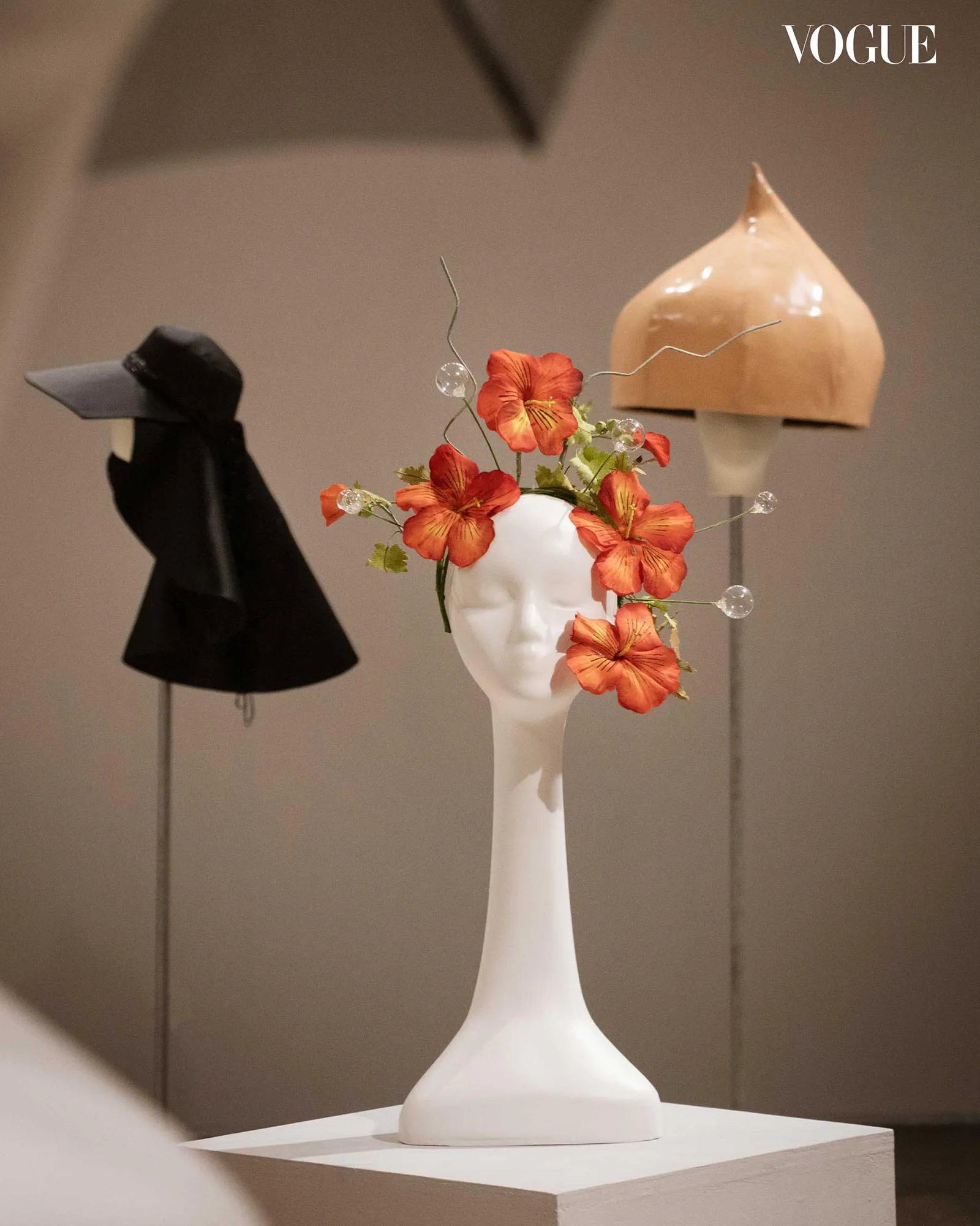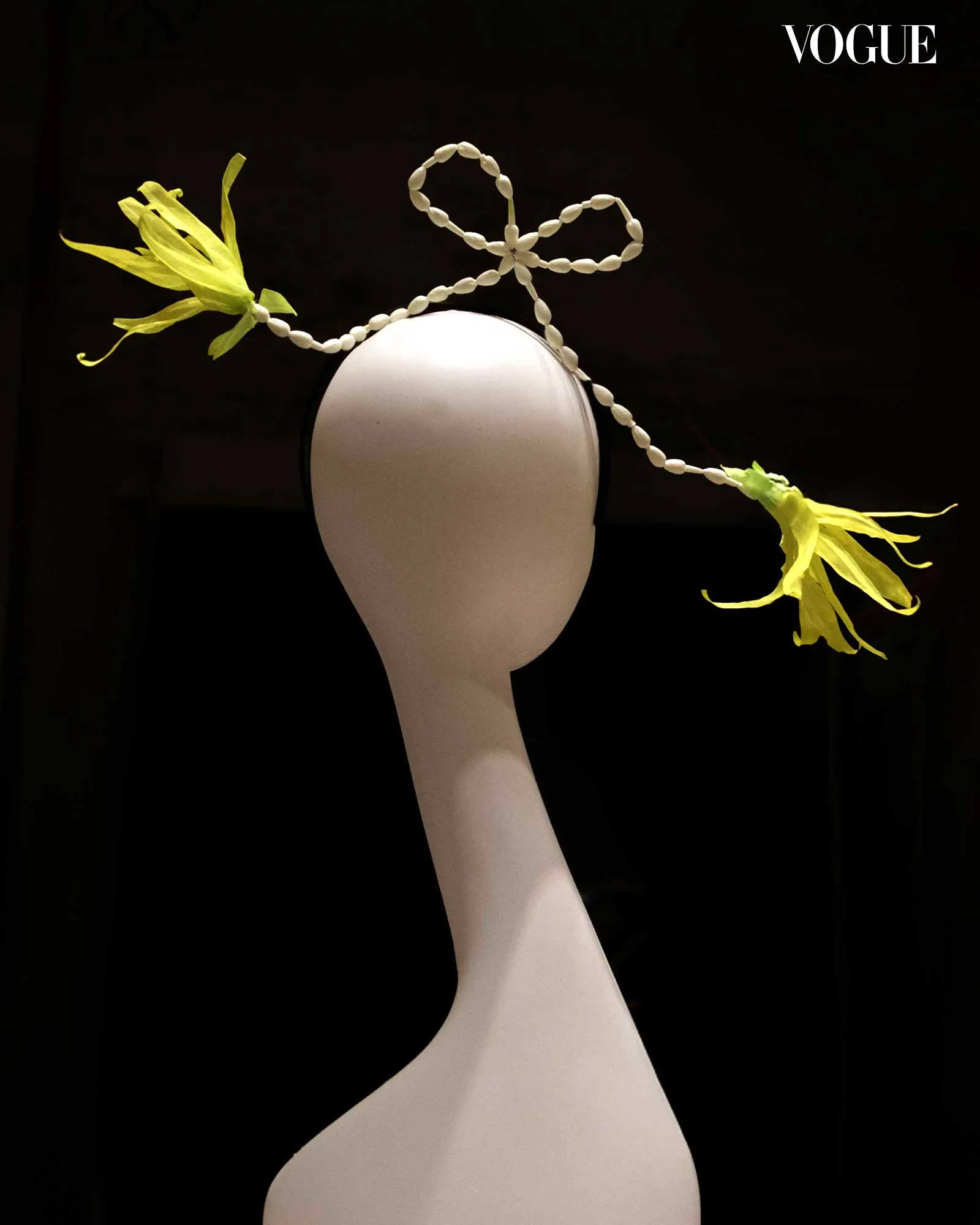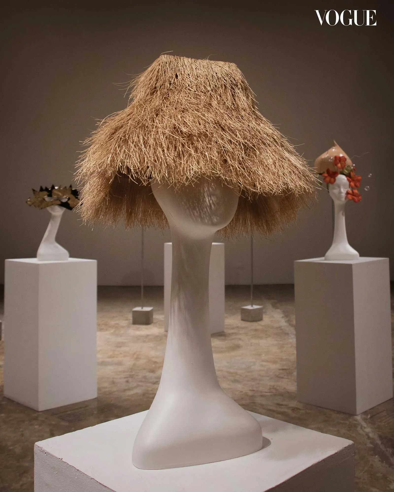 Other hats reference the woven banig mats found throughout the archipelago, each region with its own distinctive patterns, materials, and traditions. A piece inspired by Cebu’s gold death mask draws from archaeological finds, covering only the eyes with a glinting metallic sheen, a symbol of wealth and spiritual protection. Another reimagines the gumamela, recalling childhood play. “When I was a kid, you pound the gumamela and you would make bubbles. I want to capture that memory.” The scent of sampaguita is also present, embodied in a hat that nods to the garlands sold on Manila streets. “We really want to make sure to represent it. It’s such an iconic form, when you go to the Philippines you always see vendors with their sampaguita.”