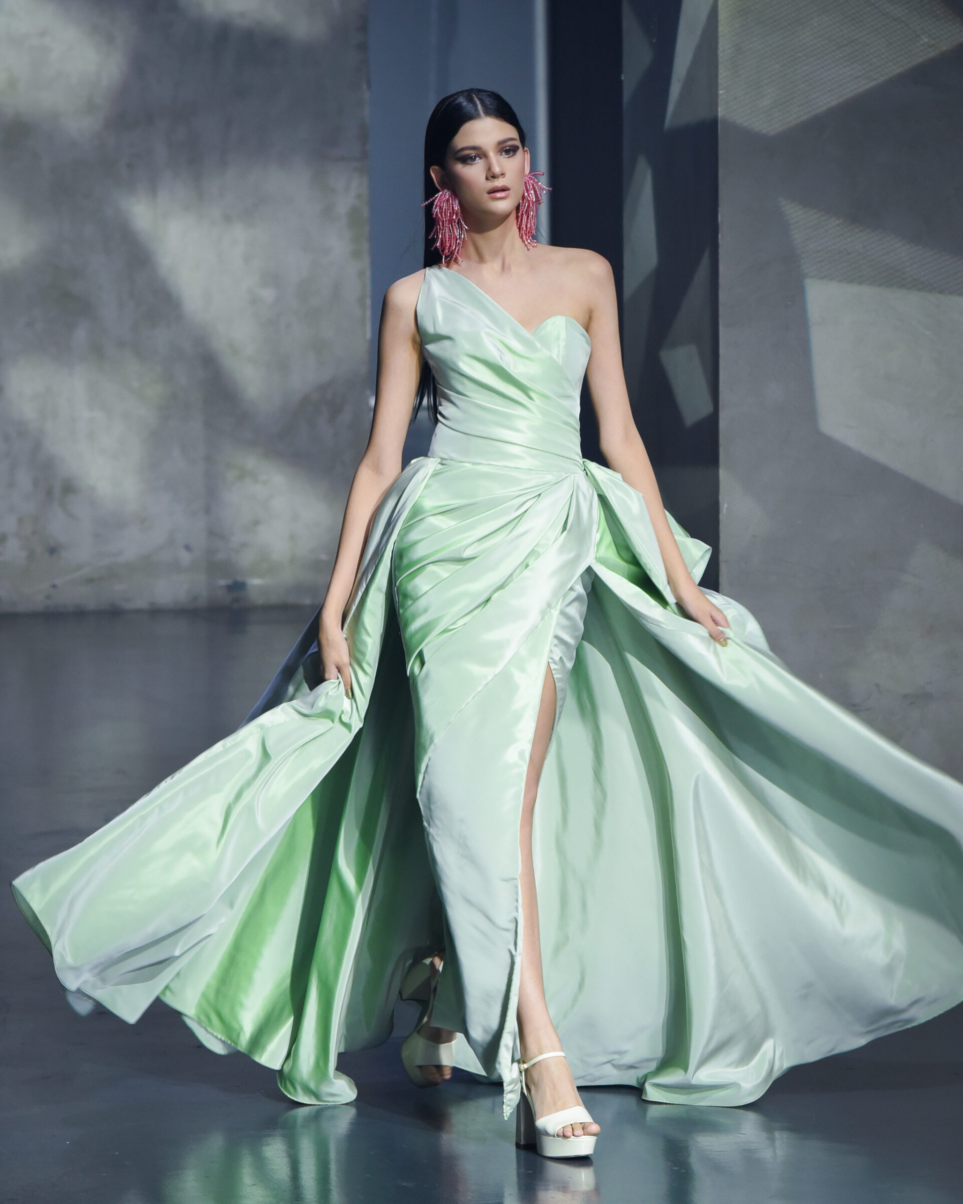The collection also featured playful necklines, lots of billowing sleeves, bright summer-inspired gowns, statement accessories, and beautifully draped off-the-shoulder fabrics, which tied most pieces together. Leyva told Vogue Philippines that he wanted to give emphasis on silhouettes. “Silhouettes. Different silhouettes,” the designer shares. “I wanted something to represent a collection that’s young and fresh.”