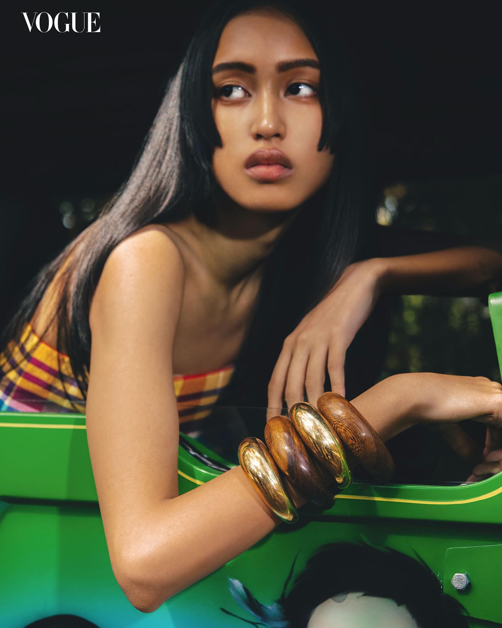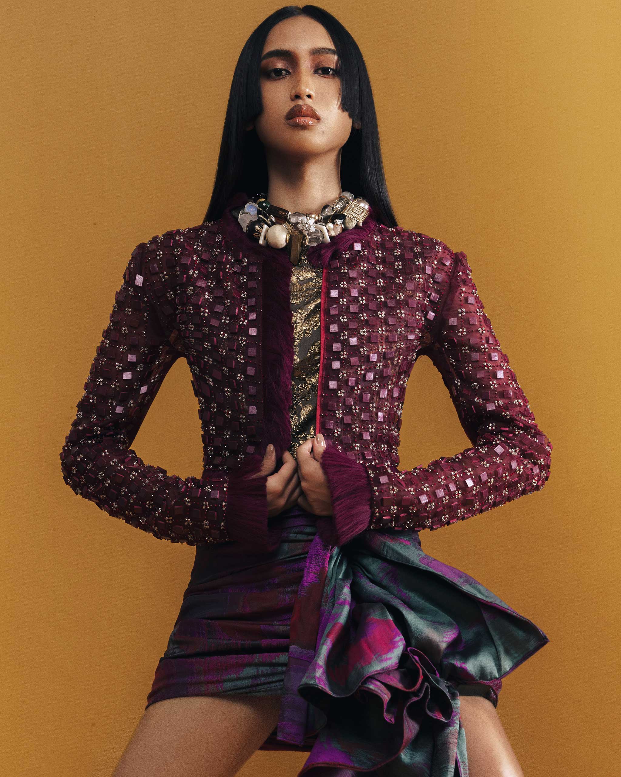 Going full maximalism with an archival MARTIN BAUTISTA skirt, DENNIS LUSTICO top, and jacket crafted with lacquered wooden chips, and ADANTE LEYESA Coco necklaces that took years to form. The vintage components of these neckpieces were gathered throughout the designer’s local and international travels, and were combined with new materials for a contemporary touch. Photographed by Borgy Angeles for the February 2025 Issue of Vogue Philippines