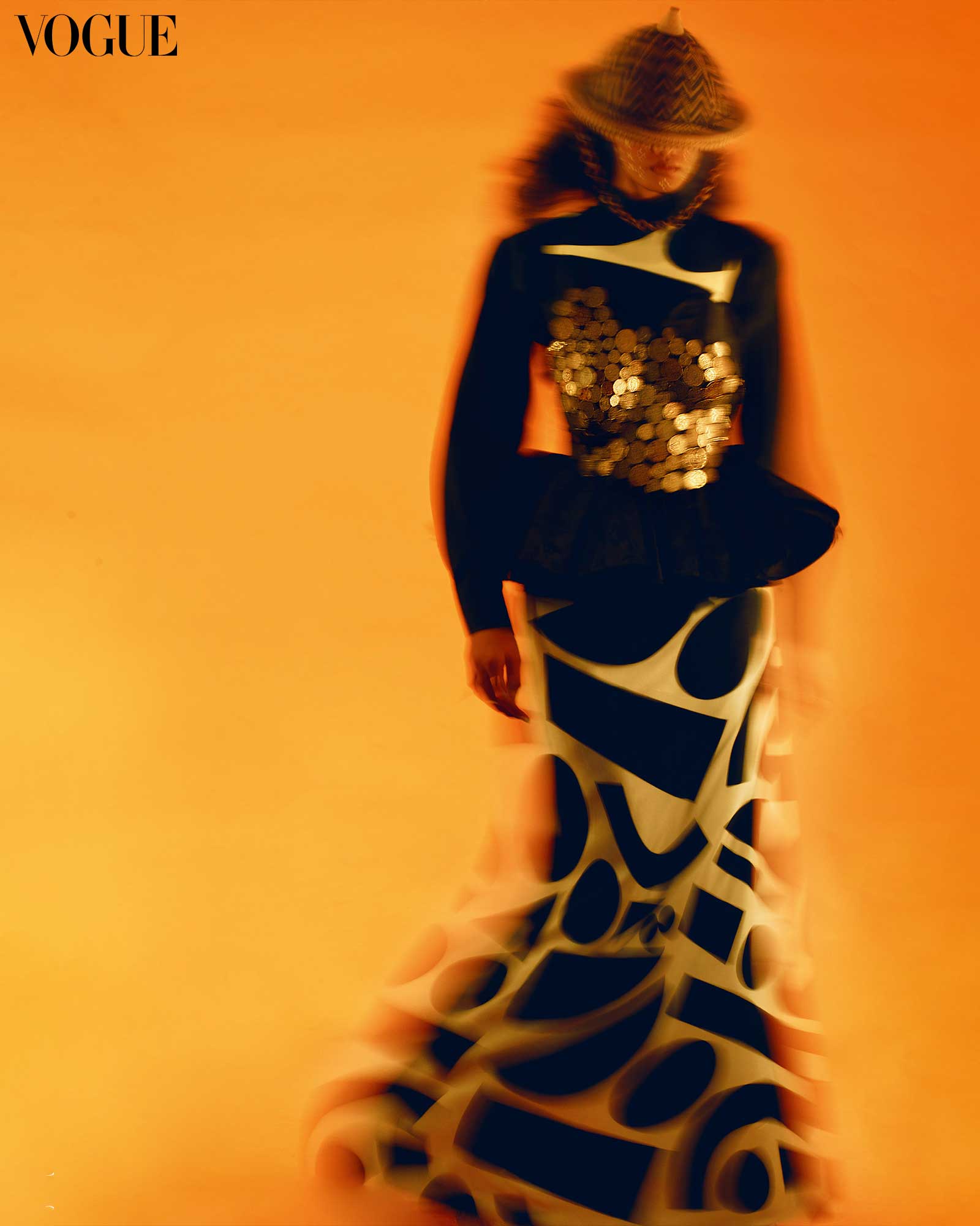 A graphic INNO SOTTO dress is overlayed with a custom chest plate by STUDIO HARING, crafted with vintage Philippine coins. The chest plate is inspired by the adornments suspended on the Maranao’s payong a diyakatan (umbrellas used for traditional royal ceremonies or enthronements). A saruk-nituan completes the look—it is a woven hat from Sulu, made of nito or fern vines. Photographed by Mark Nicdao for the April 2024 Issue of Vogue Philippines.