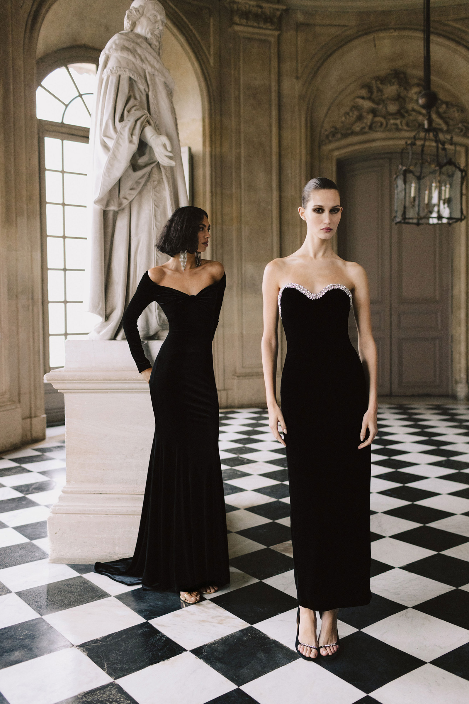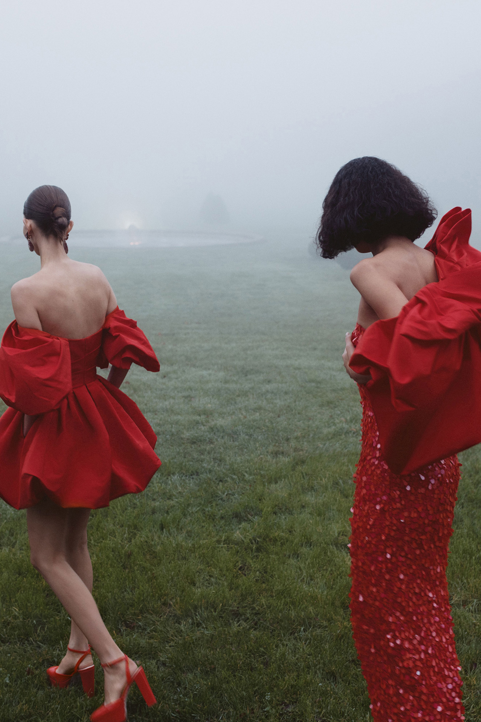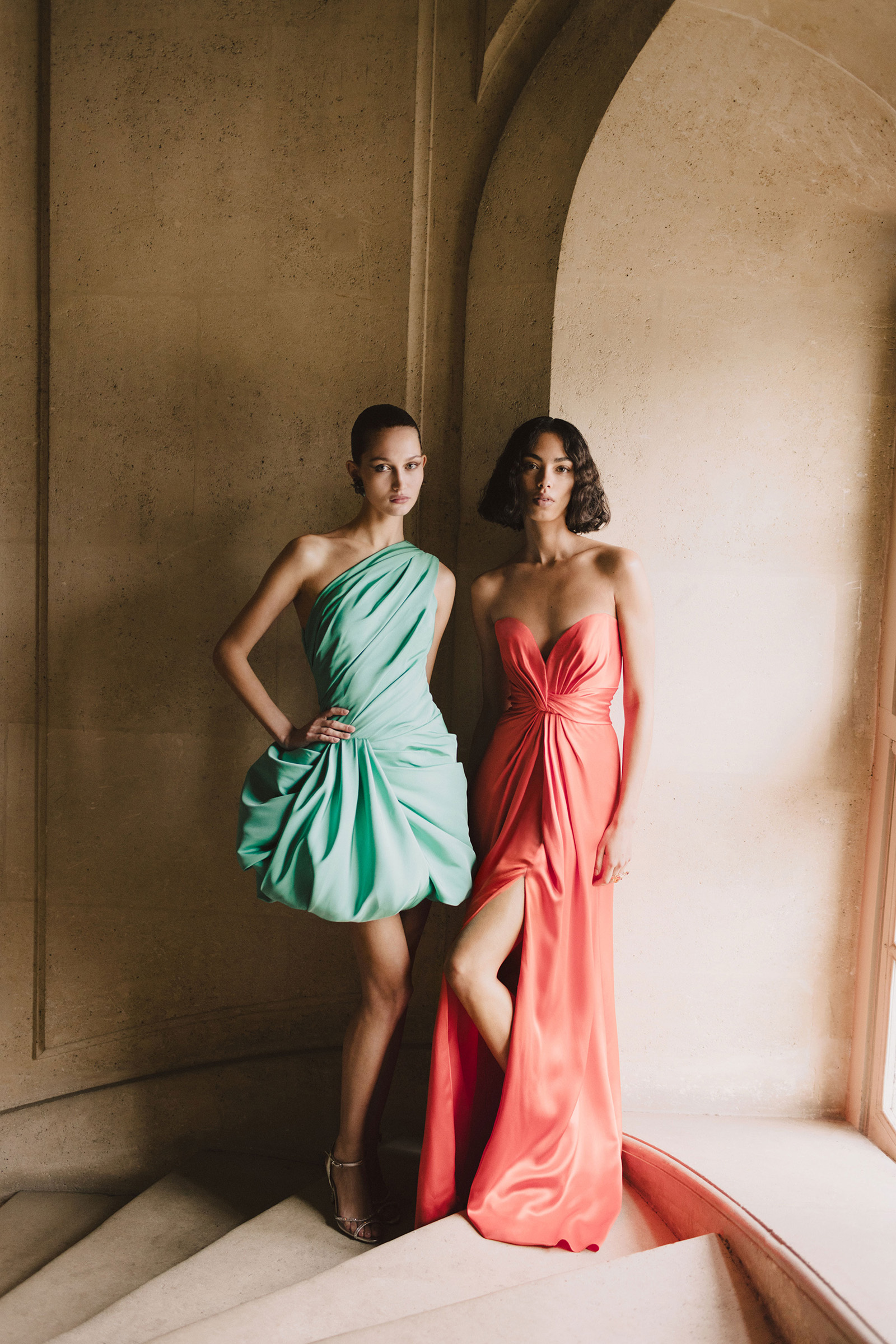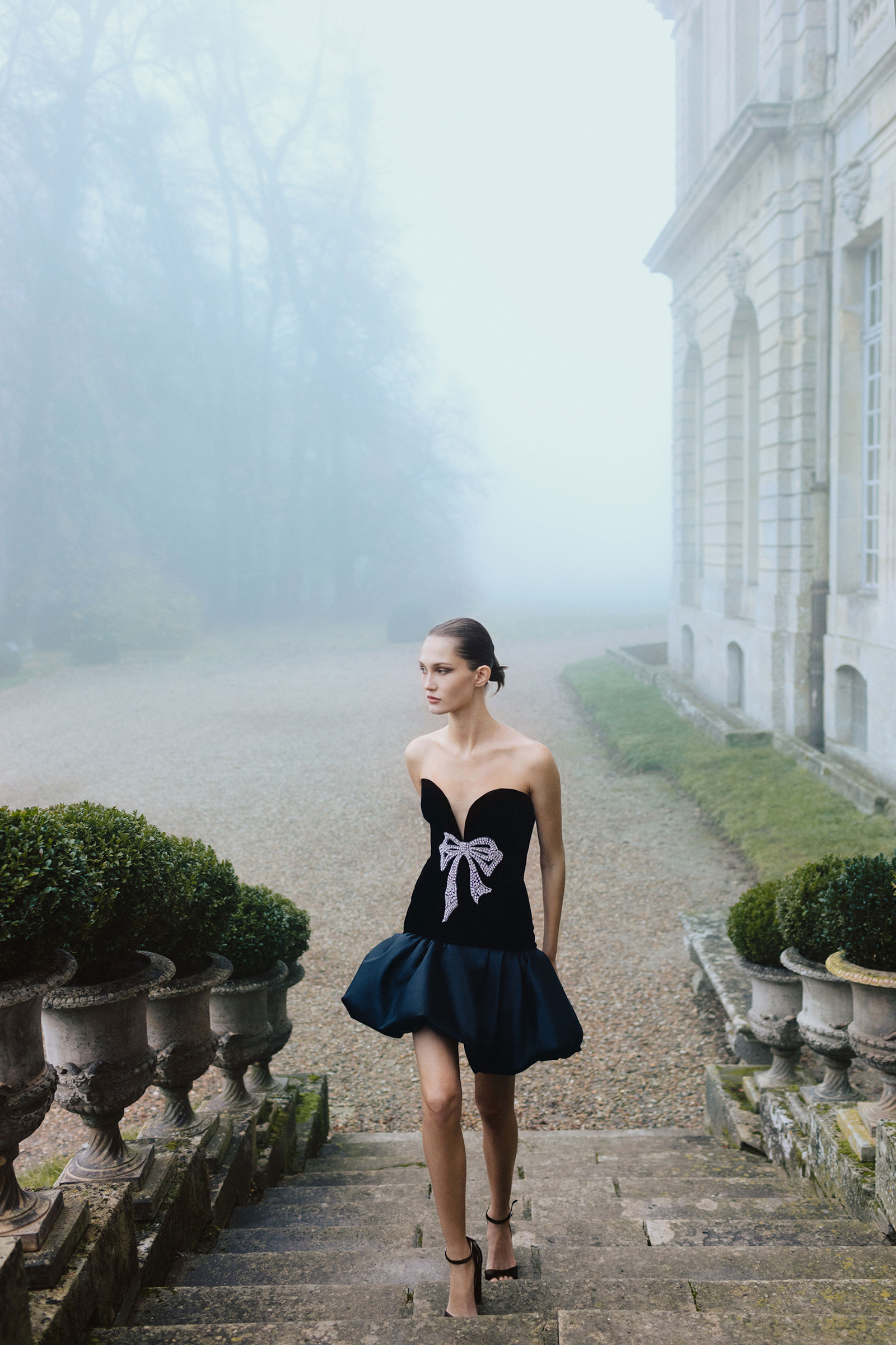 Backdropped by the cool forest light in a grand chateau, Lhuillier presents her lineup. Each gown proposes a narrative that references the couture glitz and glam of the 1980s, with models adorning the residence like guests of a grand soirée. According to the designer, her goal was to keep the silhouettes minimal yet updated by playing with volumes, lines, and textures.