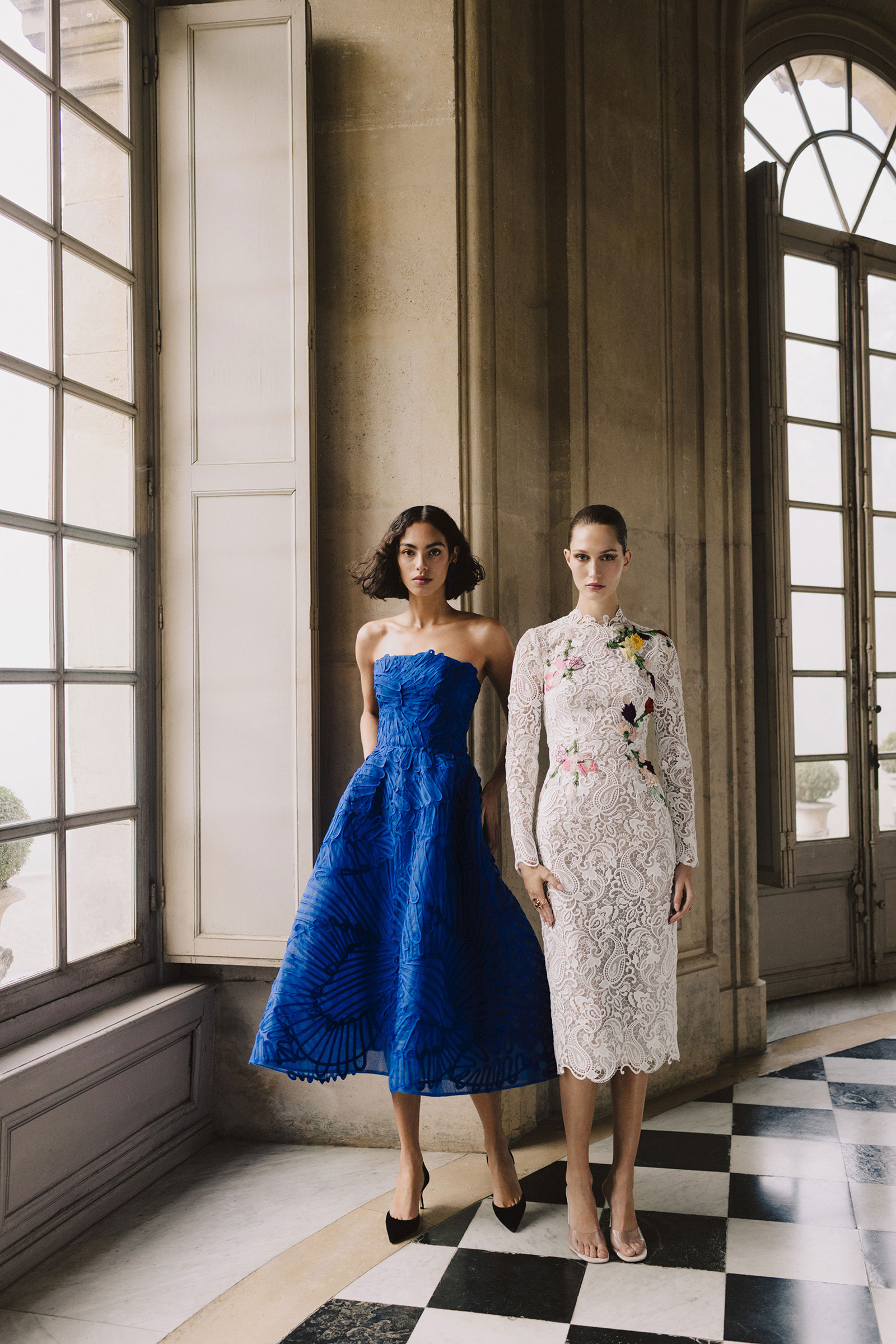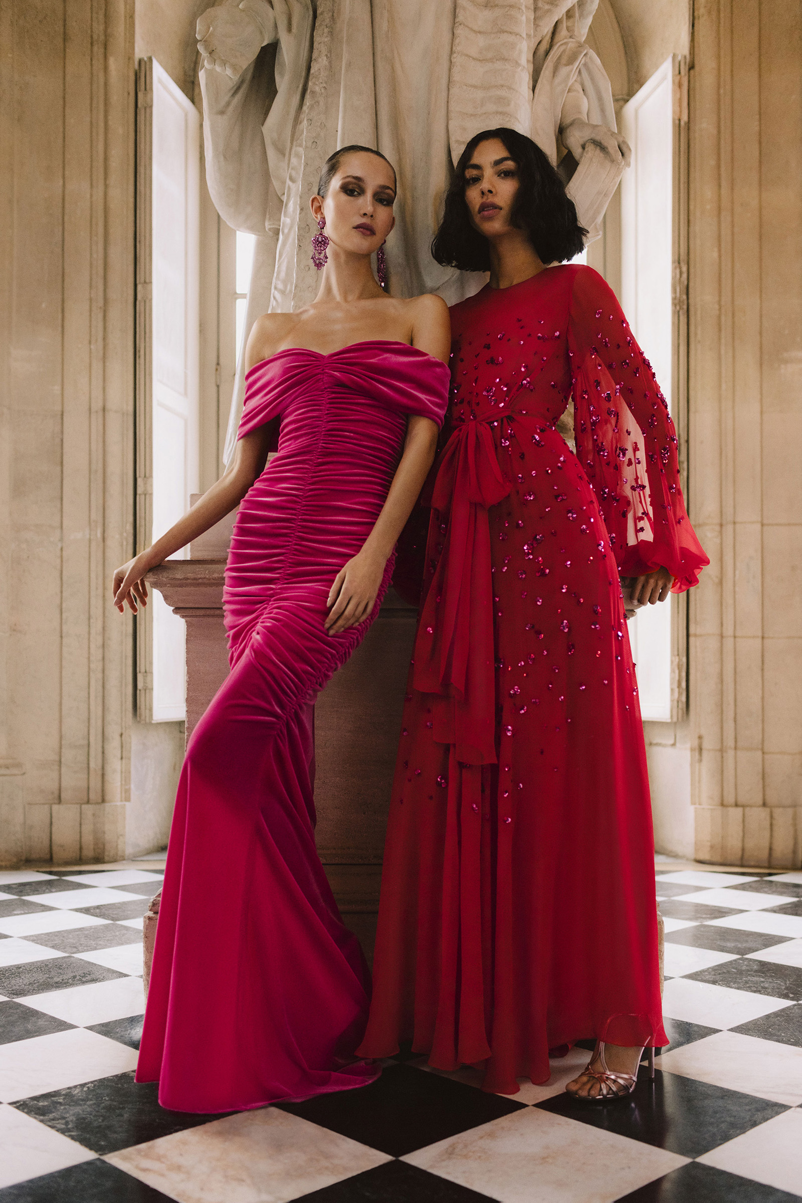 Lhuillier’s palette ranges from white to blush, pastel pinks to fuchsia and poppy red. She then complements the rose colored tones with a range of blues, metallics, and finally to lush black.