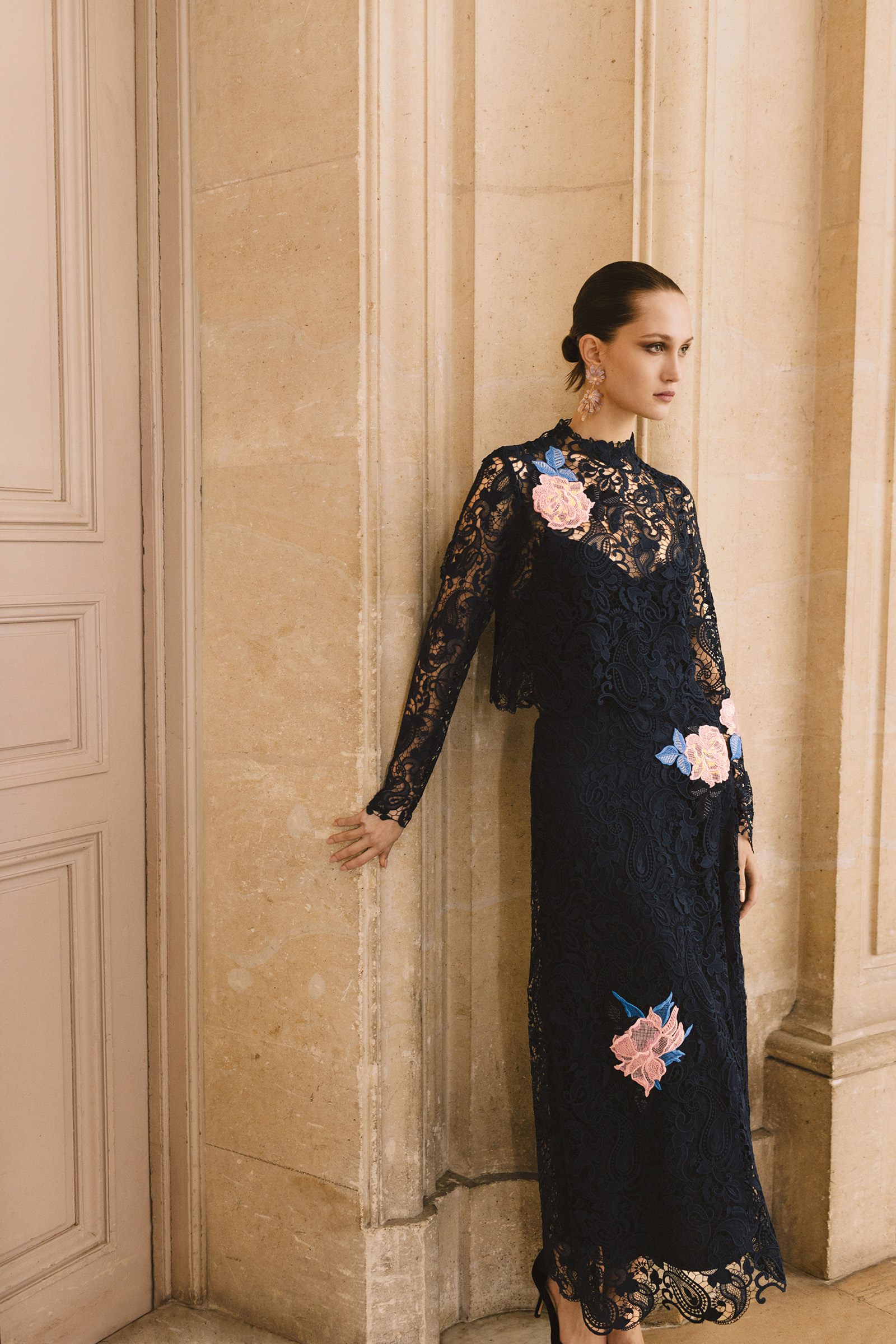Stretch velvet, jacquard, and velour define the collection’s more sultry, retro looks, while metallic embellishments, delicate lace, feathers, and silks provide a lighter take on her inspiration. The designer made sure to include not just gowns, but also two-piece and three-piece ensembles, as well as tea-length and mini skirts for women who are looking for a fresher, easier proposition with just as much luxury.