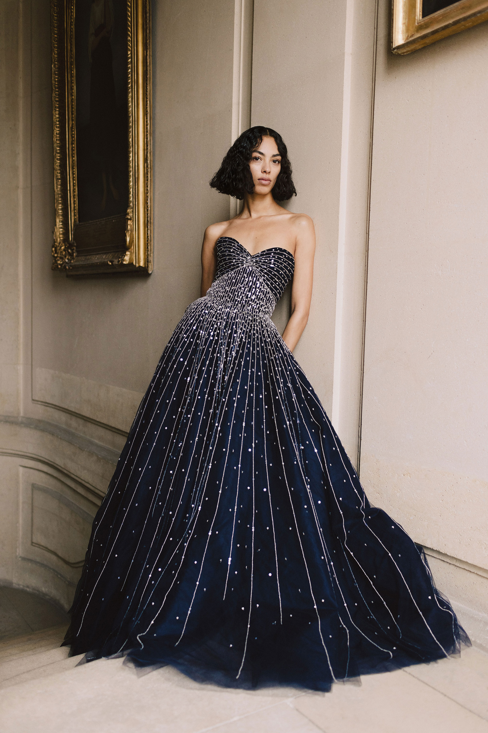 To cap off the collection; a full midnight blue tulle gown glittering with sunburst lines of embroidery and sparkling ornamentation.