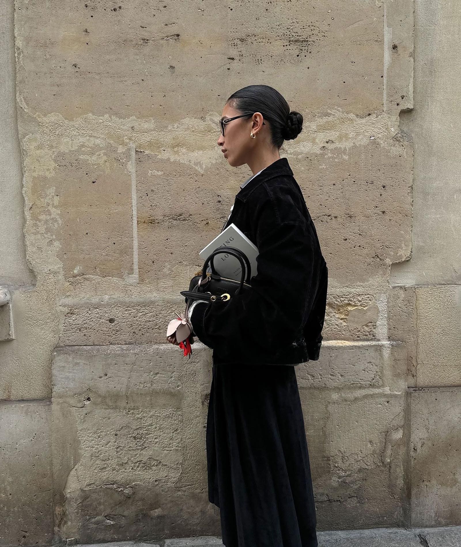 Ongoing building work notwithstanding, the studio is the stuff of Parisian dreams – all high ceilings and huge windows with romantic views of the arrondissement. Now that she’s settled into a life of reading by the Seine and attending Chloé shows, I’m keen for more intel on how living in the city has influenced this art history student-turned-influencer’s style. Is it now all monochrome ensembles and Breton stripes, with a Jane Birkin basket thrown in?