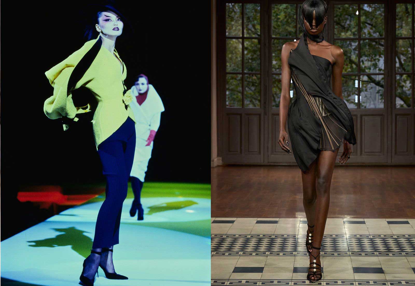 Founder Thierry Mugler, who became synonymous with the power shoulders of the 1980s, shook up fashion. His shows were huge theatrical spectacles open to thousands of spectators. He also brought new energy to ready-to-wear and challenged definitions of haute couture with exaggerated proportions and the introduction of materials such as rubber and PVC. He is known for pioneering diversity and inclusion on the runway.