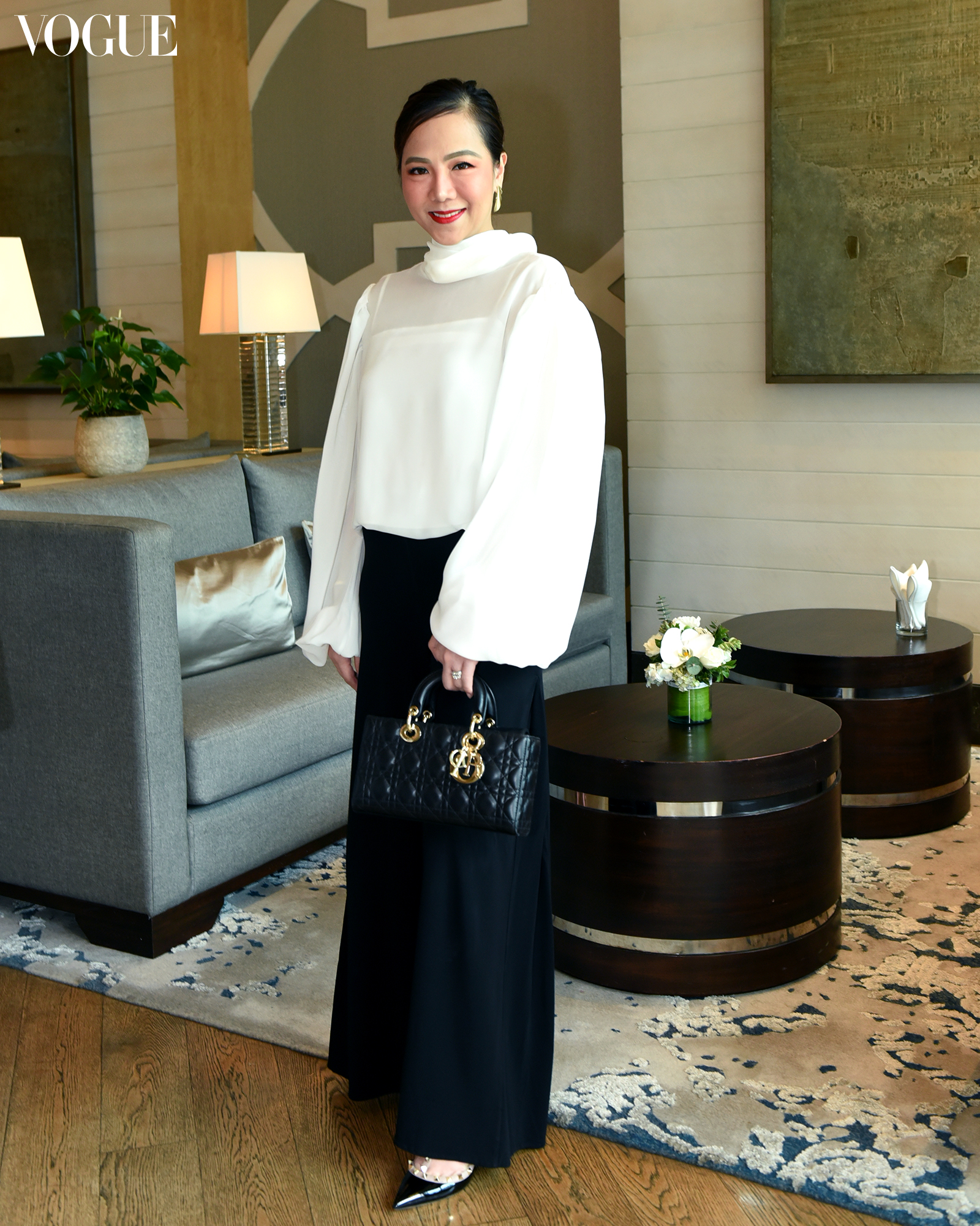 Black made a popular pairing among guests, as Miro Group founder and CEO Milka Romero donned a black-and-white striped suit dress; Christian Tantoco arrived with girlfriend model and Vogue Philippines’ May cover star Siobhan Moylan in a raw-hemmed white button-down paired with black tapered trousers, and Tati Fortuna accessorizes her pristine white cape with a mini black Lady Dior. Tiffany & Co. country manager Genevieve Yalung brought with her the latest version of the handbag—the mini Lady Dior D-Joy—worn with black flared trousers to match.