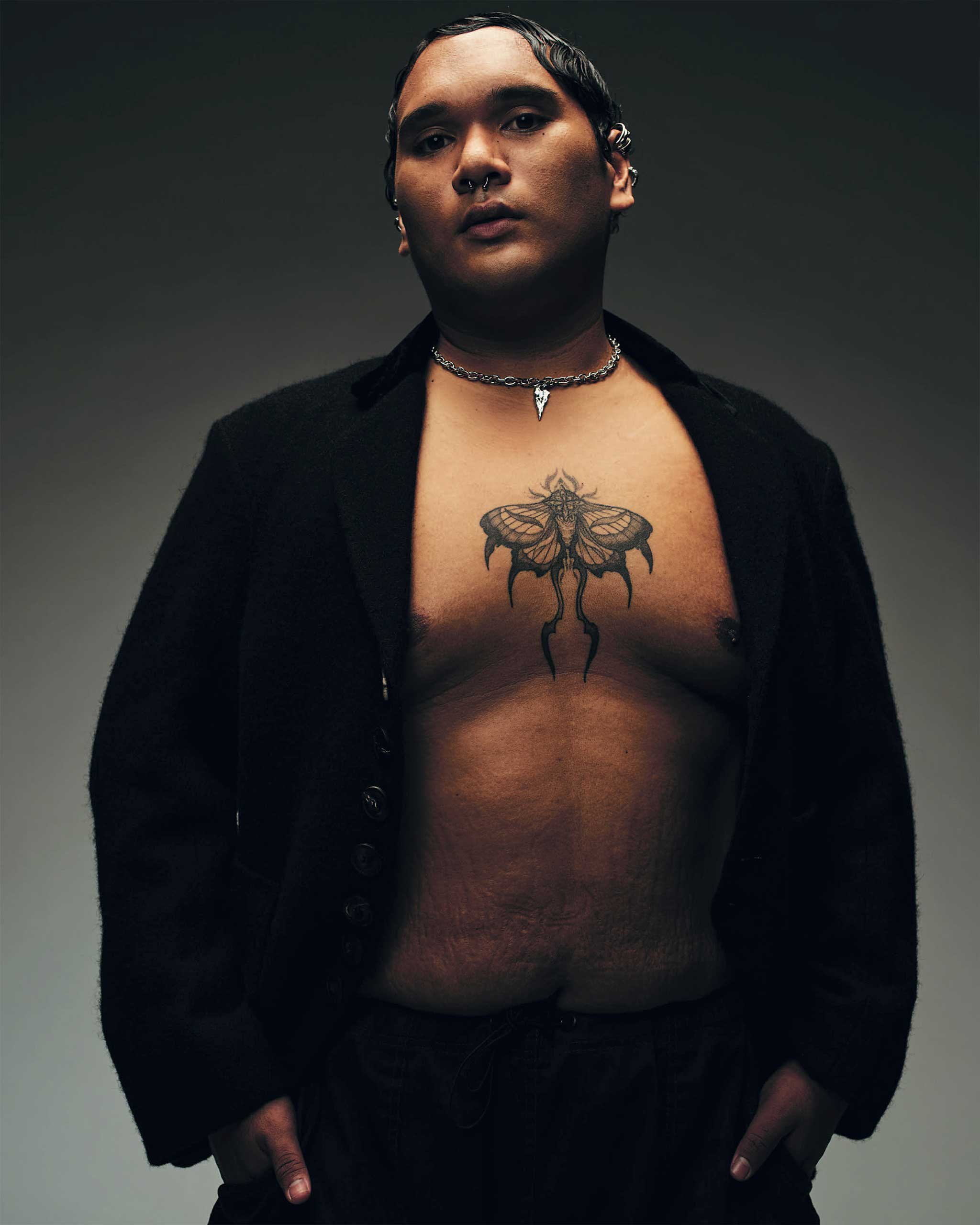 These days, an outfit for Hydir is all black, oversized and structured, finished with a pair of pointed Chelsea boots. They describe their style as bold simplicity with cultural influence, gravitating towards incorporating elements from their Indonesian and Pakistani heritage through jewellery and textile. “I love looser clothes; they allow for ease of movement when I walk around.” Layering accessories is big for them as well, with chunky jewellery such as bracelets and necklaces often being the statement of their ensembles. “My current style is somewhat of a compromise, influenced not only by my preferences but also by what’s available to me. In an ideal world where the size tag on clothing doesn’t matter, I think my style would be quite different.”