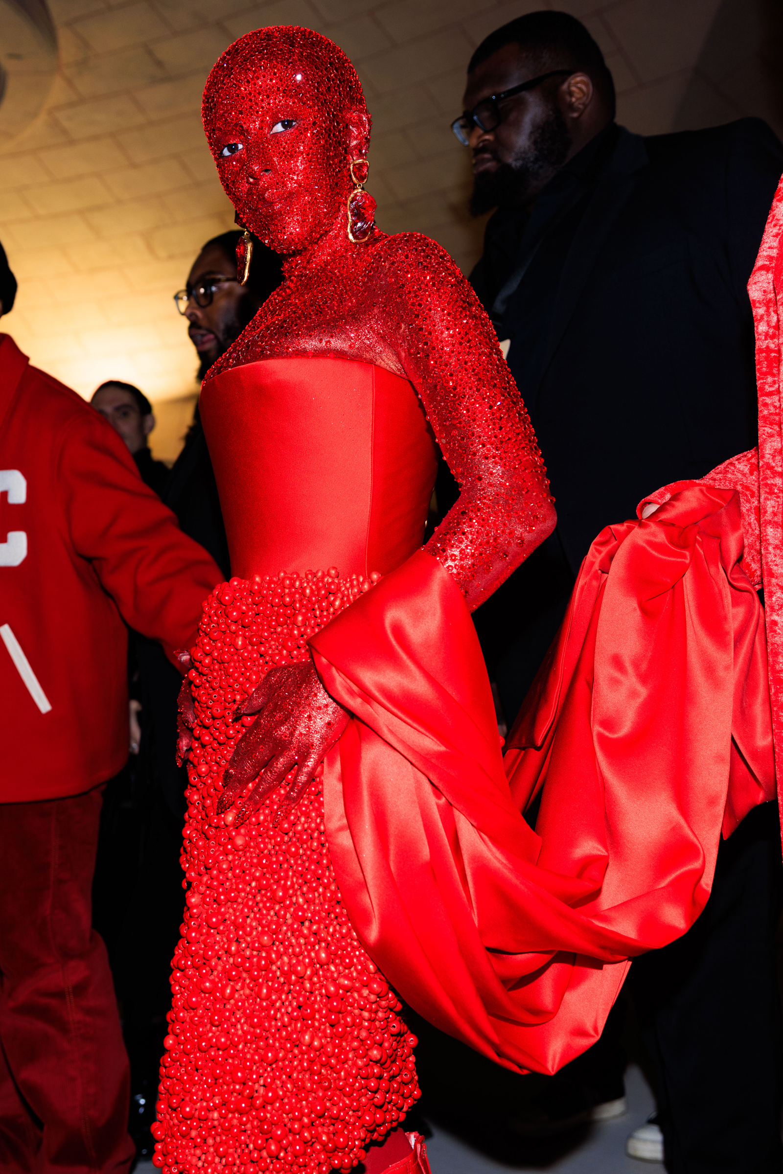After four hours of painstaking artistry, Doja Cat emerged glistening red from head to toe, covered in over 30,000 hand-applied Swarovski crystals. The look was completed with a corseted bodice, beaded skirt, and shawl, all in the same scarlet shade.