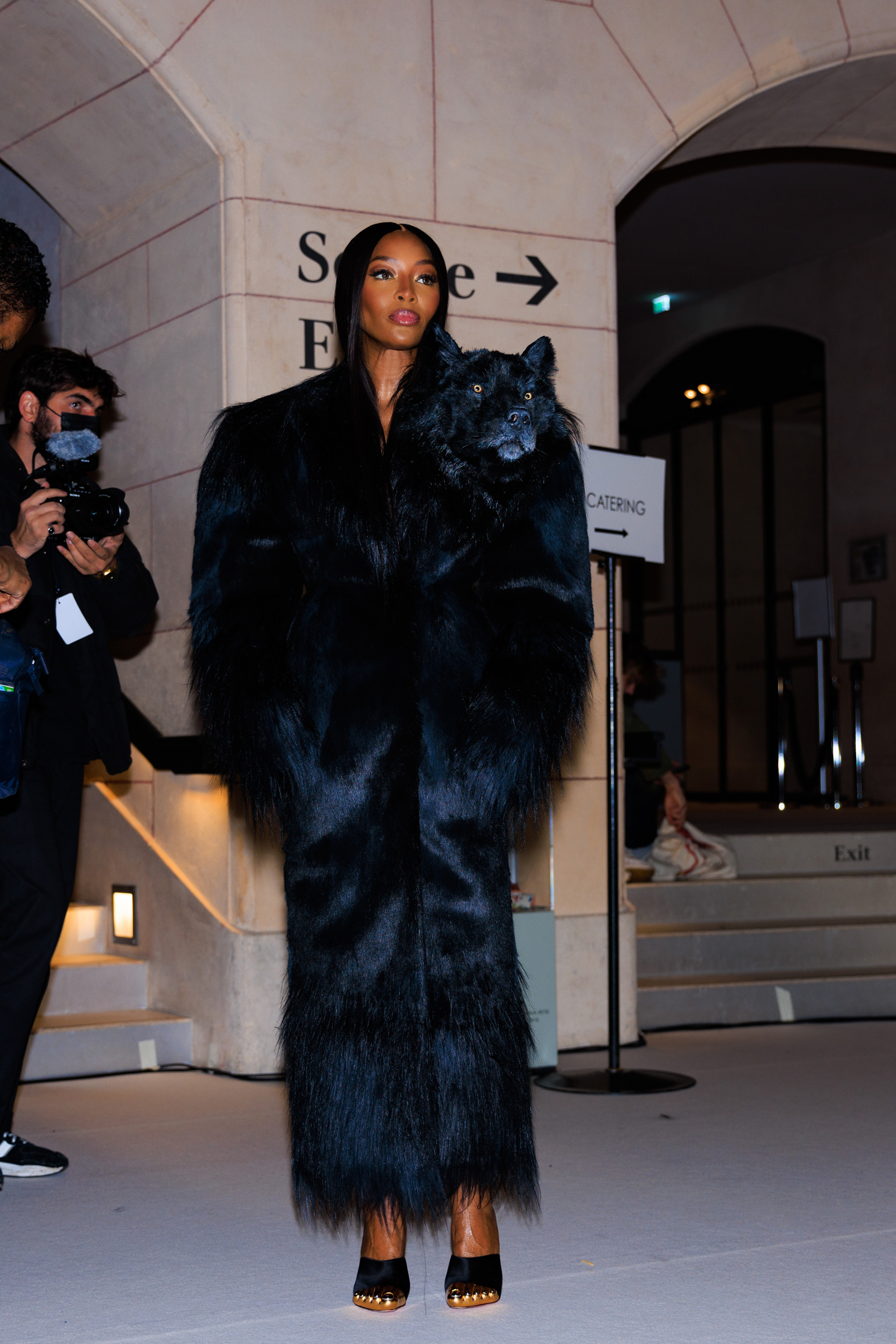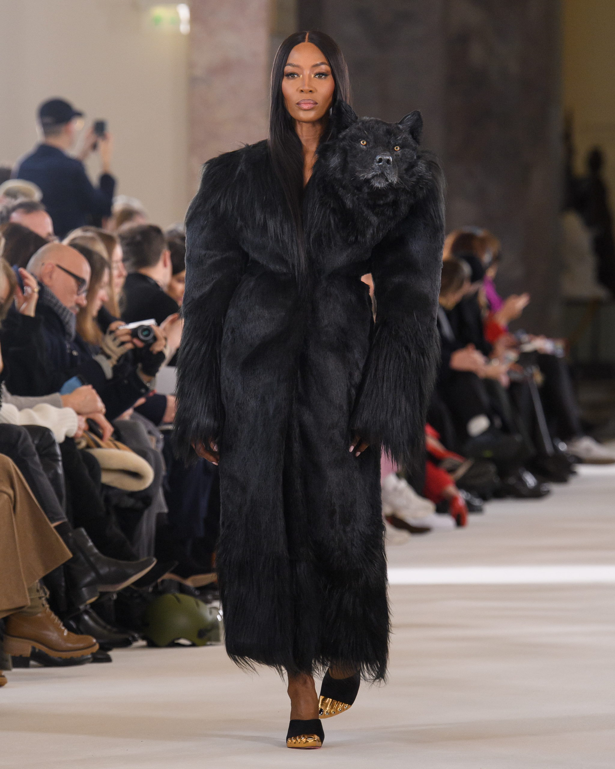 Supermodels Shalom Harlow, Naomi Campbell, and Irina Shayk each stepped out wearing one of the hand-crafted animal heads. Harlow dons a sleek strapless dress with a snow leopard head for a bodice. Shayk’s black one-shoulder number is highlighted with the head of a lion. Campbell appears in a commanding faux fur coat with a resin wolf glaring on one shoulder.