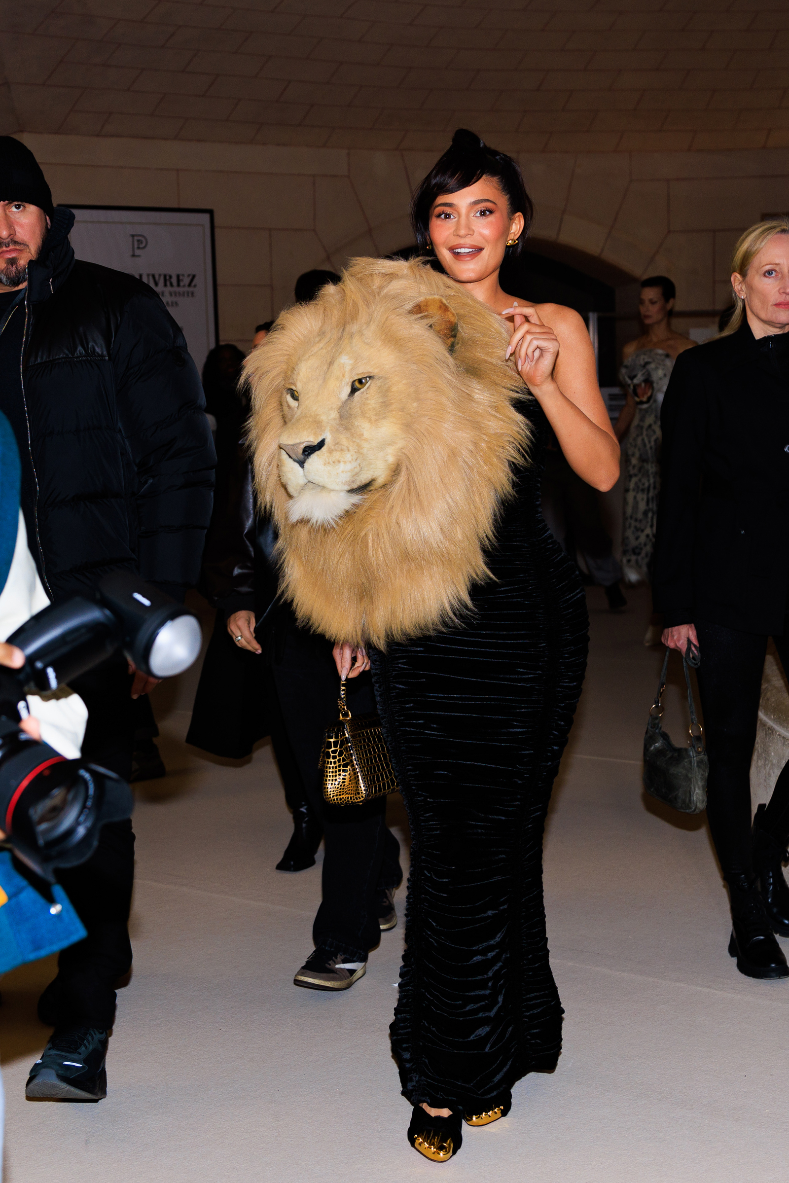 The musician took her place in the audience, an arms-length away from Kylie Jenner, who similarly stunned in her own velvet bodycon gown and lion’s head.