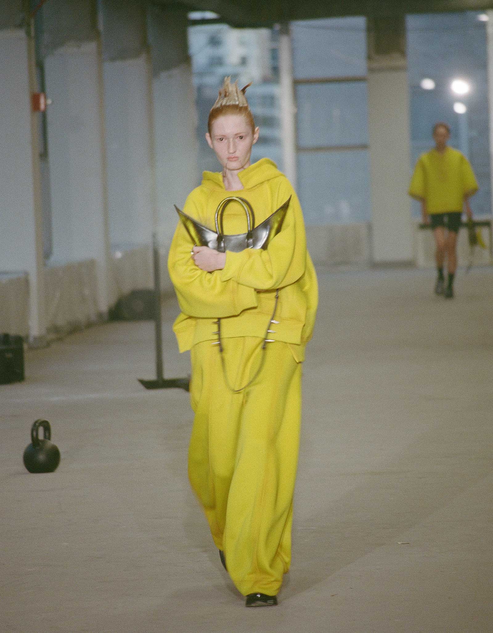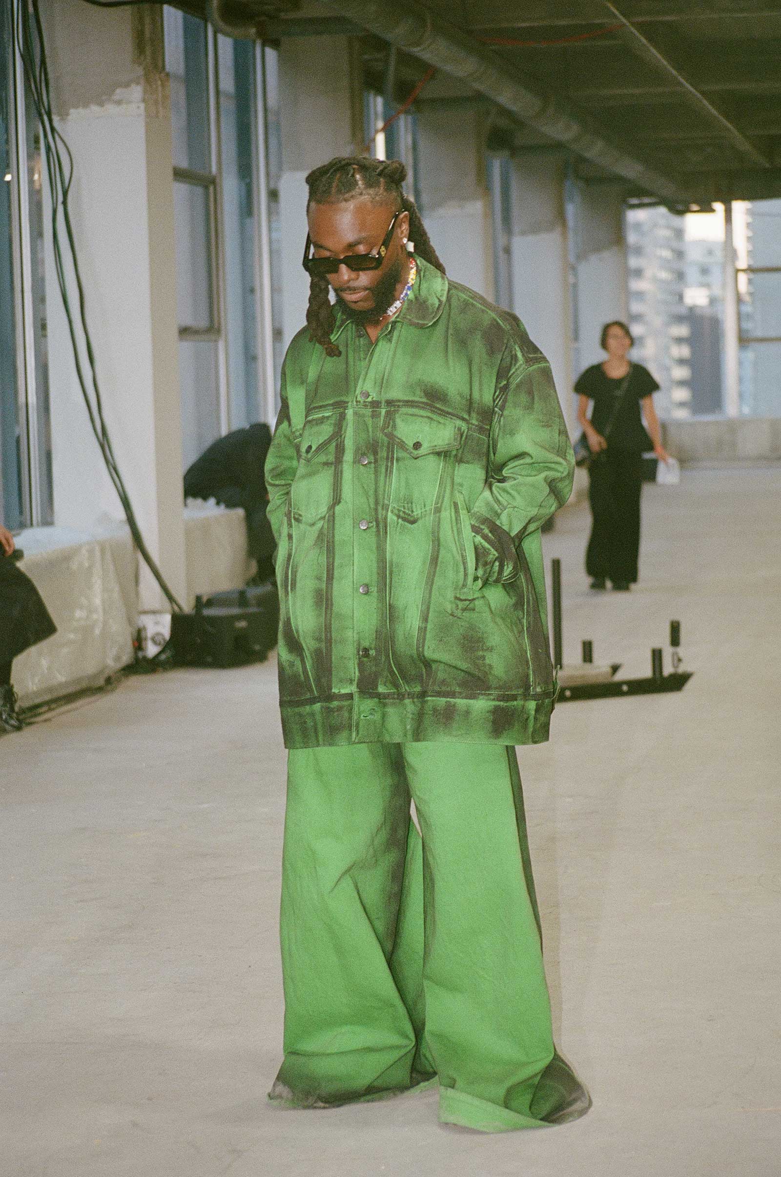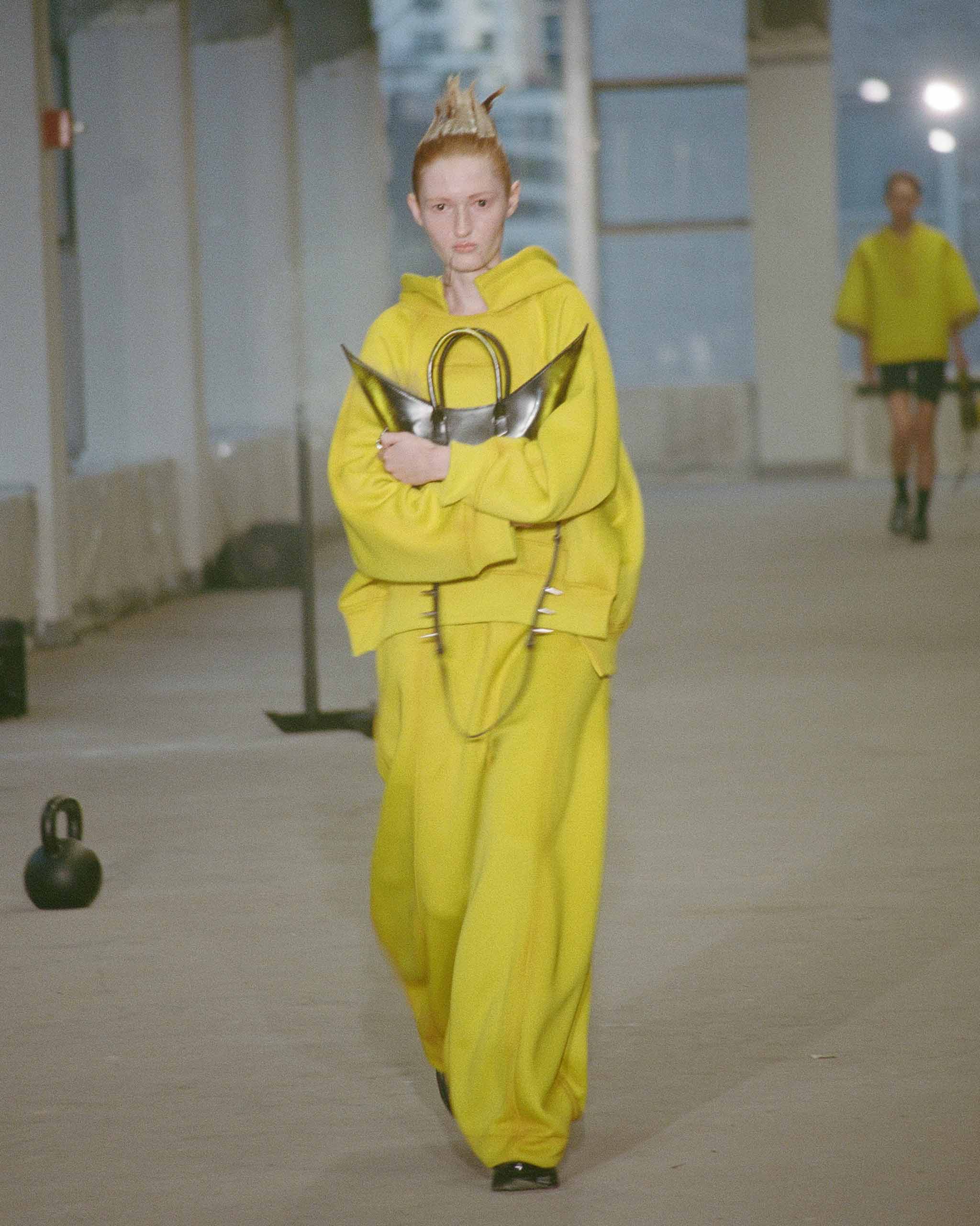 In contrast, Melitta Baumeister’s runway celebrated movement and structure, inspired by sports and her exploration of shapes in motion. Known for her sculptural designs, Baumeister brought her pieces to life by allowing them to move dynamically down the runway, showcasing the relationship between fabric and fluidity. Football-inspired shoulders, oversized jerseys, and bike shorts added a sporty edge, while hand-sprayed sweats and silk-screened denims continued her tradition of texture and depth.