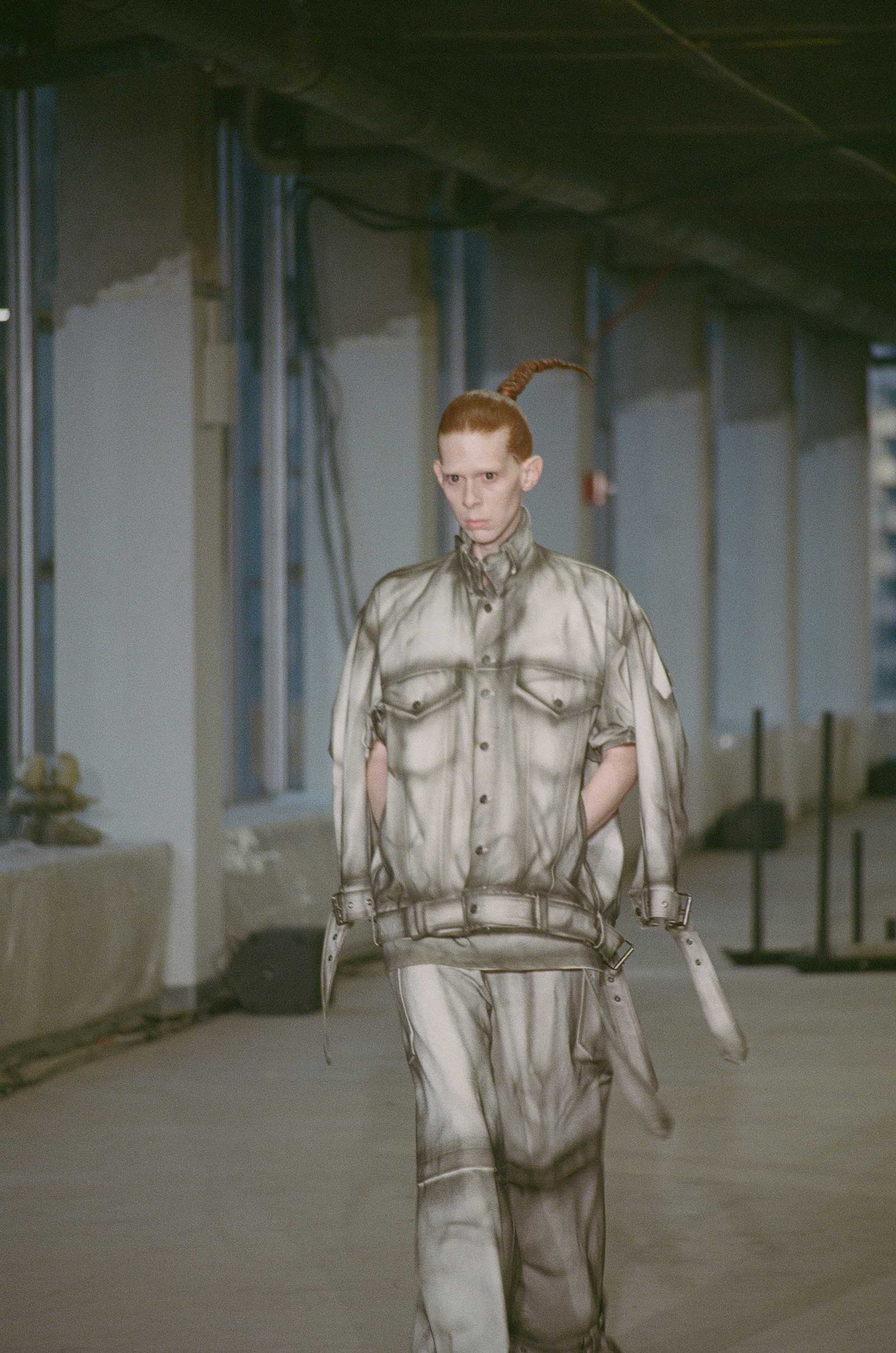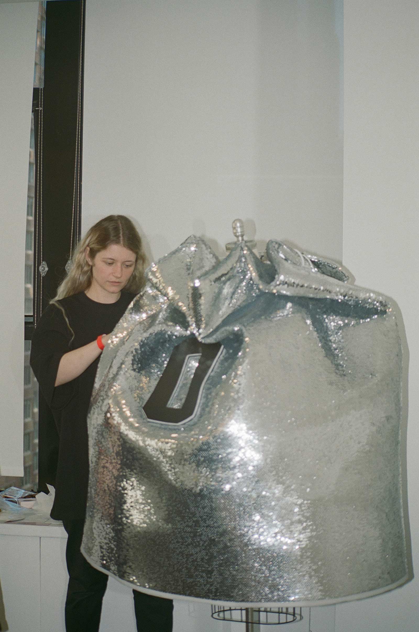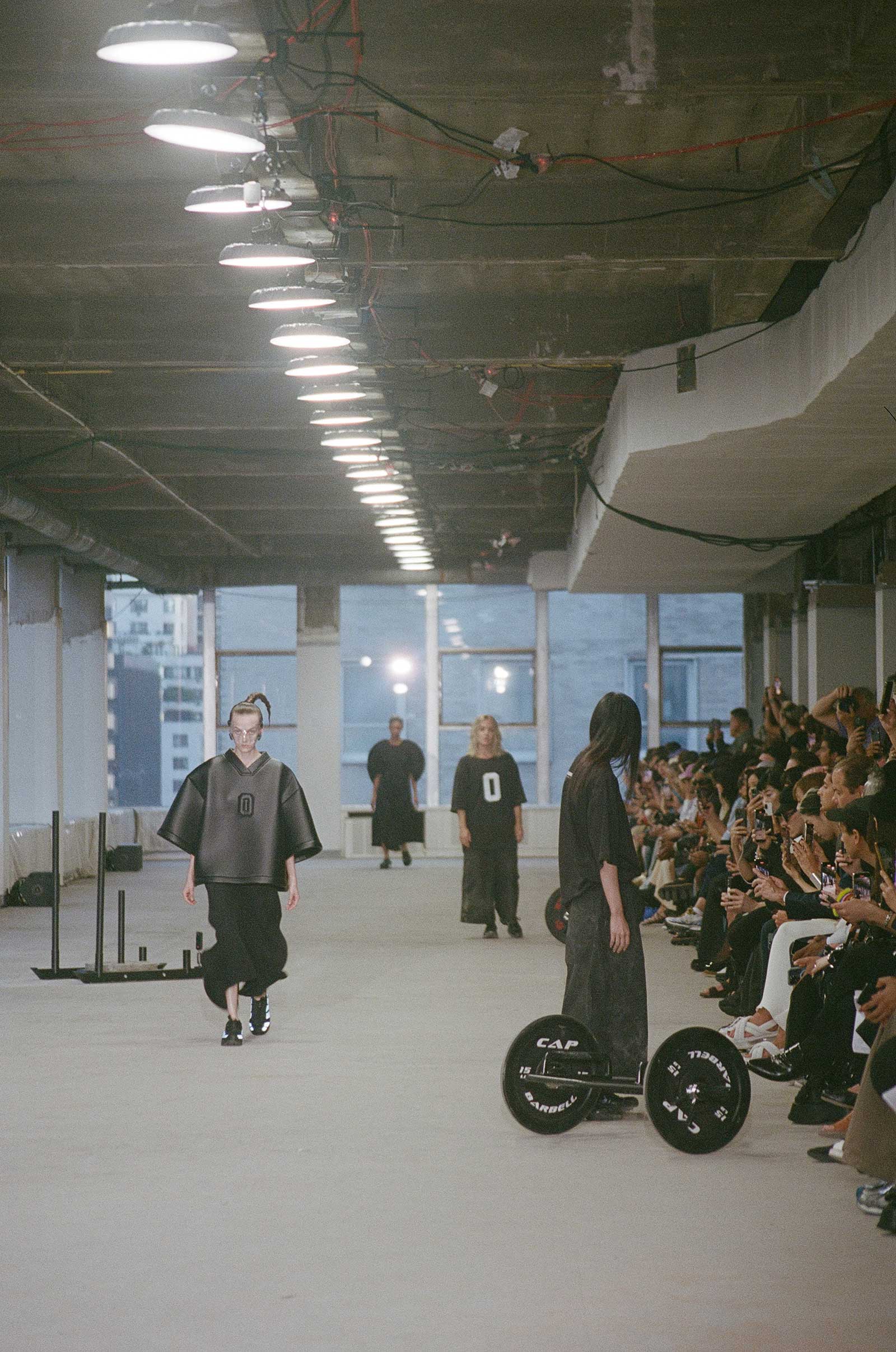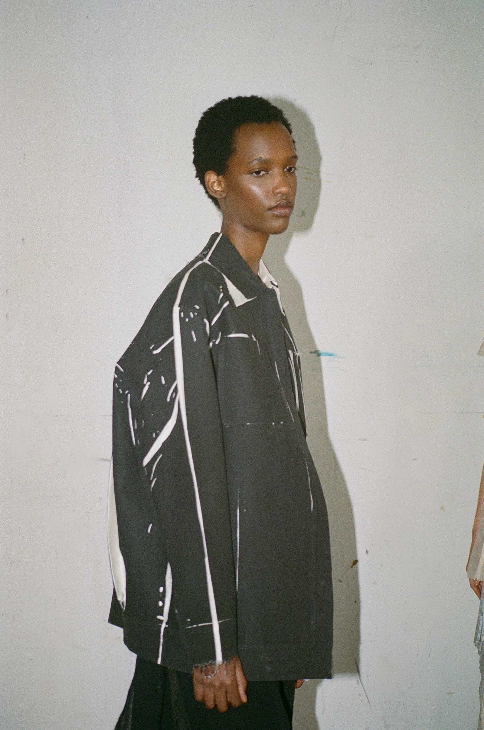 In contrast, Melitta Baumeister’s runway celebrated movement and structure, inspired by sports and her exploration of shapes in motion. Known for her sculptural designs, Baumeister brought her pieces to life by allowing them to move dynamically down the runway, showcasing the relationship between fabric and fluidity. Football-inspired shoulders, oversized jerseys, and bike shorts added a sporty edge, while hand-sprayed sweats and silk-screened denims continued her tradition of texture and depth.
