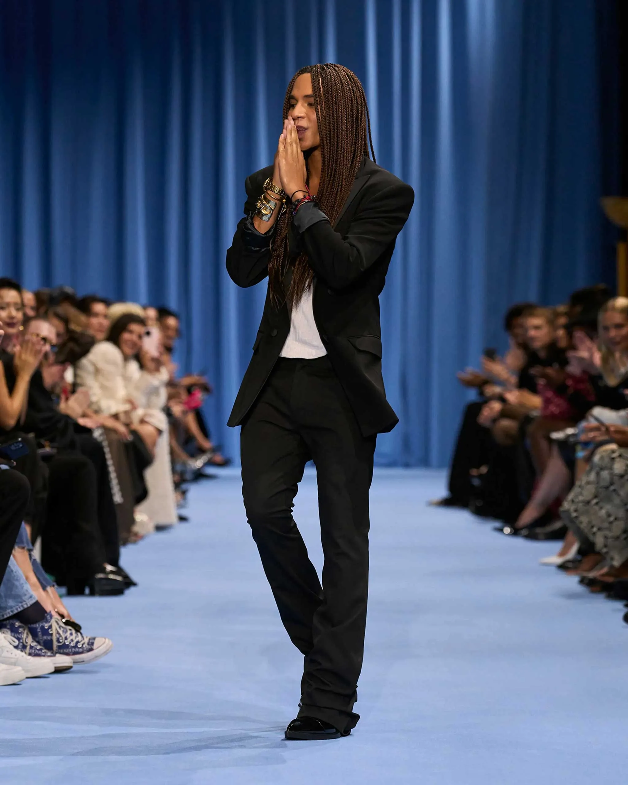 The following year, 2016, revenues were around €120 million: Qatar-based Mayhoola purchased 100 per cent of Balmain for €500 million that same year. Following the acquisition, Rousteing worked to expand the reach of both Balmain and Paris fashion more broadly. Beginning with his large-scale festival shows, among them the 2019 men’s presentation during Paris’s Fête de la Musique, which drew more than 2,000 guests to the Jardin des Plantes, he made public access a core part of the Balmain experience. “Our belief,” he said then, “is in the possibility of a more inclusive, joyful future for fashion.” The Balmain Festival events blended live music with runway presentations: some editors kvetched, but the audience loved it.
