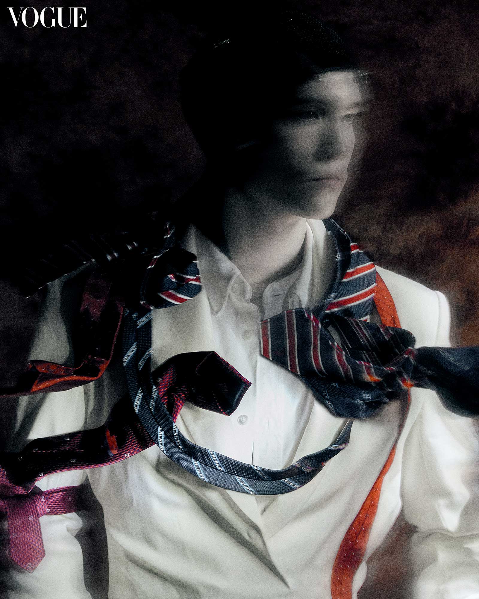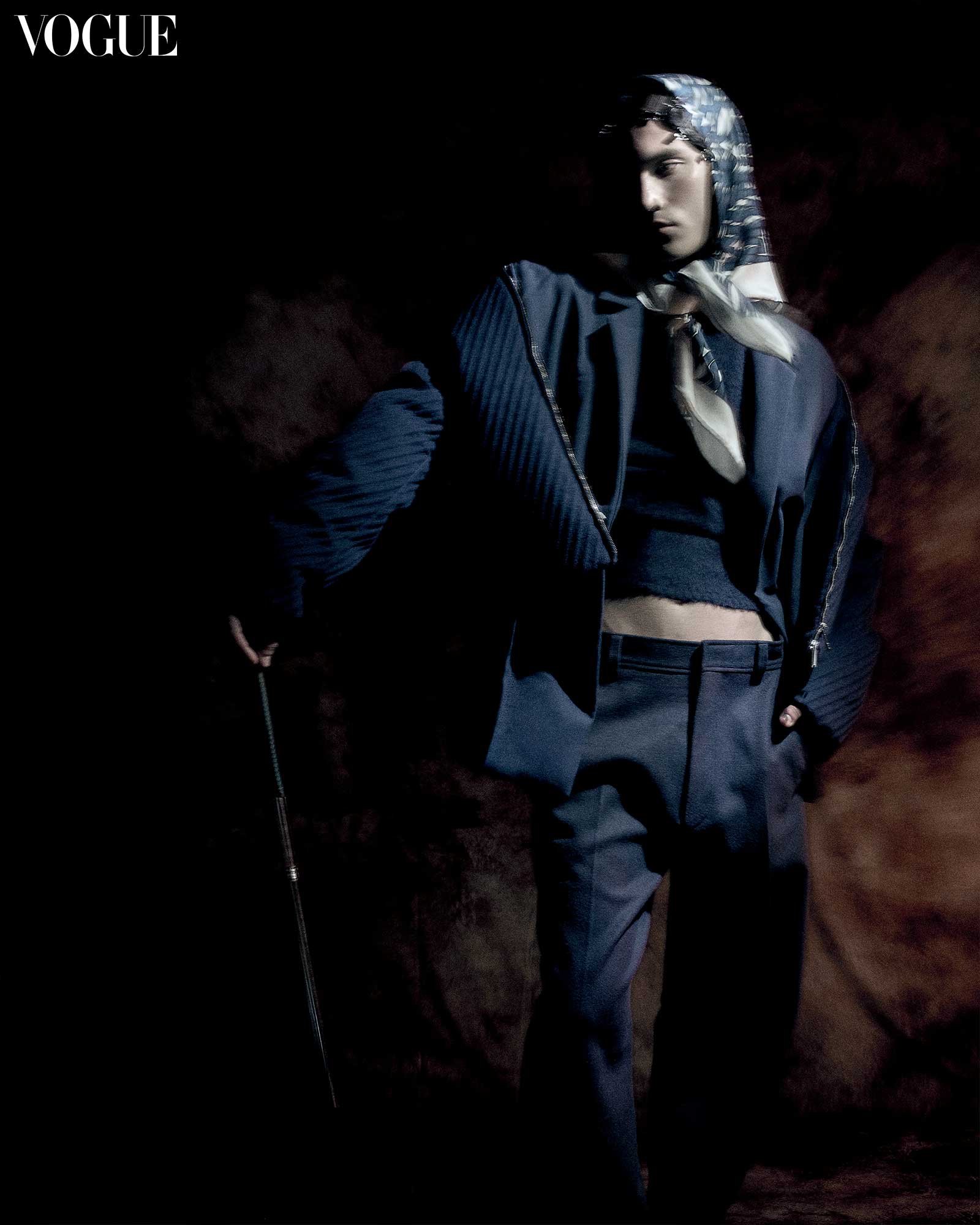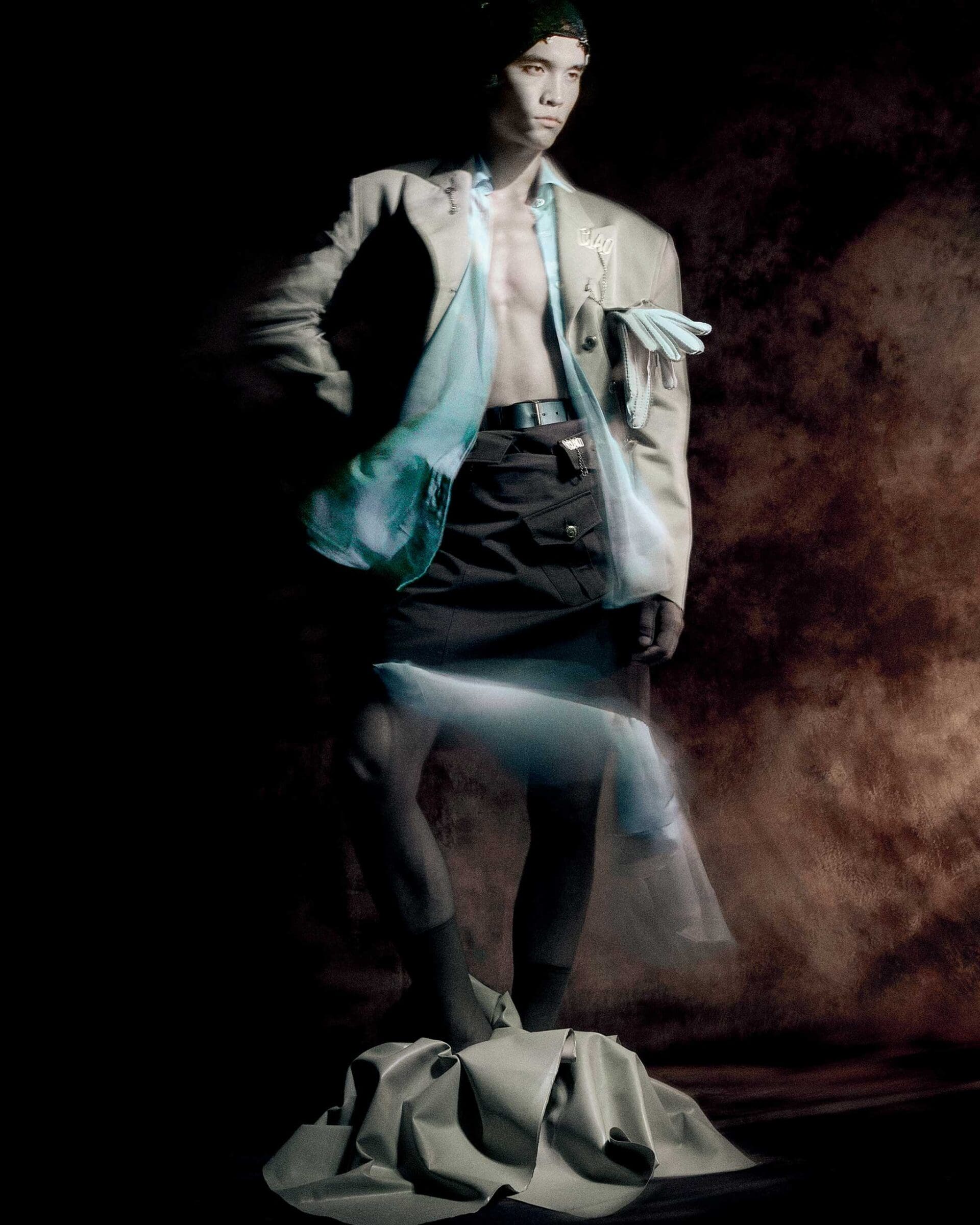 MOSCHINO shirt, blazer, and skirt. CALDEZONIA socks. Photographed by Pedro Braga and styled by Alexandre Dornellas for the September 2024 Issue of Vogue Man Philippines