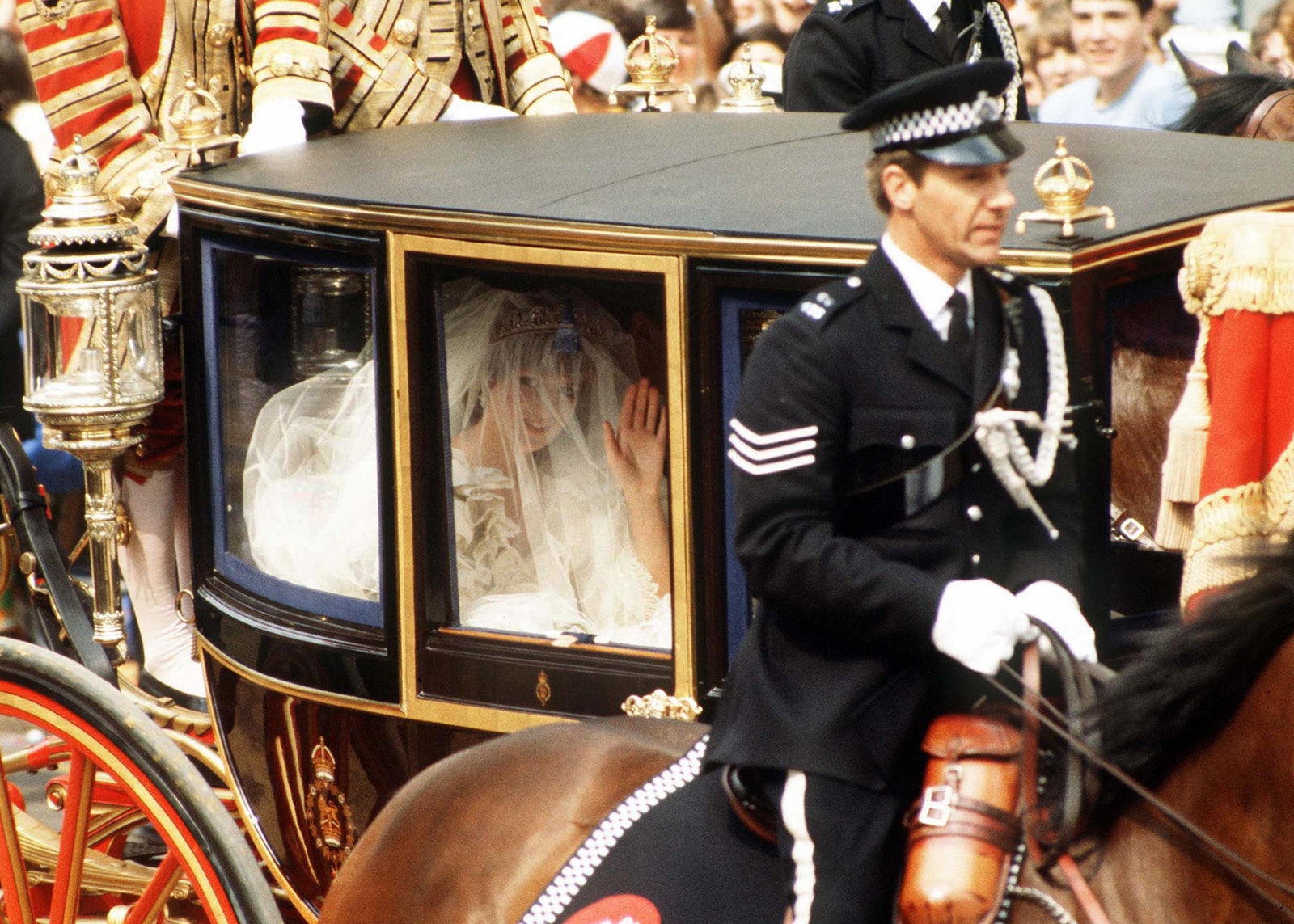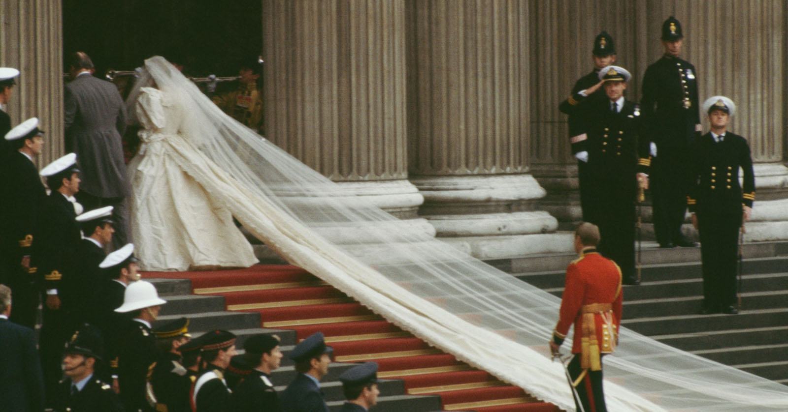 Diana’s veil cascading down her legendary 25ft train, which was secured to her via a carefully crafted mechanism inside her vast skirts, along with a gold horseshoe for luck. Photo: Getty Images