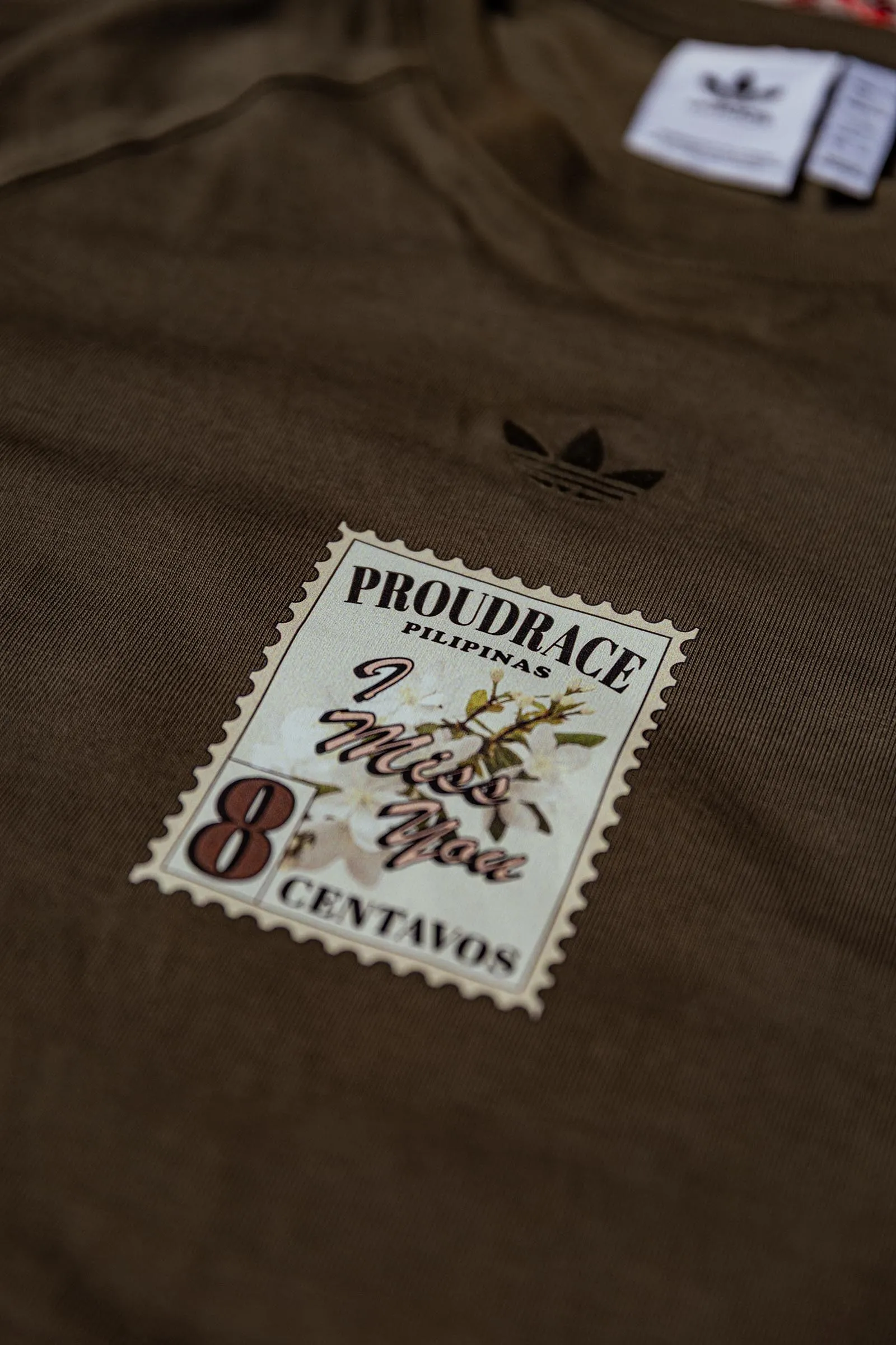 Accompanying Proudrace’s holy grail design are two graphic tees that feel plucked straight from the beachside markets of Boracay or Siargao. “One echoes the aesthetic of classic souvenir shirts, and the other features the collection’s signature ‘I Miss You’ stamp print,” he explains. “It’s a subtle but heartfelt nod to Filipinos everywhere. It’s a reminder to stay connected to their roots no matter where in the world they find themselves.”