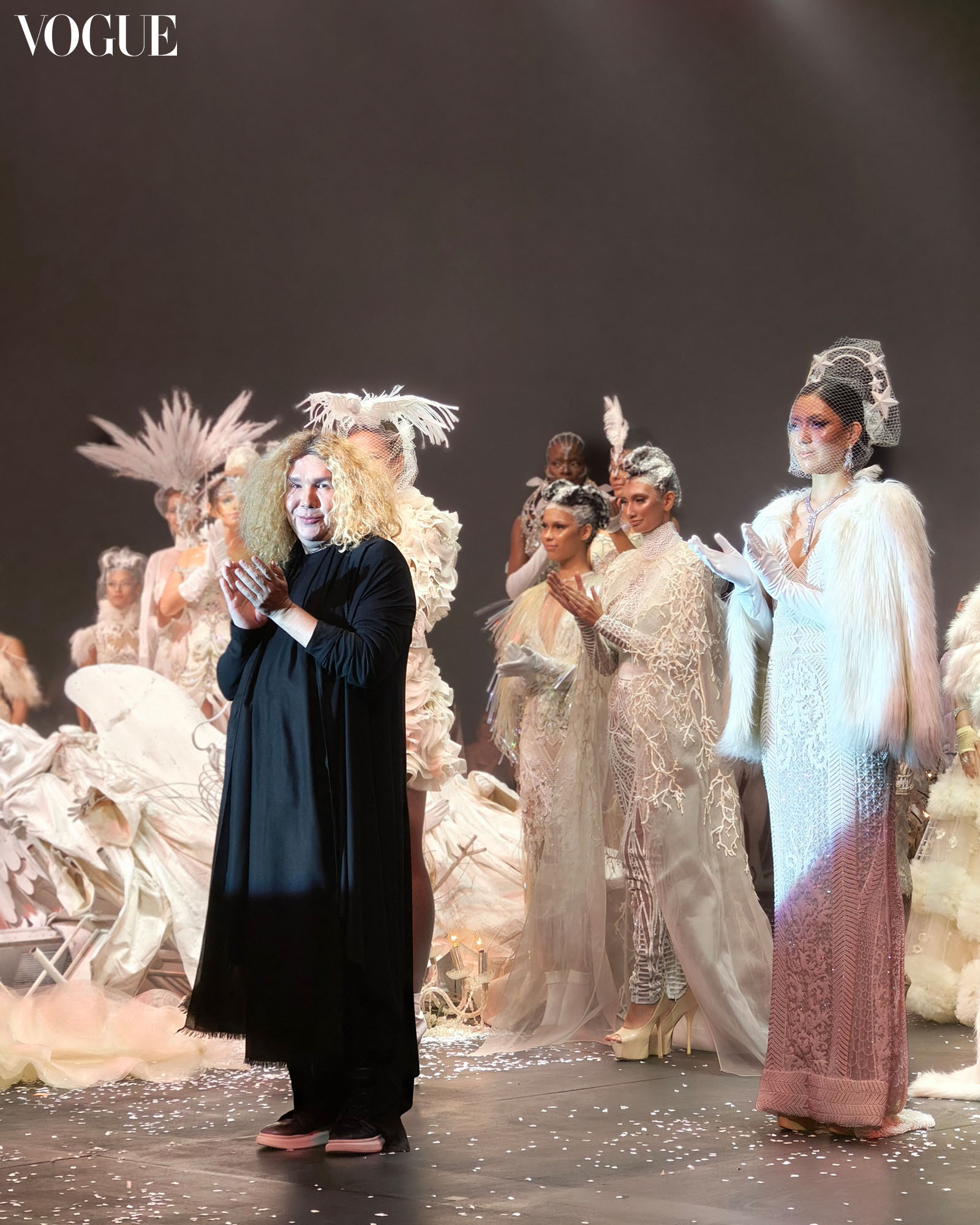 Dubai-based Filipino designer Furne One comes home. To celebrate his 25 years in fashion, the couturier stages a show in Cebu City. Produced by his dear friend, designer Cary Santiago, in partnership with Waterfront Hotel and Diagold, Furne presents a 50-piece collection of all-white ensembles: sculptural bodices bedecked with pearls and gems, cage corsets and crowns that erupt into blooms, delicate tulle dresses juxtaposed by their gothic feeling—ornate embroidery coiling down the length of the gowns.