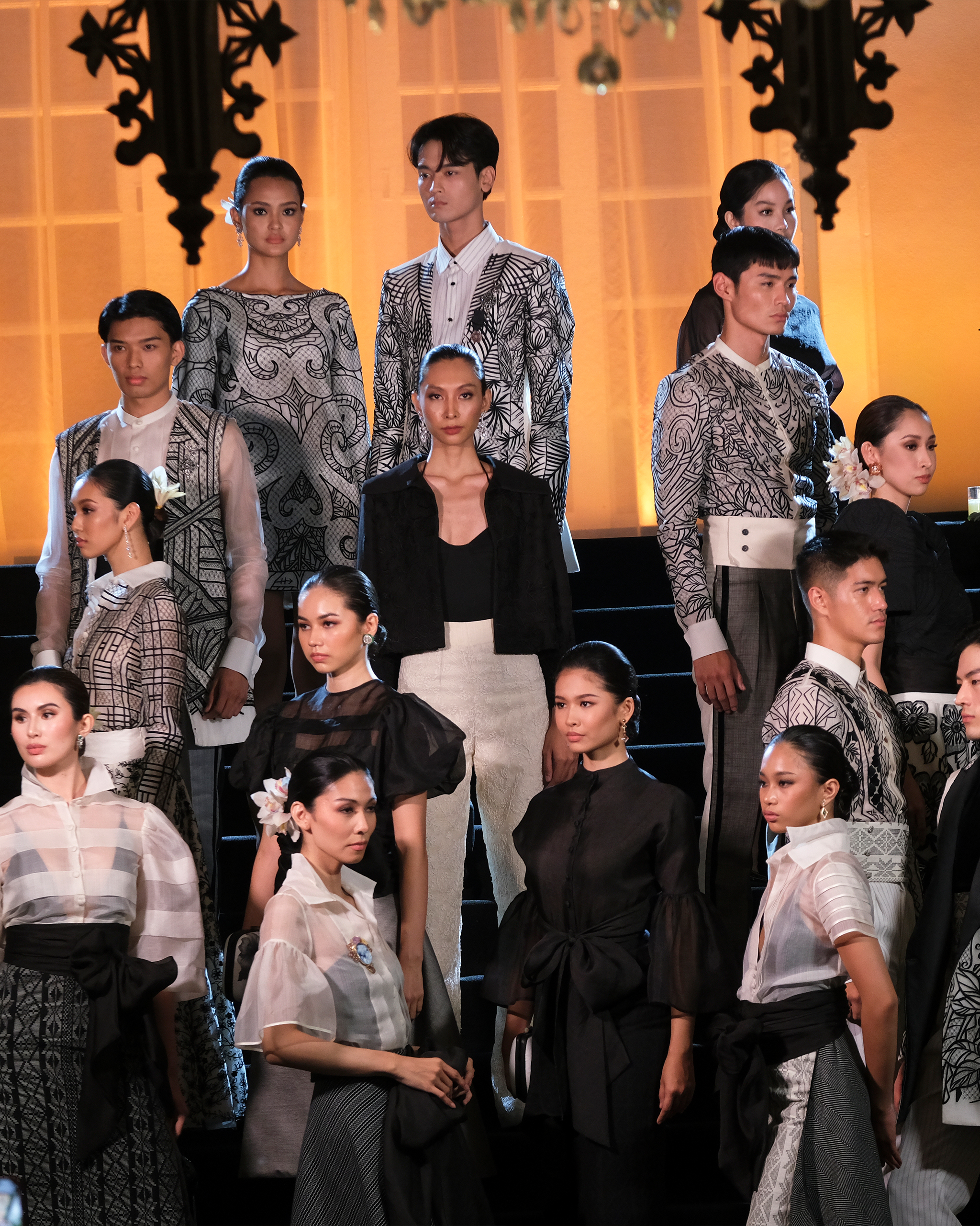 The collection opens with his models lining the historic mansion’s main staircase, gazing onward in stoic poise. One by one, they descend in slow, graceful strides. ‘60s-silhouetted dresses and separates are reminiscent of his signatures: easy, comfortable, classic. All of the garments are black and white—an intentional choice made for the sake of wearability, as well as Bacudio’s desire to spotlight the intricacies one garment can hold. In a fitting tribute to local weavers, each piece is rich with detail: delicate brocades, sweet bows, and meticulous embroidery.