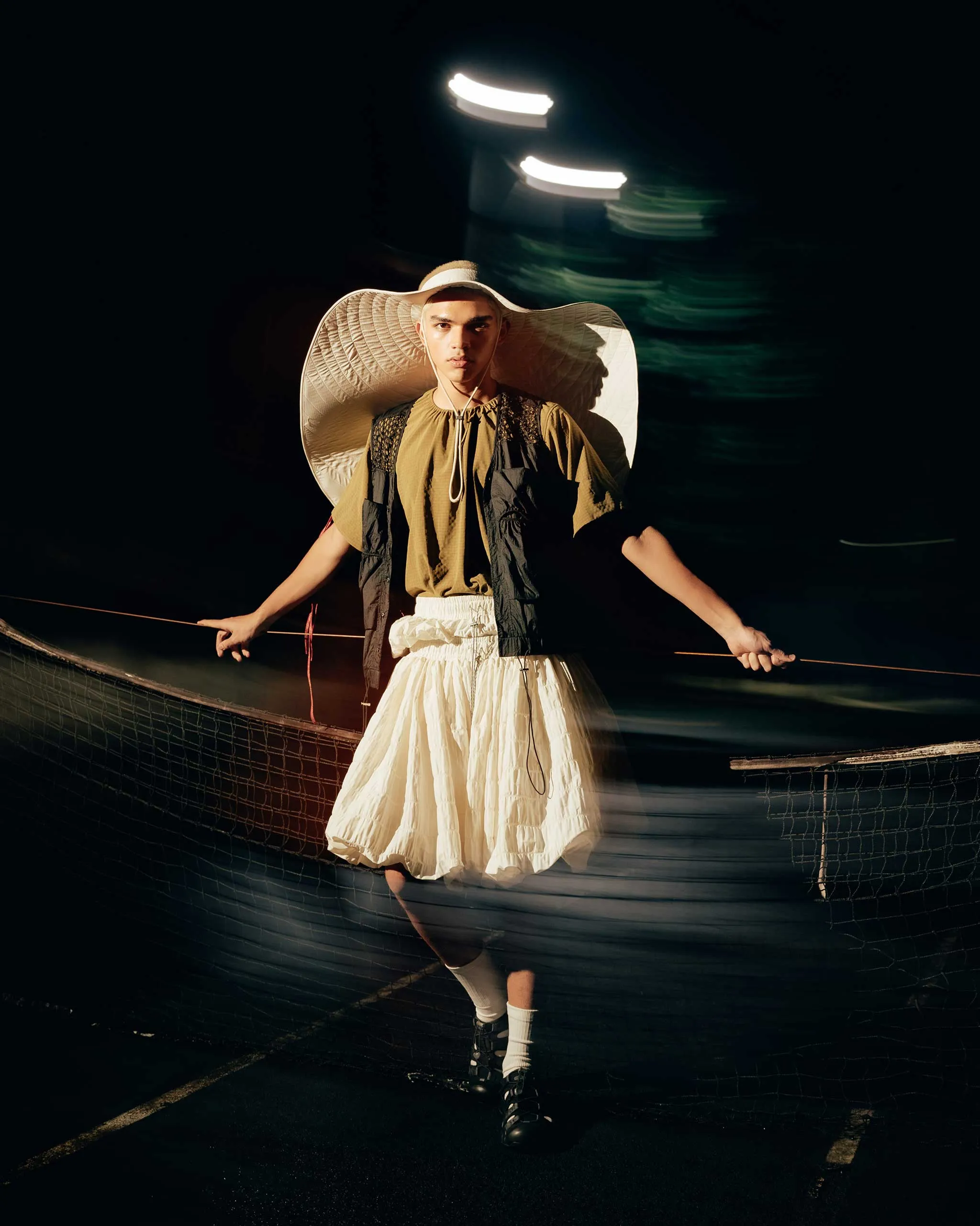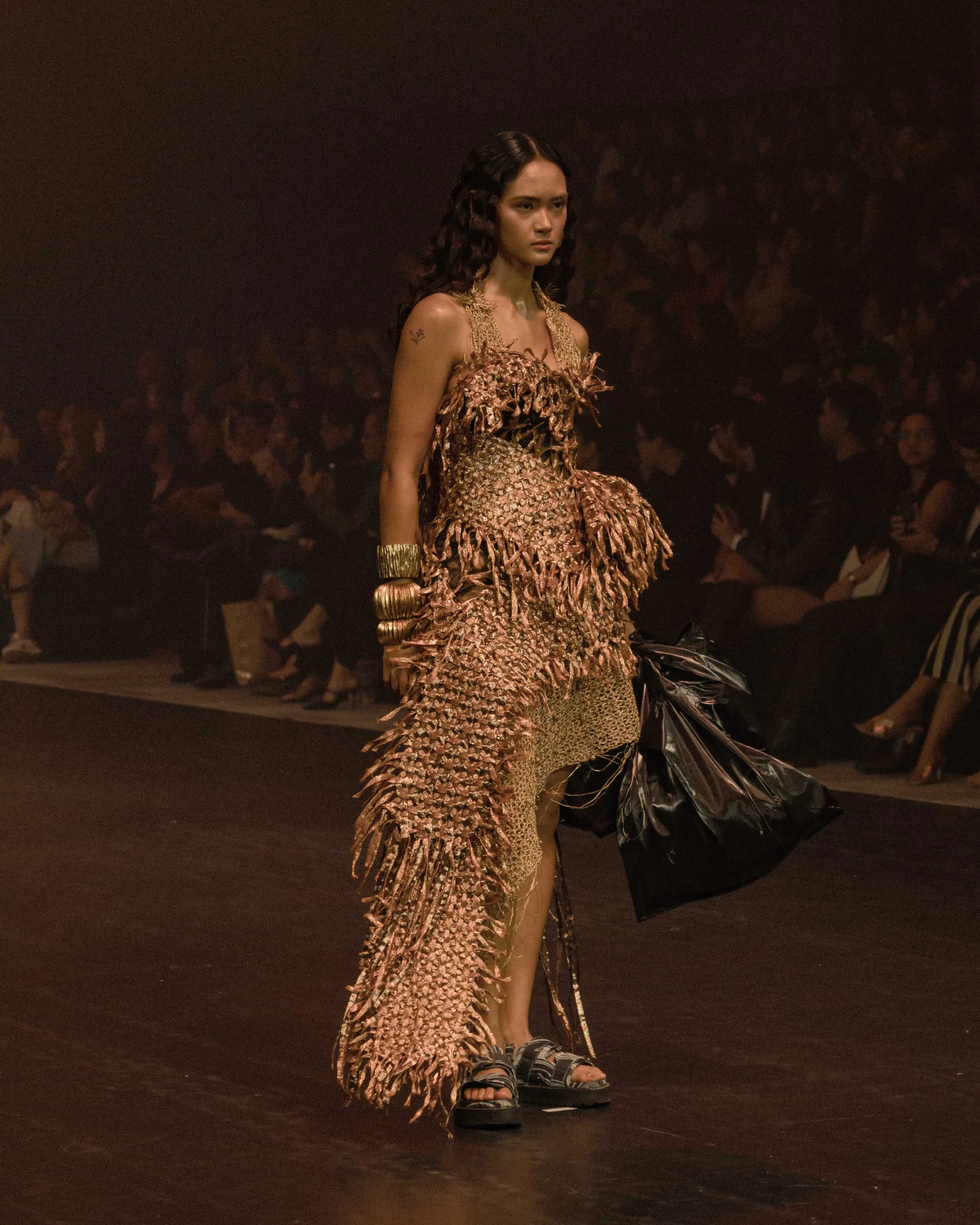 On the runway, that dialogue materialized through texture and silhouette. Gritty urban references, including rusting roofs, signage, and dangling wires, were incorporated into fabric manipulations through layering, distressing, and texturing. These were then balanced with nods to home: native fabrics, references to weaving, and silhouettes that echo traditional forms. “The process was really about balancing those two worlds without romanticizing either one,” he explained. The garments reflected that tension, with silhouettes that were “sharp and assertive, almost armor-like, but always balanced with looseness and drape.” Cuts were “deconstructed yet intentional, exposing process rather than hiding it.”