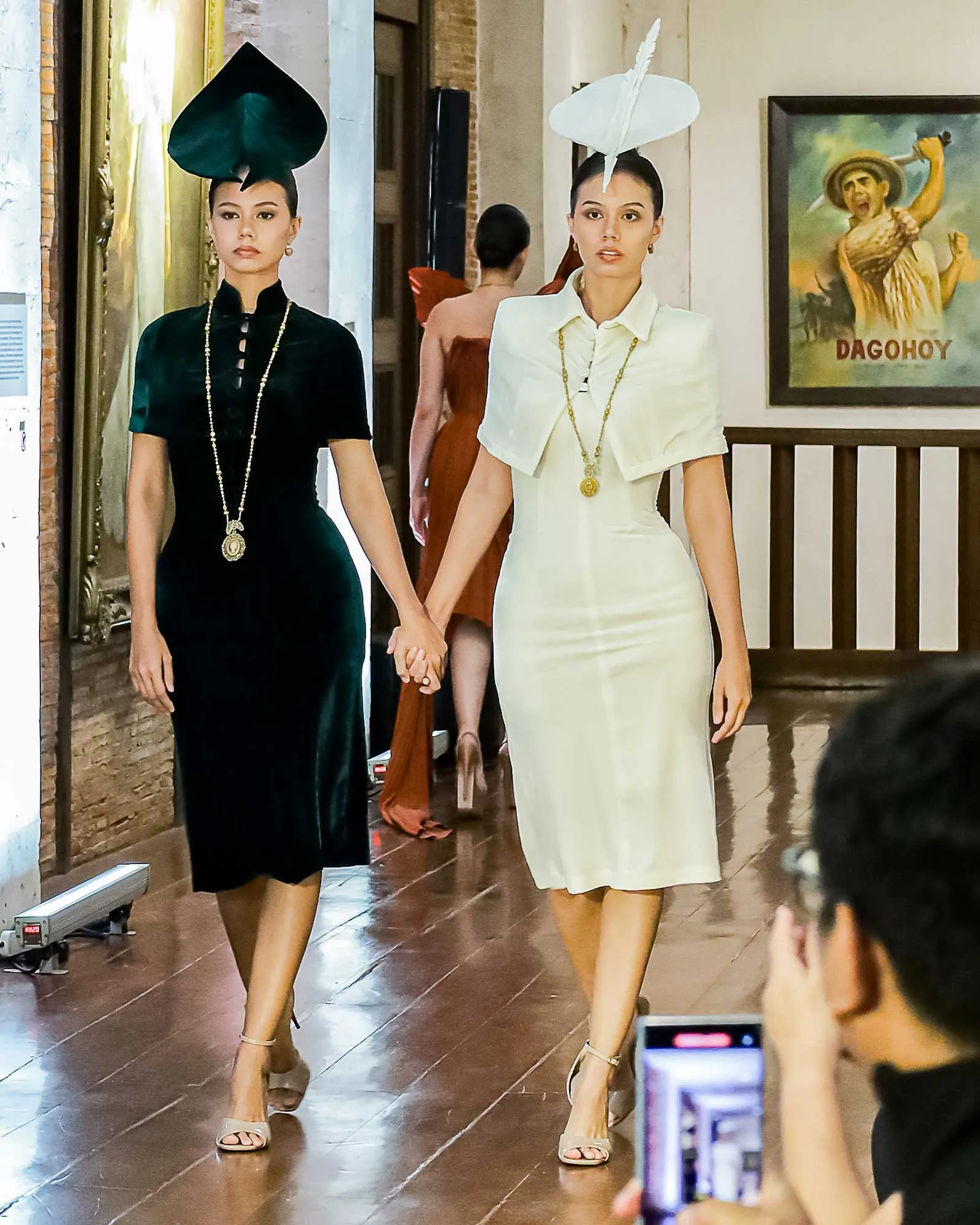 He cites a beige terno cascading with sparse fringes adorned with marble-sized spheres, which call back to the summer tradition of picking lomboy or java plum fruits. Simultaneously, it can also allude to seeds of buri palm trees, used to make raffia. (Their pieces, crafted from piña cocoon, velvet, and jersey, also included leftover raffia from their former collection.) Their menswear is mostly interpreted in white and cream, inspired by garbs of asin tibuok traders who used to exchange their artisanal salt for rice and produce; canvases, like all their other looks, embellished with antique Filipino jewelry sourced from all over the country by Michael Amores and Janssen Bantugan.