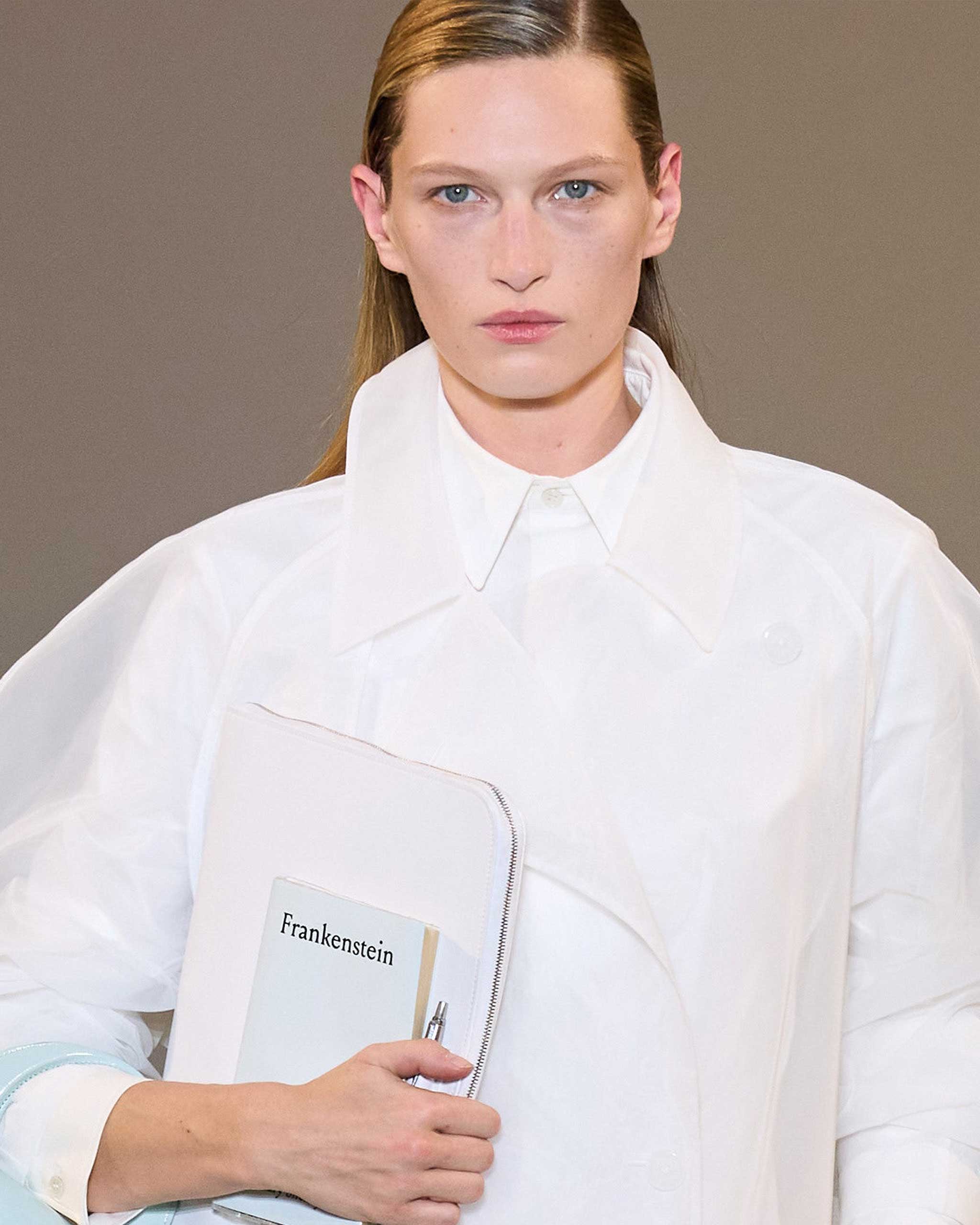 At Delcore, the first model walked out carrying a copy of Mary Shelley’s Frankenstein.Photo: Filippo Fior / Gorunway.com