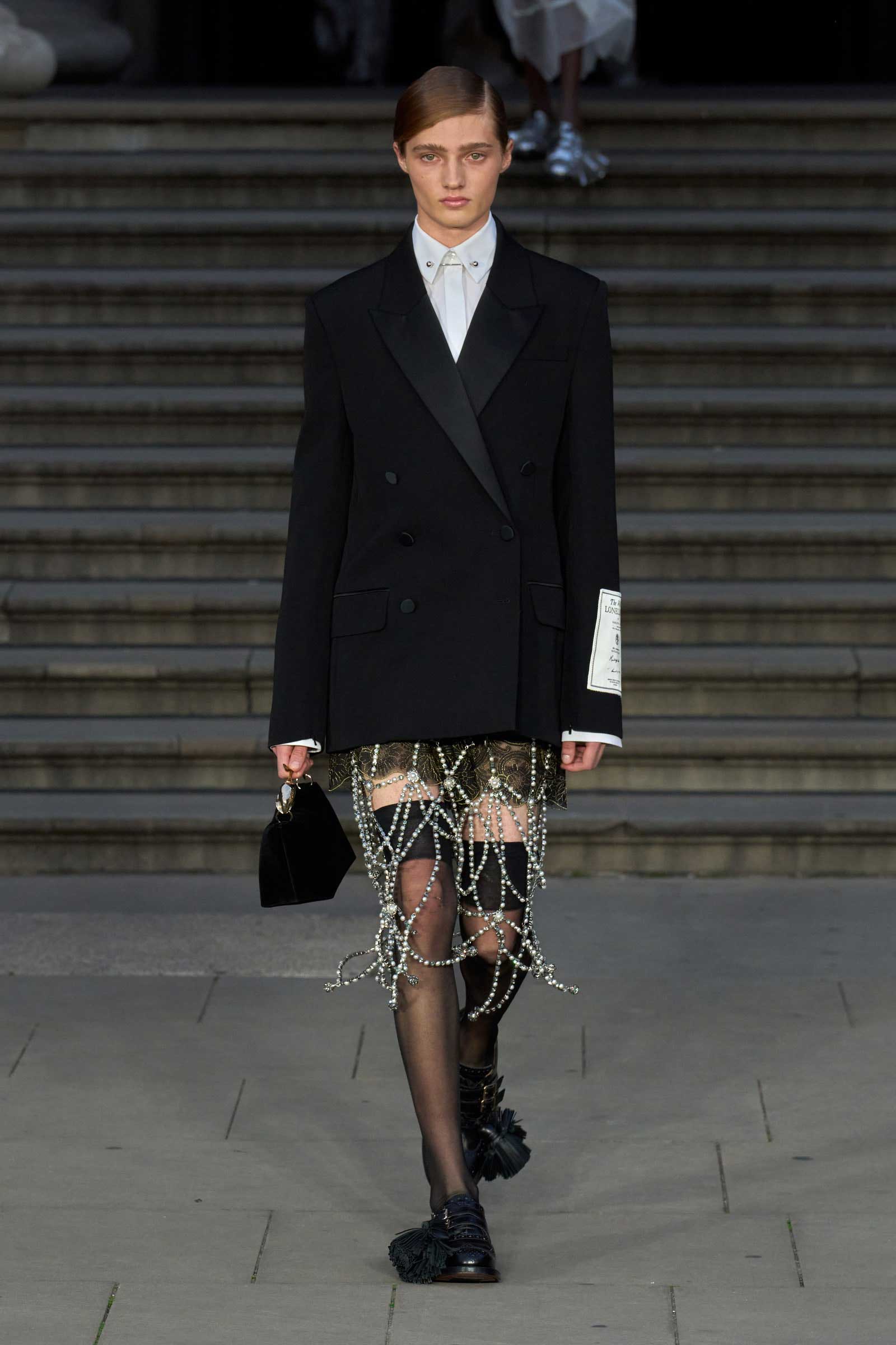 At JW Anderson, meanwhile, Jonathan Anderson cited Clive Bell, a British art critic who formed part of the Bloomsbury Group, an informal coterie of writers and artists (and interestingly, an economist) who shared the value that one’s main purpose in life was love, creativity, beauty, and “the pursuit of knowledge.” Anderson printed an excerpt from an essay on art and design by Bell across dresses and shredded knits. He didn’t go into detail about the inspiration but rather told Mower that it was a reflection of his thoughts on the fashion industry. “It’s more like this idea of starting from a blank page. Where is the next decade going, and how do we work with it?” Previously, Anderson cited Susan Sontag’s “Against Interpretation” at the Loewe spring 2025 menswear show, and shared an excerpt from a Danielle Steele novel, The Affair, with guests ahead of the Loewe fall 2021 show.