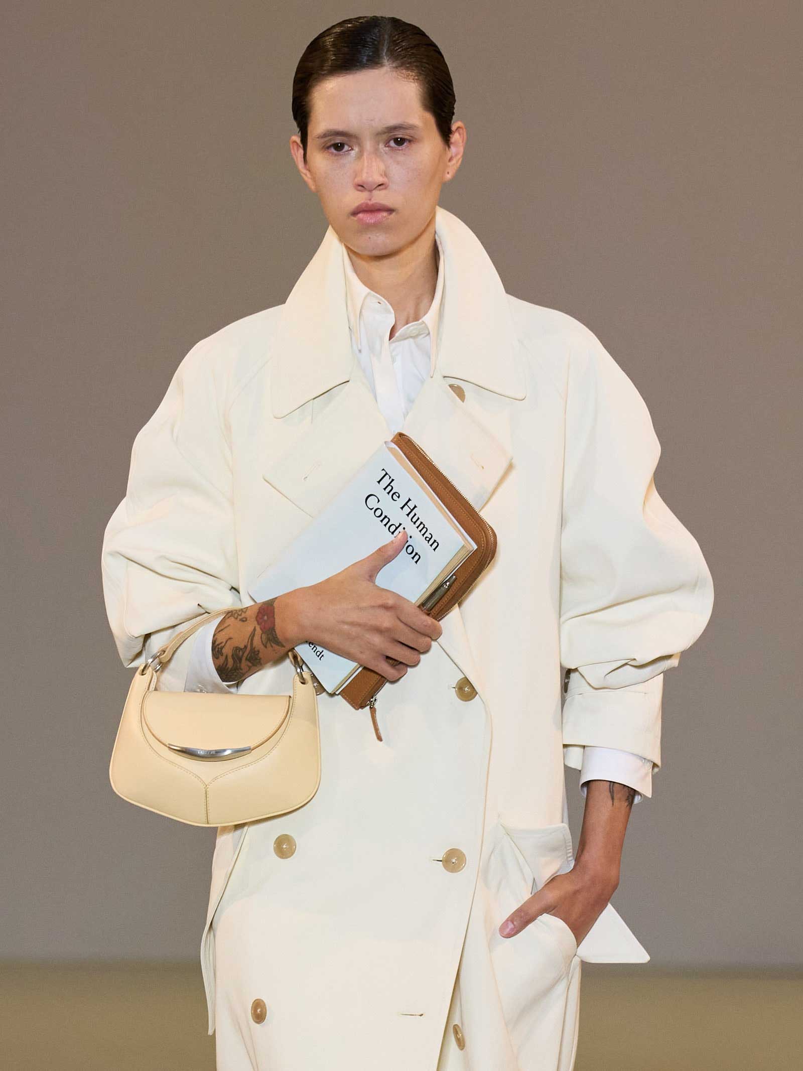 A model carries Hannah Arendt’s The Human Condition at Delcore’s spring 2025 show. Photo: Filippo Fior / Gorunway.com