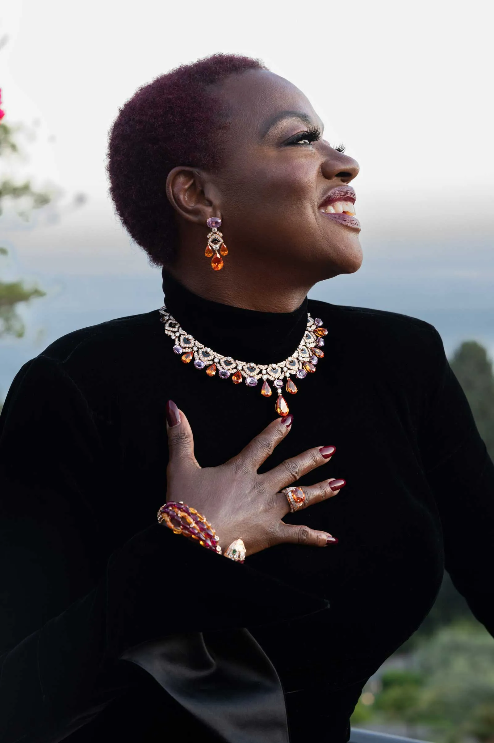 As always the Bulgari brand ambassadors were front and center. Priyanka Chopra had traded her whopping emerald for a more petite (read: still quite sizable) diamond and pink spinel, garnet, and sapphire Serpenti necklace with matching bracelet. Blackpink’s Lisa in a white and yellow diamond collar, and new Bulgari partner Viola Davis in a diamond, garnet, and minister collar. All were heard congratulating Silvestri on her creativity at the end of the jewelry show and ballet performance.