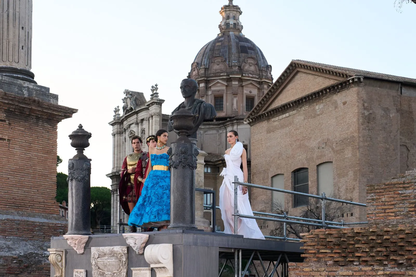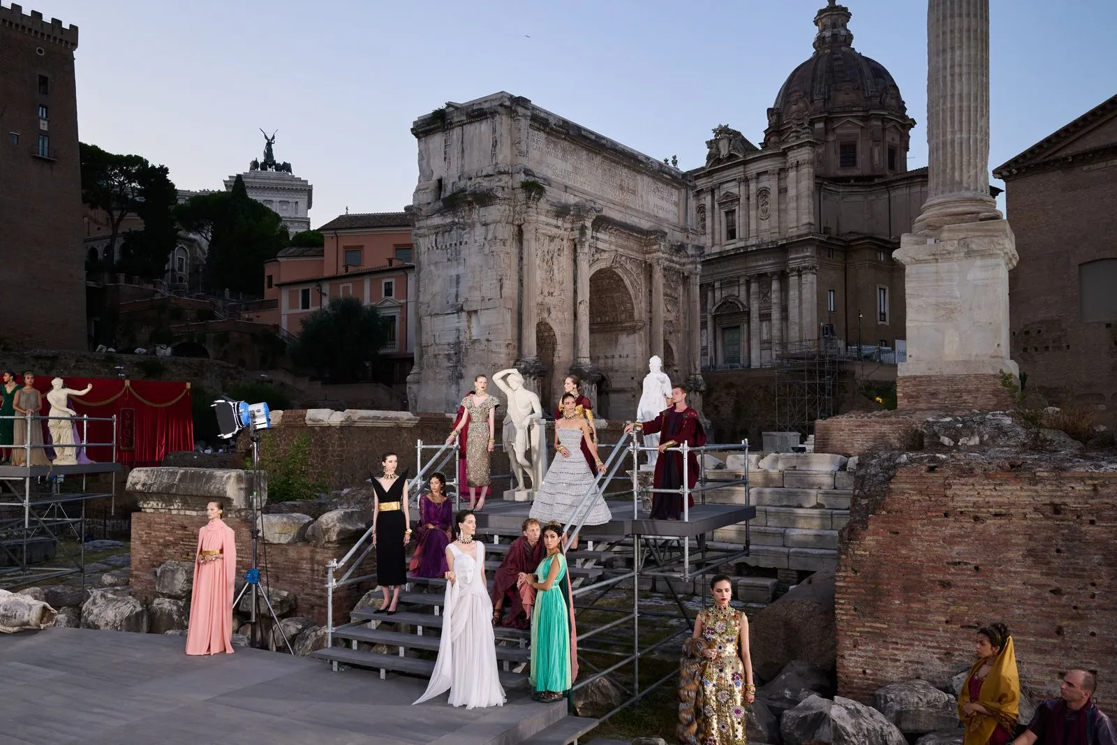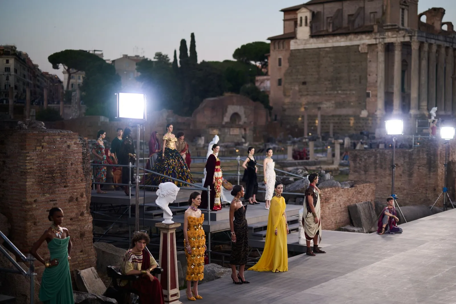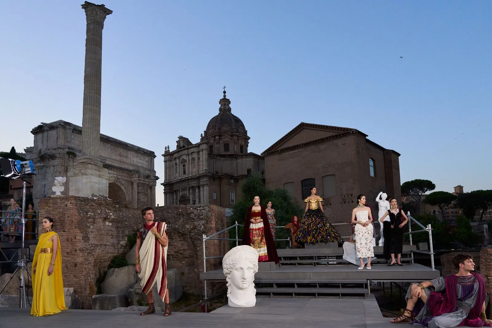 The Roman Forum at dusk—that was the monumental setting for Dolce & Gabbana’s Alta Moda show tonight. The collection, which paraded down the Via Sacra, the first street in Ancient Rome, paid homage to both the city’s historical classicism and its 1950 and ’60s excesses, though a guest who knows the difference observed it was more Satyricon than La Dolce Vita.