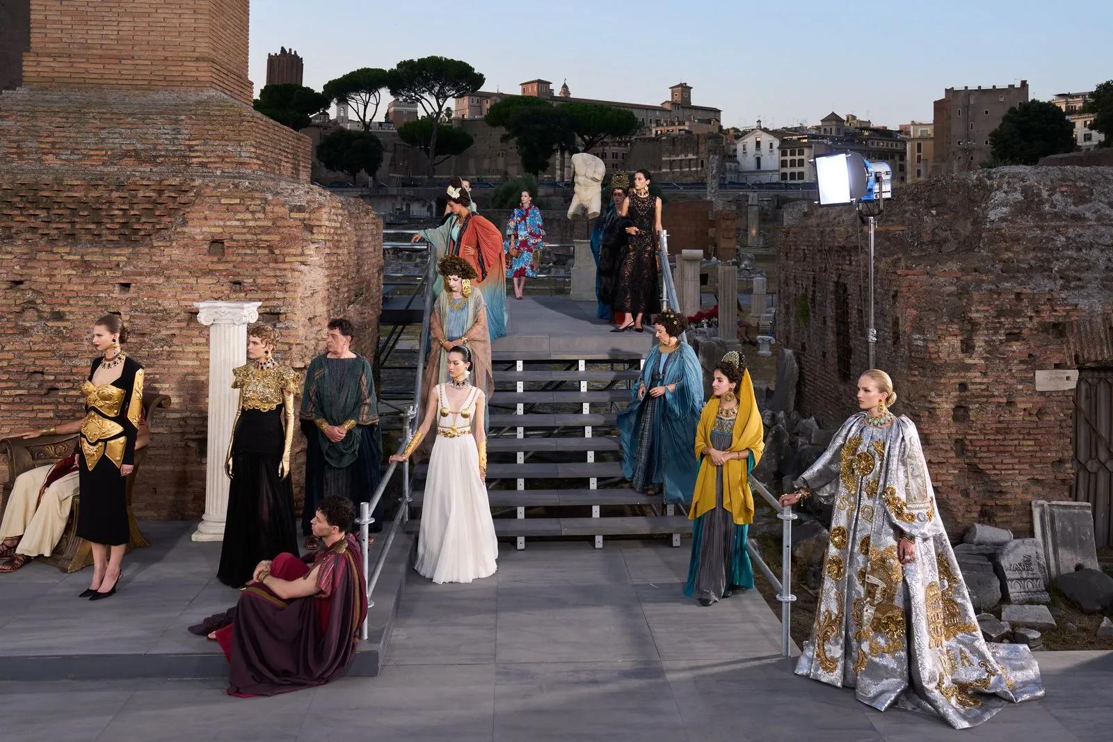 Not far from the Basilica of Maxentius, a Julius Caesar-type and a lyre player took pictures with guests; curly haired men in colorful robes basked in the golden hour sun on the steps of the Temple of Antonius and Faustina; and in the central piazza under the shadow of the Temple of Castor and Pollux, theater troupes, armored soldiers, and vestal virgins crisscrossed the runway as people took their seats. It was a feast for the eyes—and that doesn’t even take into account the 450-plus Dolce & Gabbana clients from around the world who descended on the Eternal City for the show, each one trying to outdo the other in haute couture and high jewelry. Surrealismo!