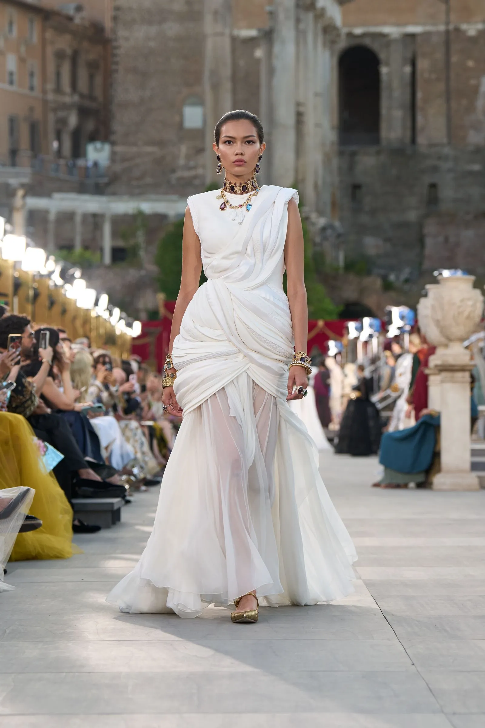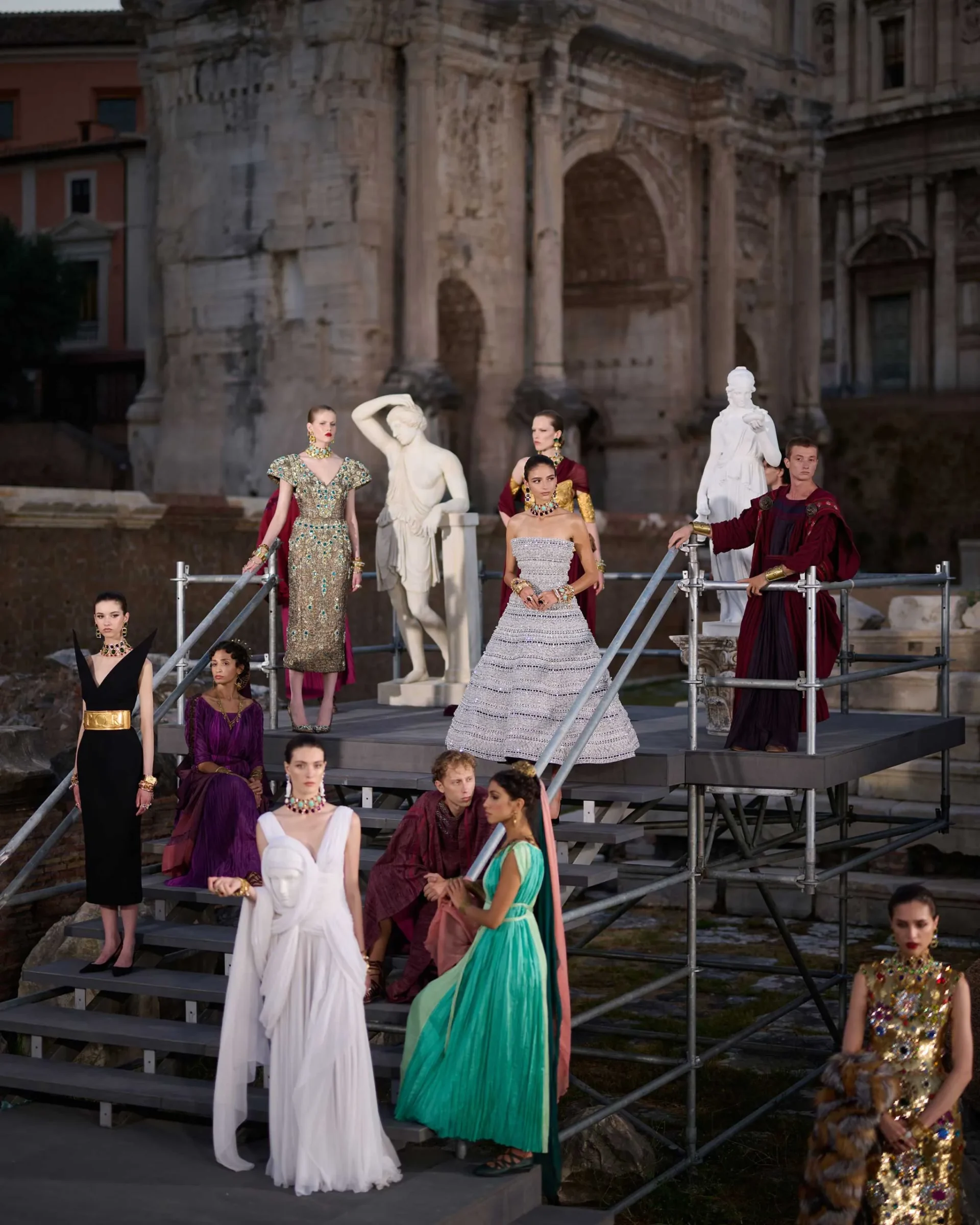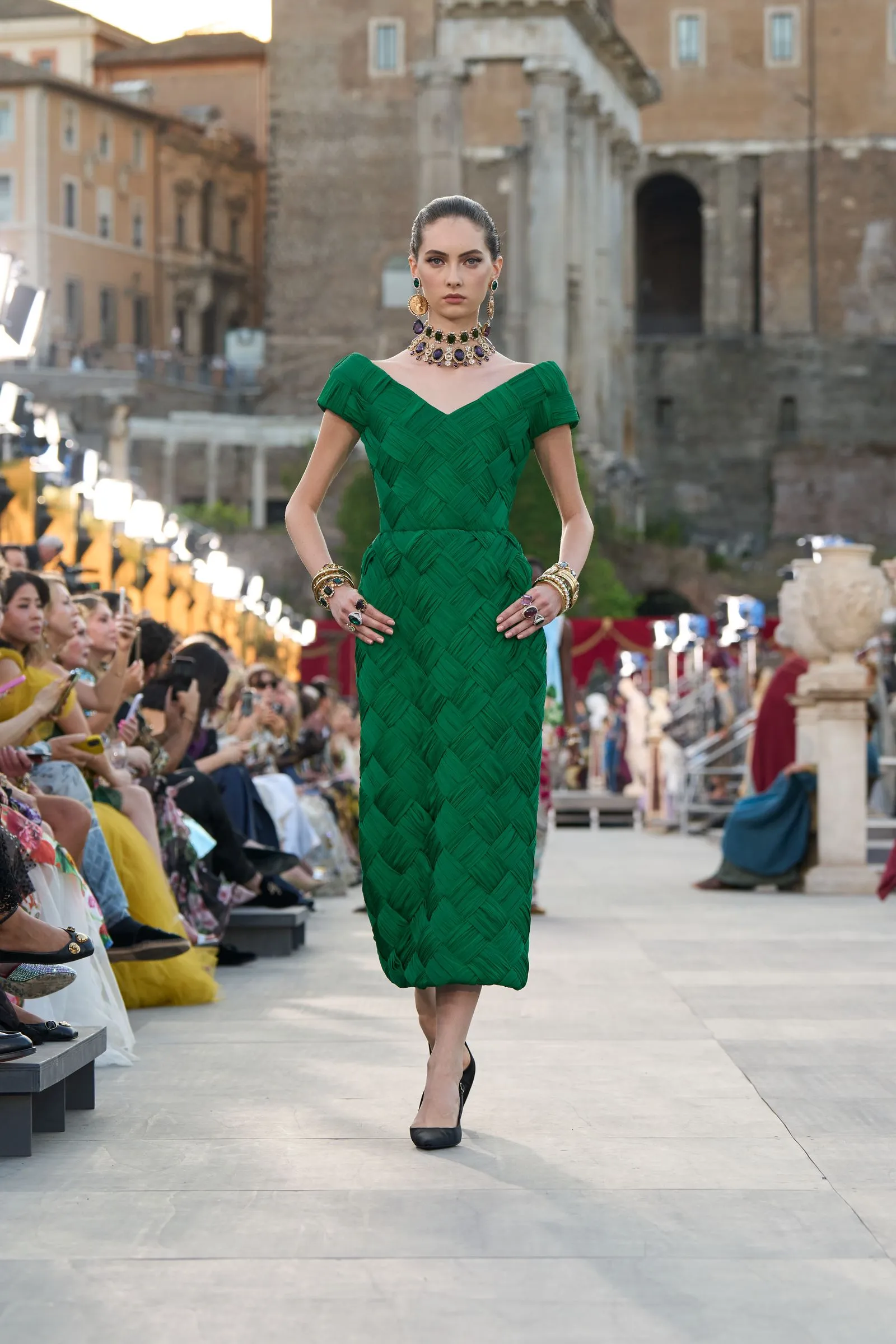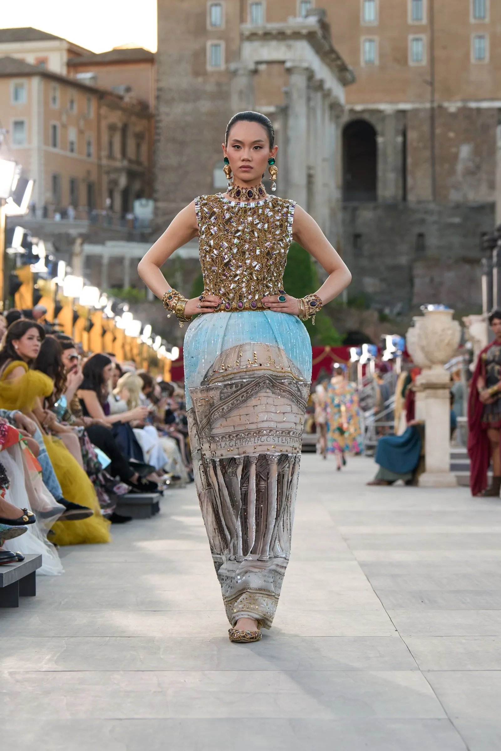 Domenico Dolce and Stefano Gabbana have been making Alta Moda collections for 12 years, building their clientele not just with their one-of-a-kind clothes, but with their spectacular locations: Taormina and Siracusa in Dolce’s native Sicilia, Venezia, Napoli, Portofino—the list goes on. Why put off Rome for so long? Dolce, who took his bow solo, having watched the show from the front row alongside Cher, Erling Haaland, Isabella Rossellini, and Christian Bale said, quite simply, “these people have a vision about beauty.” (Gabbana could not attend for family reasons.)