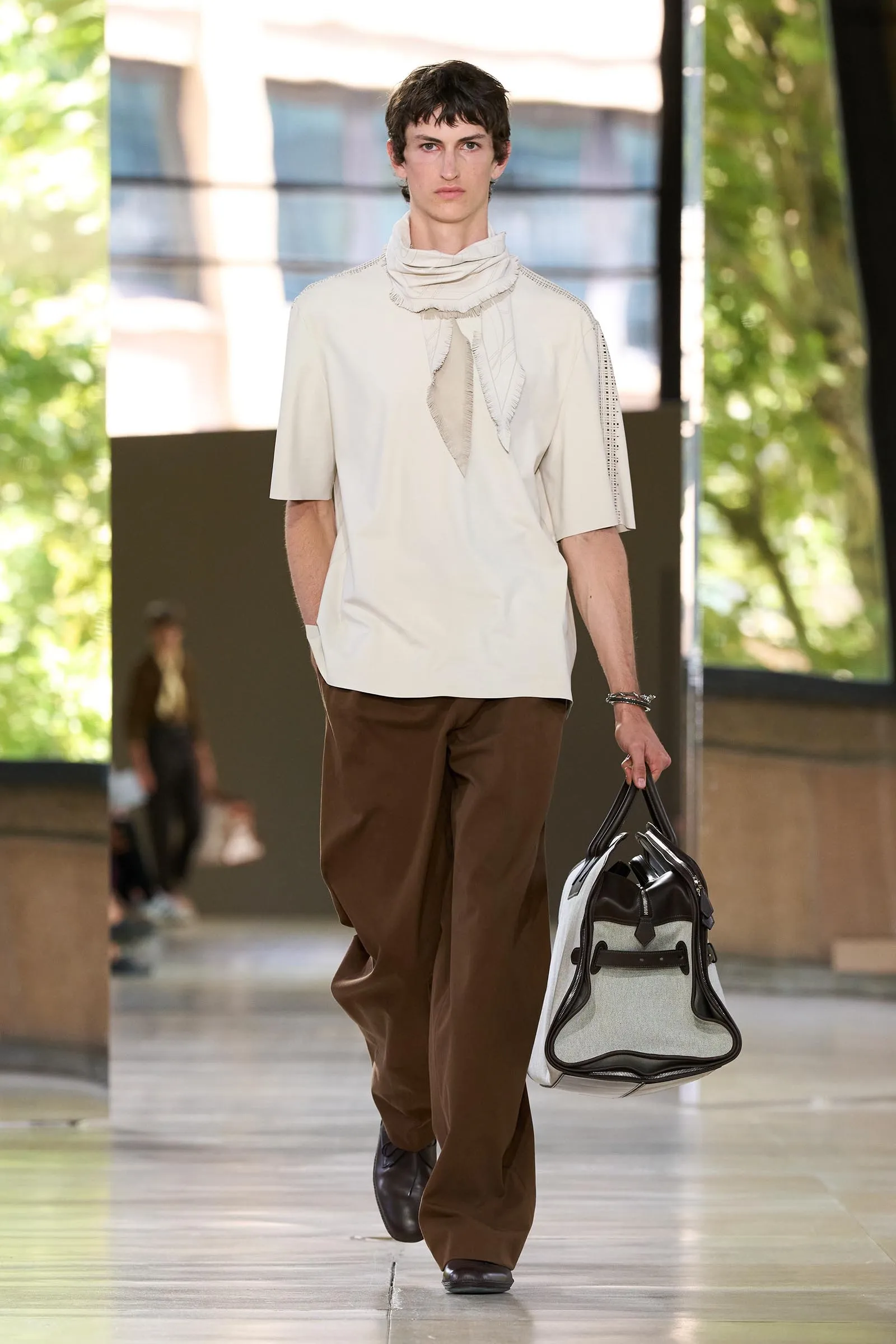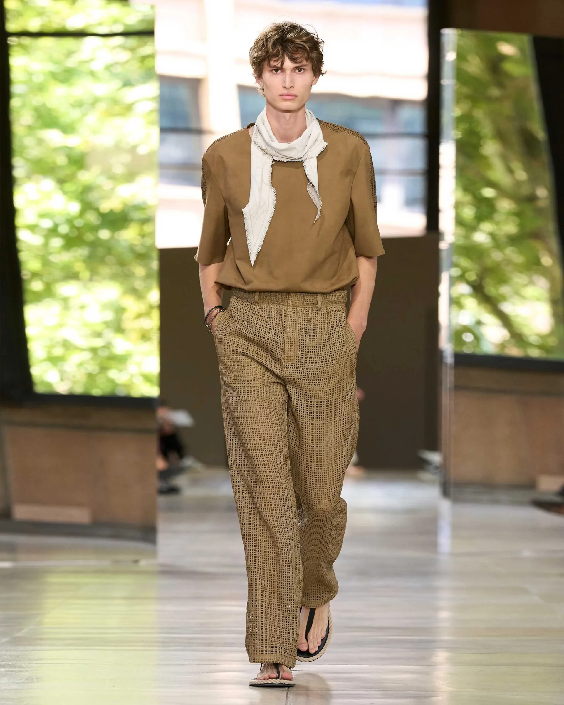 This playful tension of refinement and ease echoed throughout the entire show. Rather than presenting fashion as something static or sacred, Nichanian allowed it to breathe and reflect: “Never enclosed in the rules; playing at the edge, opening space, always.” The Hermès man walks with purpose to his desired destination. Once again, attendees left the show not only anticipating their next trip out of town, but with a clearer picture of what to wear by the time their summer vacation comes.