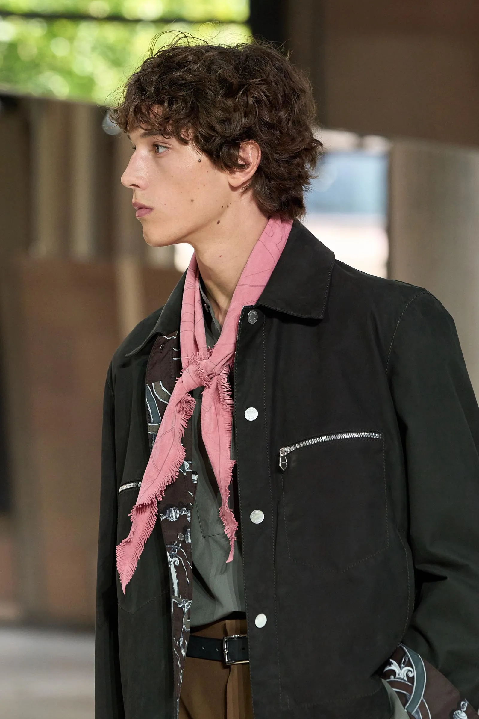 This season, designer Véronique Nichanian sought to capture summer-in-the-city for the man who is constantly on the move. From the moment the first model stepped out in Look 1, an air of laid-back elegance immediately filled the room. Polished yet somewhat disheveled in its styling, there was a juxtaposition of textures and materials, from cotton t-shirts with ribbing paired with calfskin overskirts to leather blouson jackets accessorized with silk twill bandanas. Other standouts included open leatherwork weaves on tops and jackets that were incredibly intricate, as well as a light knit featuring a sharp, zigzag pattern that echoed the set’s angular geometry.