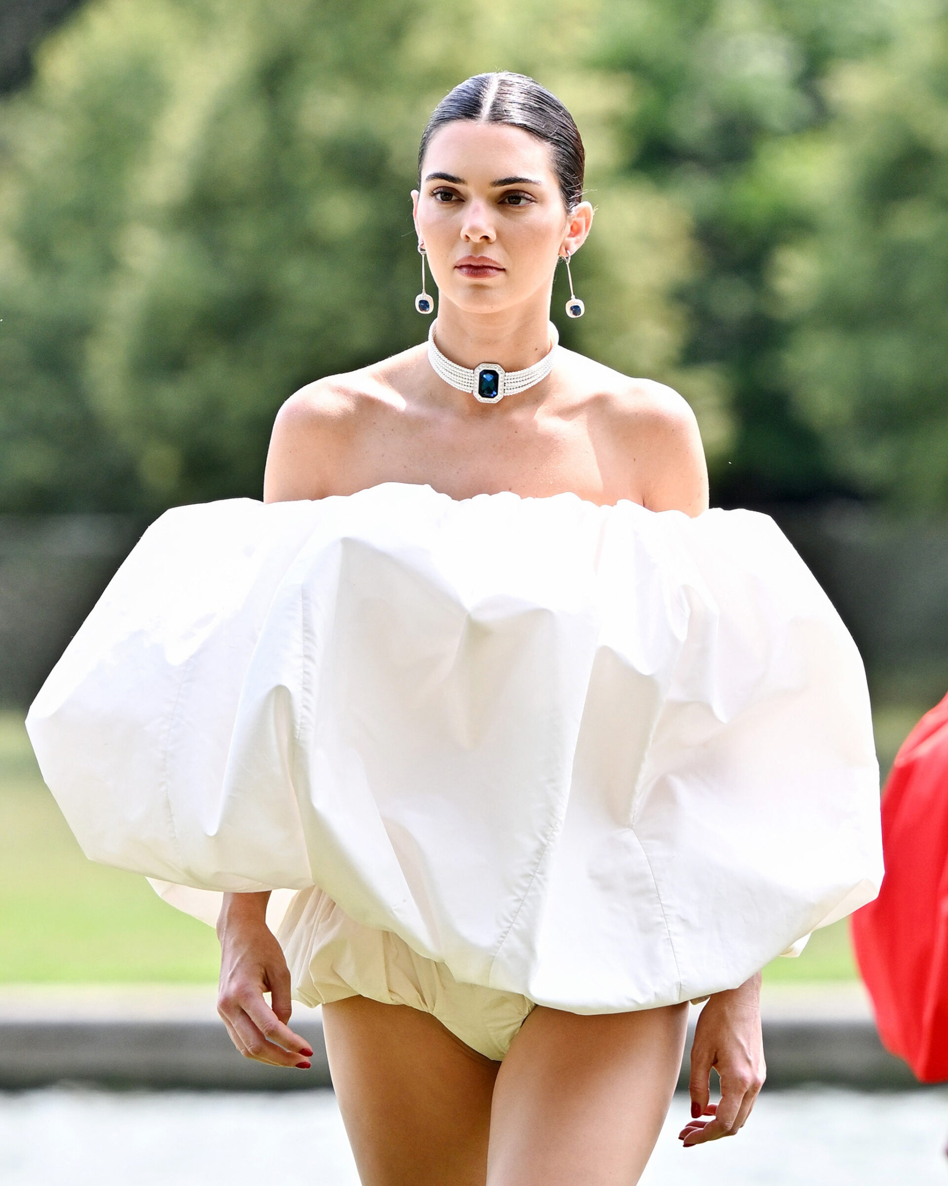 Kendall Jenner, meanwhile, turned heads in a puffy white romper suit accessorized with a spectacular multi-strand sapphire necklace, apparently inspired by Princess Diana’s favorite choker. Made up of strands of pearls with a spectacular sapphire as the centerpiece, the late Princess of Wales memorably wore her necklace with her Christina Stambolian “revenge dress” in 1994. Diana was on Simon Porte Jacquemus’ mood board for the collection.