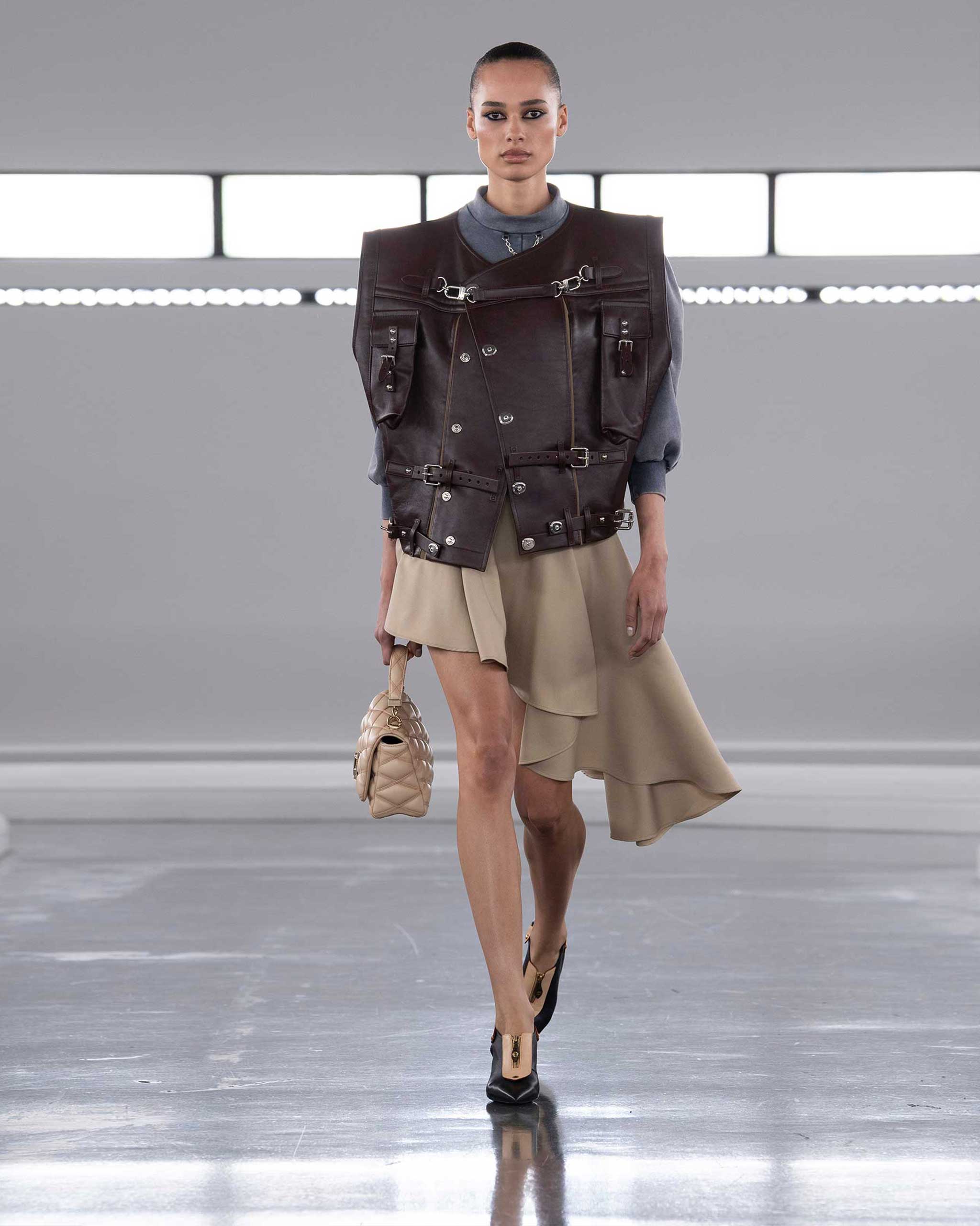 The last looks held oversized leather vests decked with silver hardware, fur-topped cropped coats, and dresses bubbled up to evocative volumes, in the neutrals diffused across his grand 10th-anniversary show at the Cour Carée du Louvre. With this collection immediately following that sentimental, self-referential show, Ghesquière’s designs have never felt more assured. As he pulls from his design signatures and imbues in them a sense of newness, he spurs a line of direction toward a destination we can’t wait to traverse next.