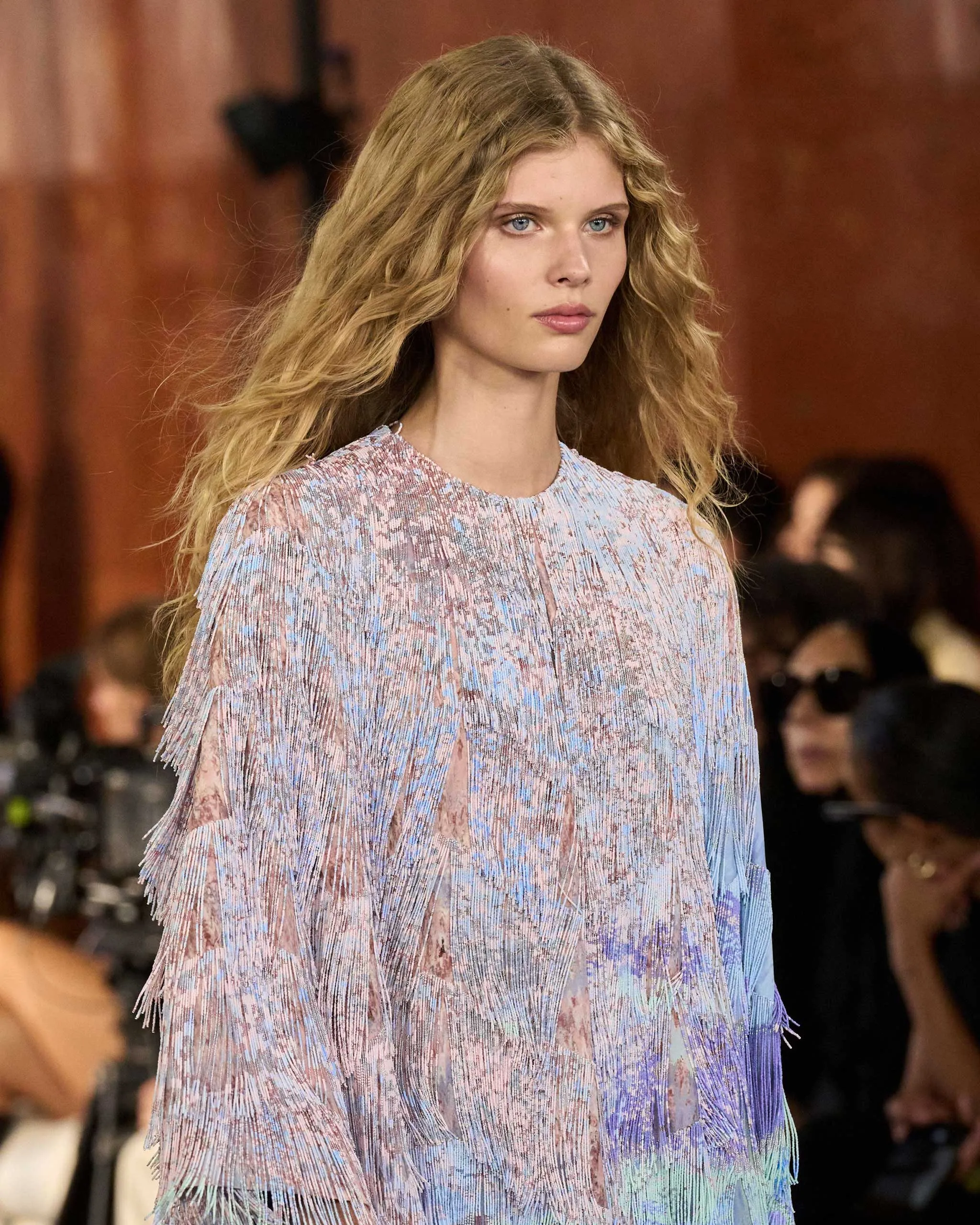 The palette was soft and lived-in, featuring pale blues, powdered pinks, soft greys, creams, taupes, and browns, punctuated by burnt terracotta and flashes of metallic accessories. Textural details whispered their own stories; raindrop beaded fringing, detachable elongated collars, and shaggy Afghan-trimmed jackets equally at home in a 1970s living room.
