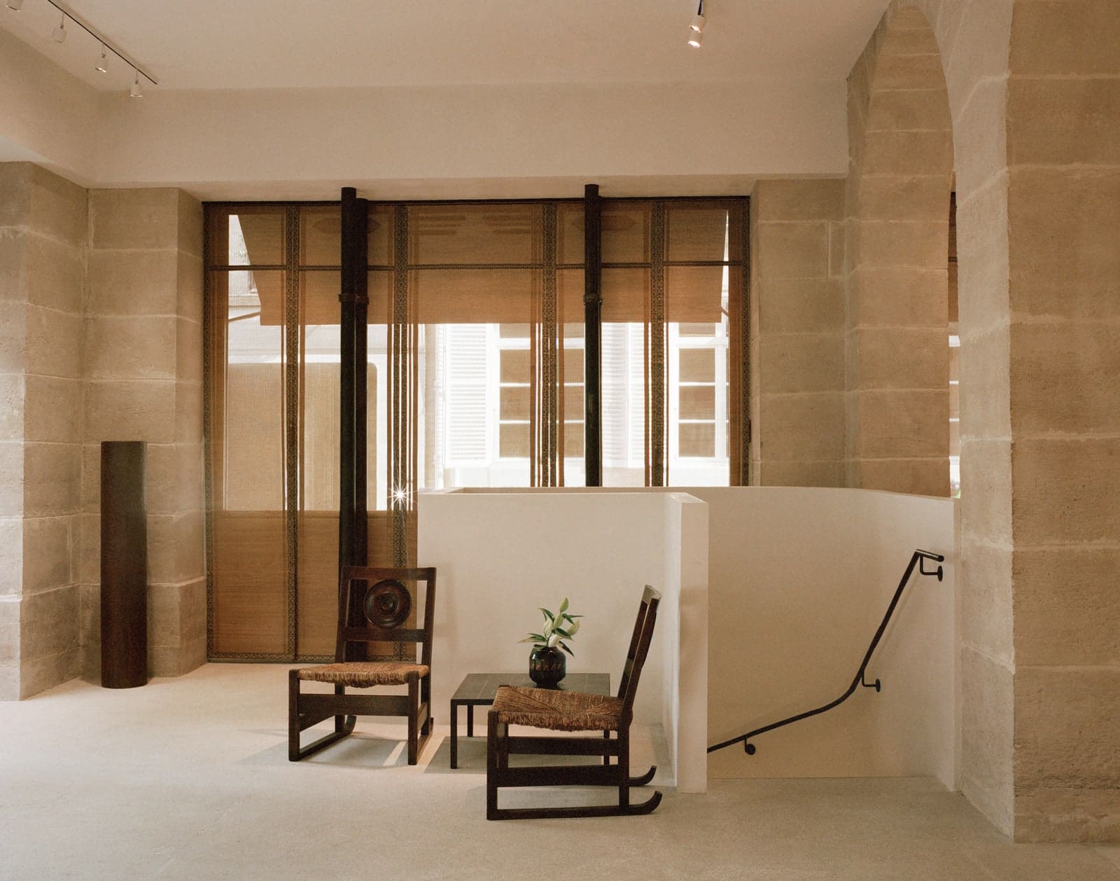 Unlike so many boutiques which want to shock and awe by exalting luxury and status before greeting you (rather incongruously) with a barrage of product which rather defeats that whole intention, no such ploys are in play here: The store opens straight into a welcoming, almost domesticated seated area, with two wooden Traineau chairs by Victor Courtray which date from 1940, a mix of homespun rush seating and a back of geometric lines, which flank a black 1955 Georges Jouve coffee table.