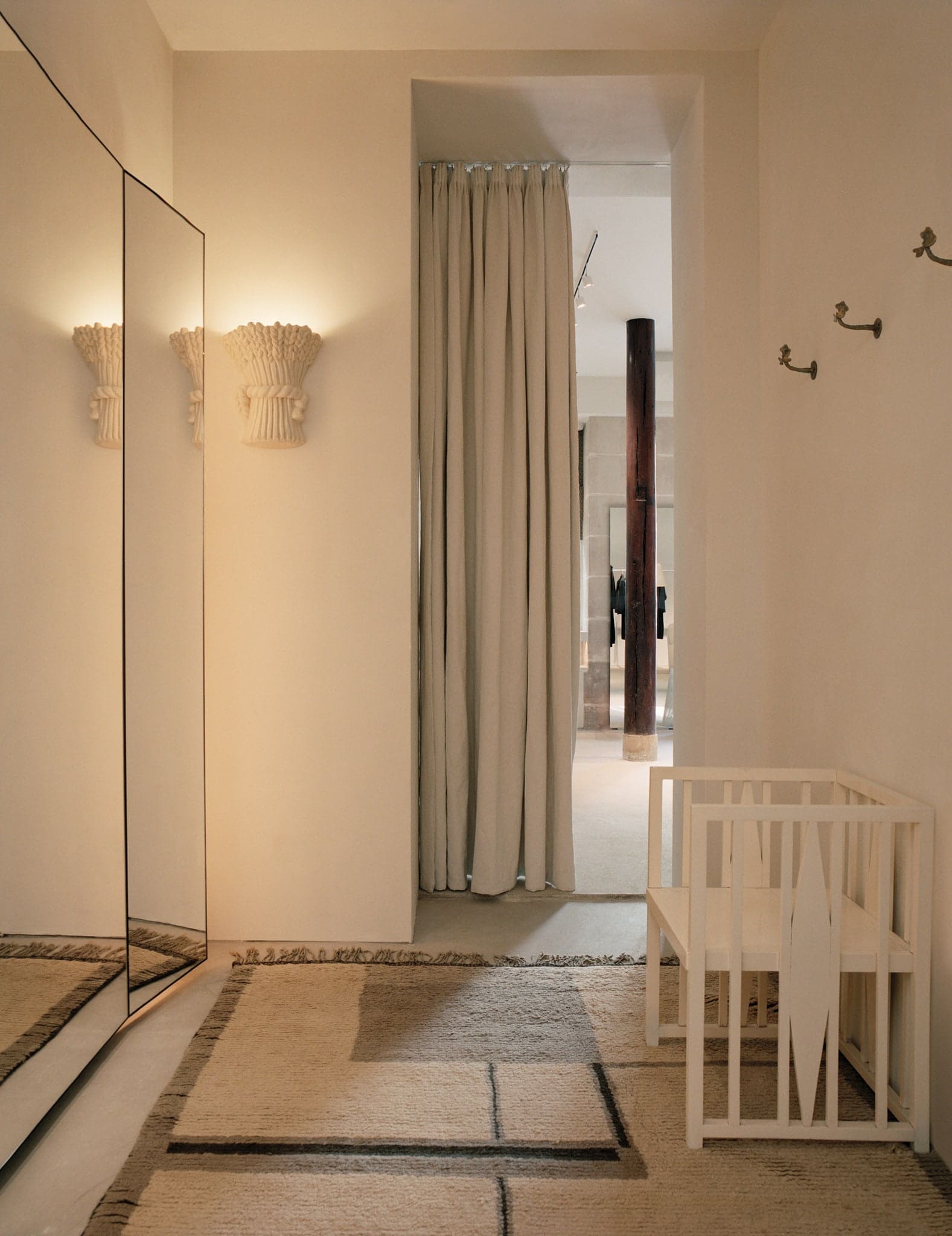 Mary-Kate opens a door of one of the changing rooms, and the three of us peek inside. It features an ivory lacquered cuboid chair by Koloman Moser and Wiener Werkstatte dating back to 1900 and a pair of 1940s white wheatsheaf sconces by Vadim Androusov. By the espresso bar—its handsome 1950s-style coffee machine crowned with small ceramic tumblers the sisters sourced from Commune in Los Angeles—is another changing room.