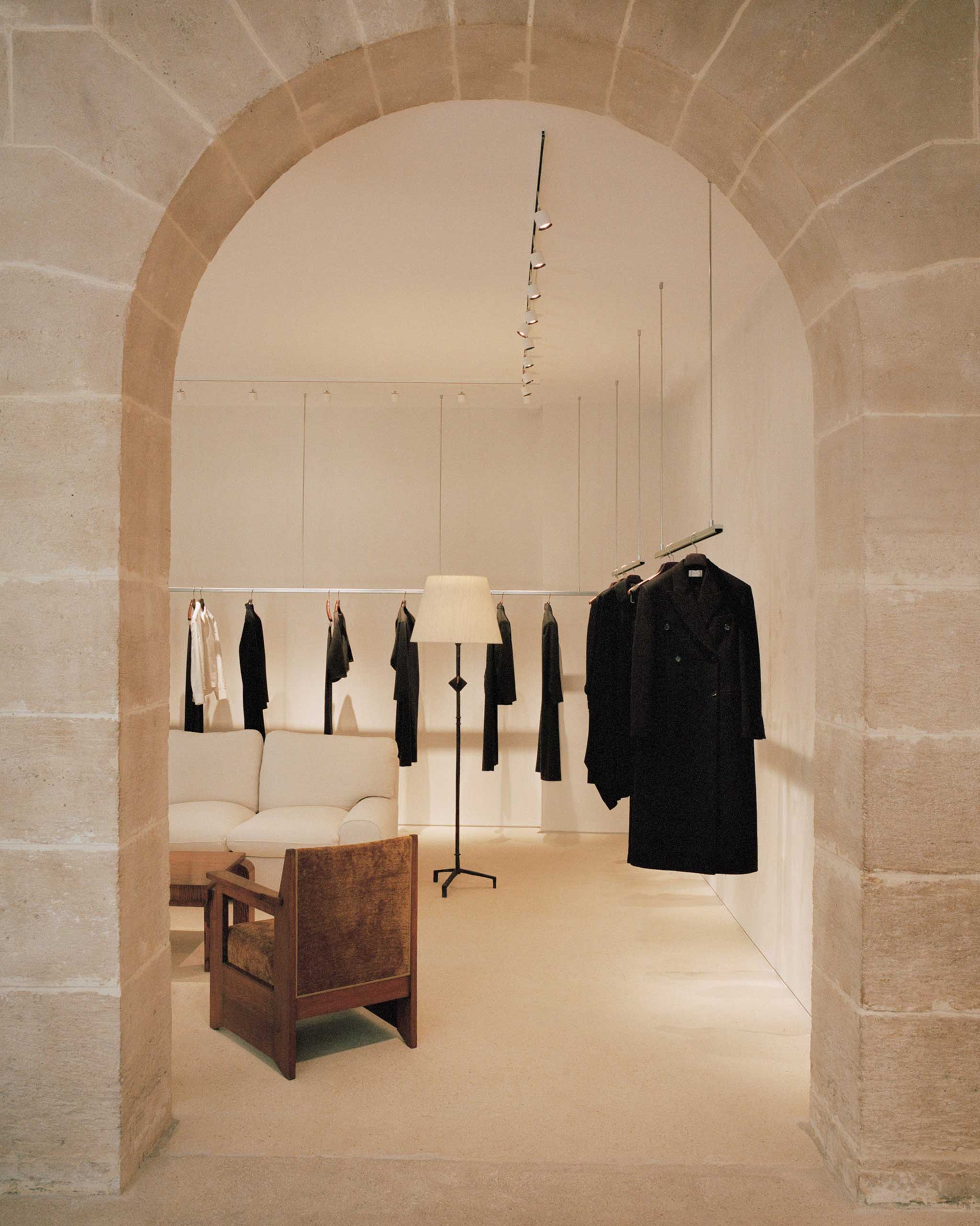 That’s evident from the way the disparate has been synthesized into the harmonious—by the exposed industrial piping, which is echoed by the tubular racks bearing their clothes; by the monumental yet quite rustic stonework arch, which leads further into the back of the store; by a back wall of stained glasses which had been, before the renovation, shamefully neglected by being covered up; and by the absolutely fantastic aged and weathered wooden pillar which rises from the floor to the ceiling and looks for all the world like it could have come from a Victorian schooner. (In one corner, mirroring it, is a somewhat newer addition: a columnar wooden plinth by furniture designer Marcel Coard.)