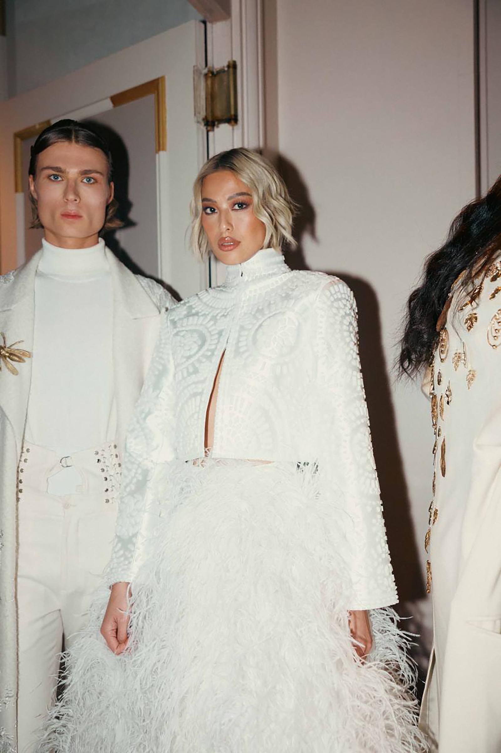 Sporting a new edgy blonde bob, Miss Universe Philippines 2023 Michelle Marquez Dee opened the show in a white beaded jacket paired with a feathered skirt. In an exclusive interview with Vogue Philippines, the model-actress shares all about her experience at the show.
